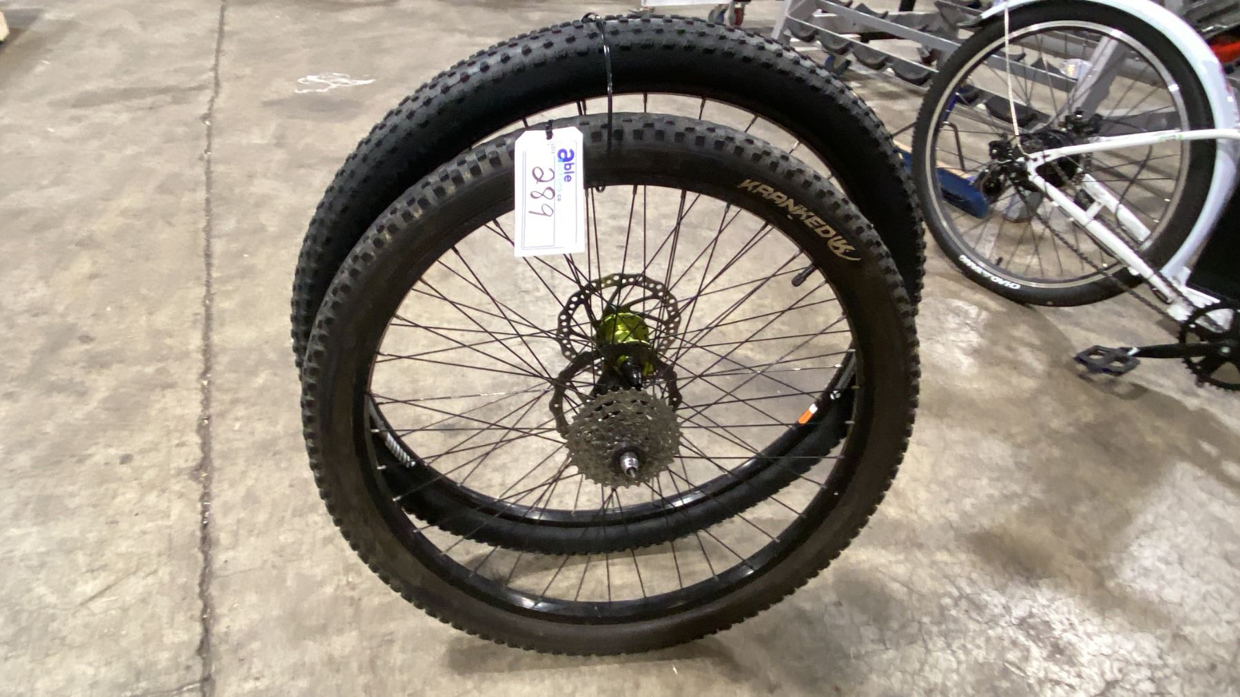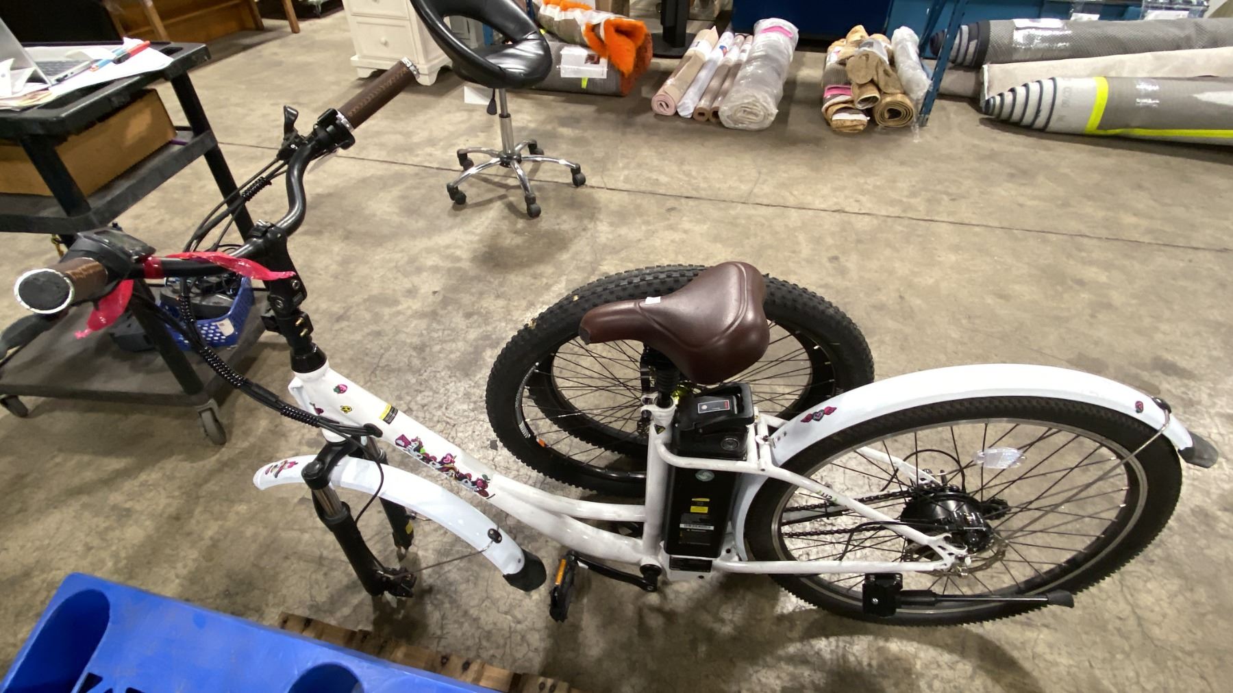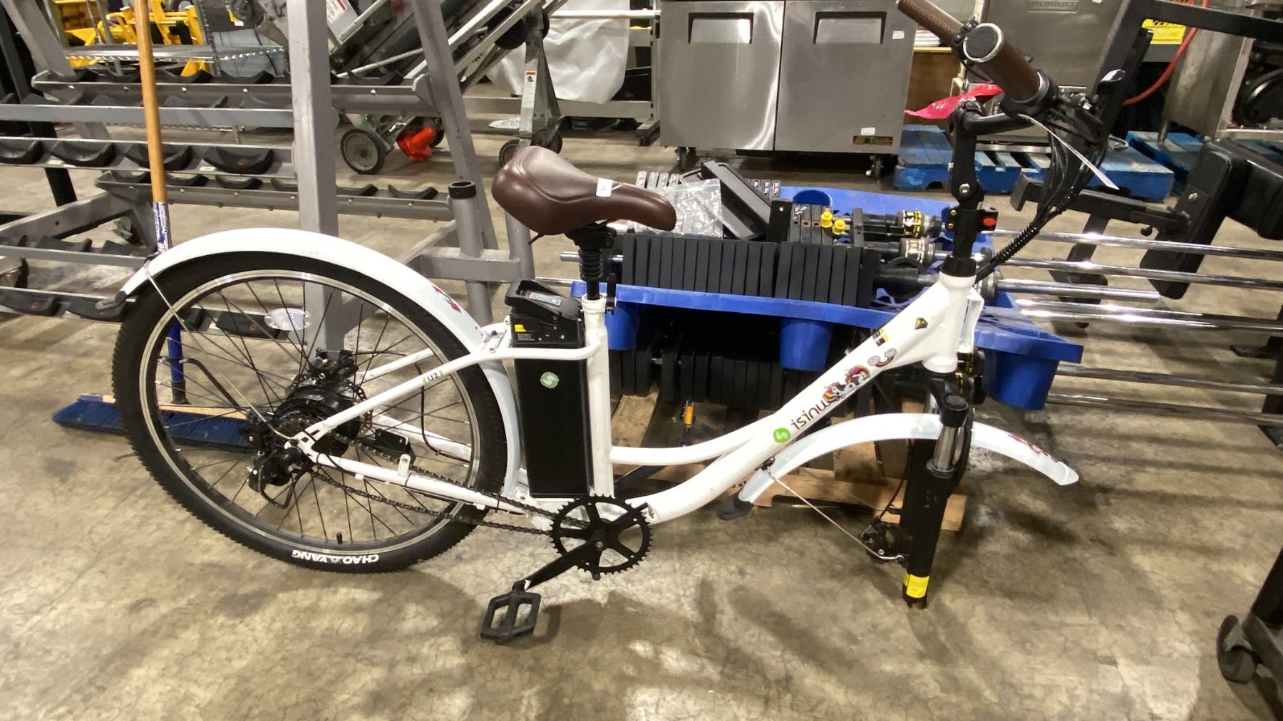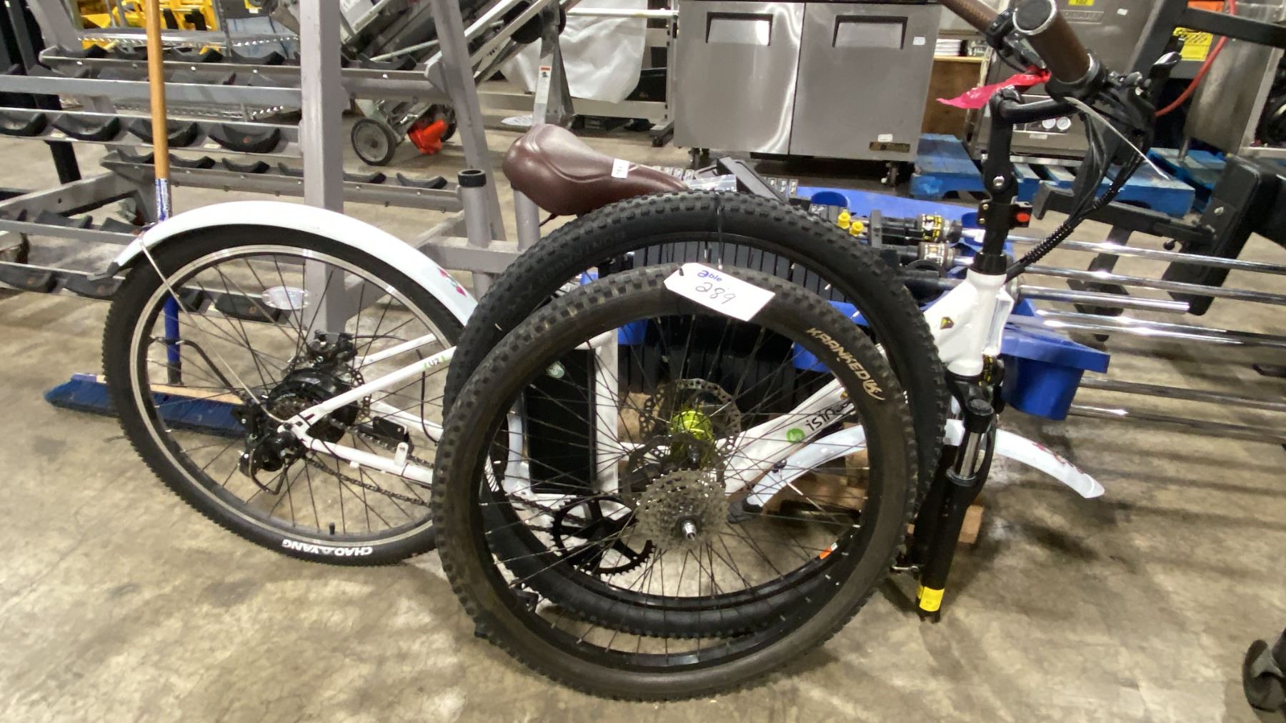 ISINWHEEL WHITE 7 SPEED FRONT SUSPENSION ELECTRIC BIKE WITH FULL DISC BRAKES *MISSING FRONT WHEEL NO KEY, NO CHARGER* & 2 BIKE WHEELS