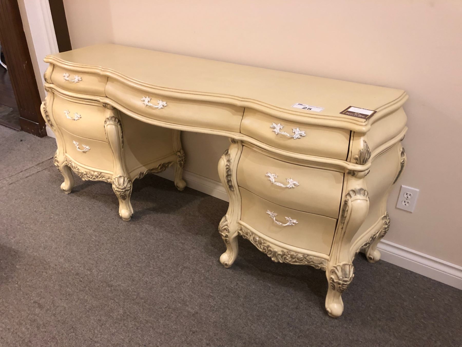 IVORY COLOURED ENTRANCE DESK WITH FROSTED HANDLES. RETAIL $3,350.00