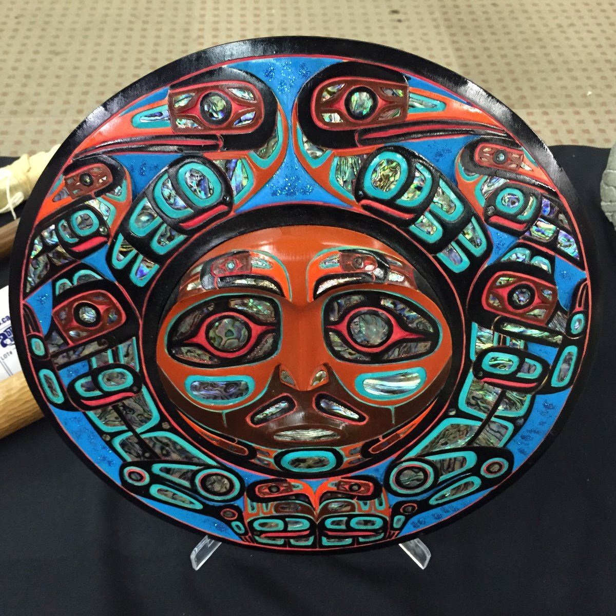JACOB B. LEWIS, COAST SALISH "ANIMALS SURROUNDING THE RISING SUN" 13" DIAMETER HEAVILY INLAID WITH ABALONE