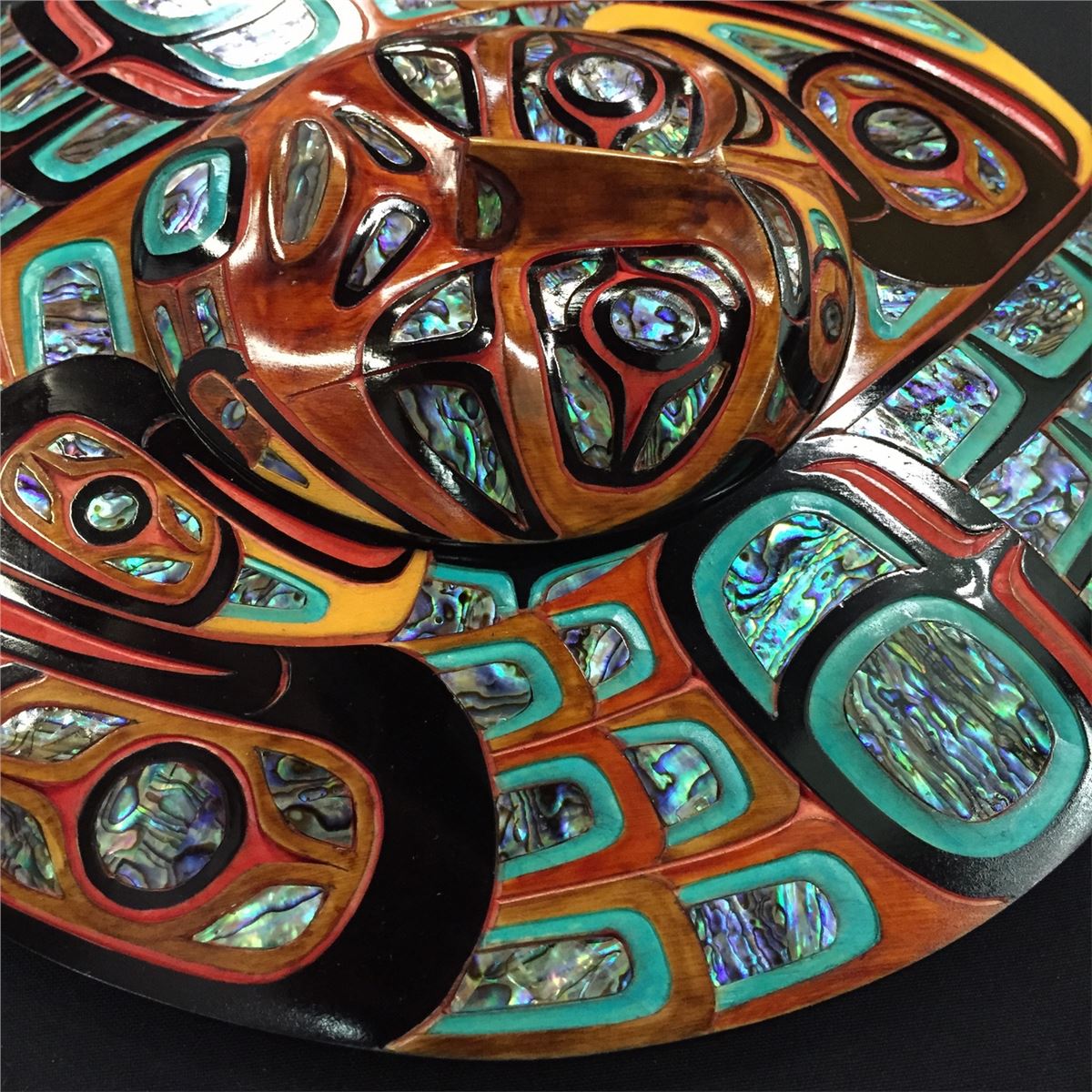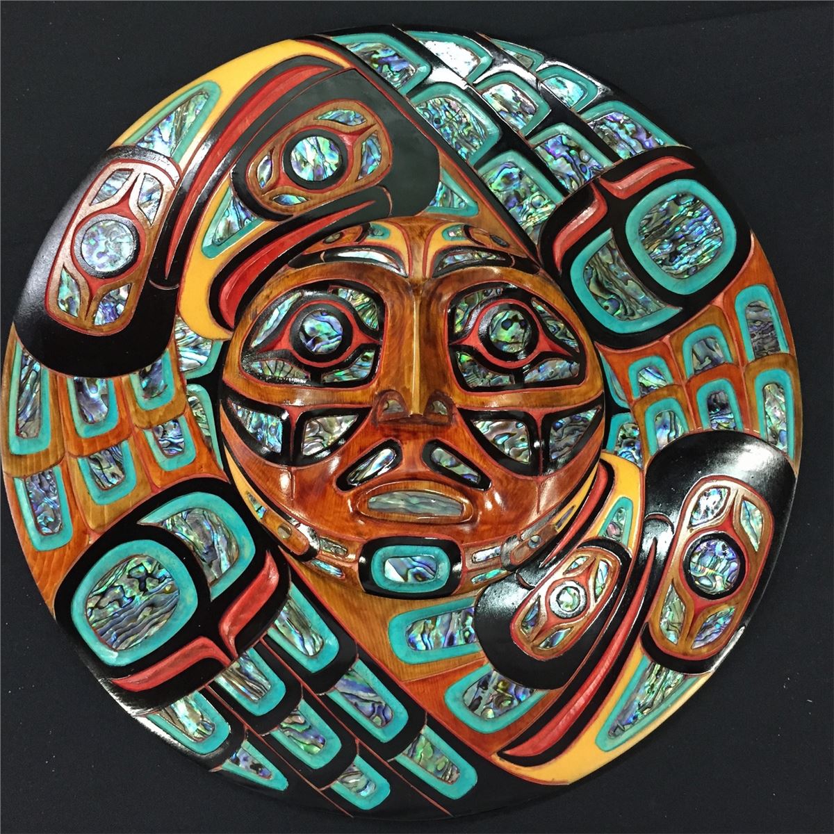 JACOB LEWIS, COAST SALISH "BIRDS SURROUNDING THE SUN ECLIPSE" HEAVILY INLAID WITH 102 ABALONE SHELLS 12" DIAMETER