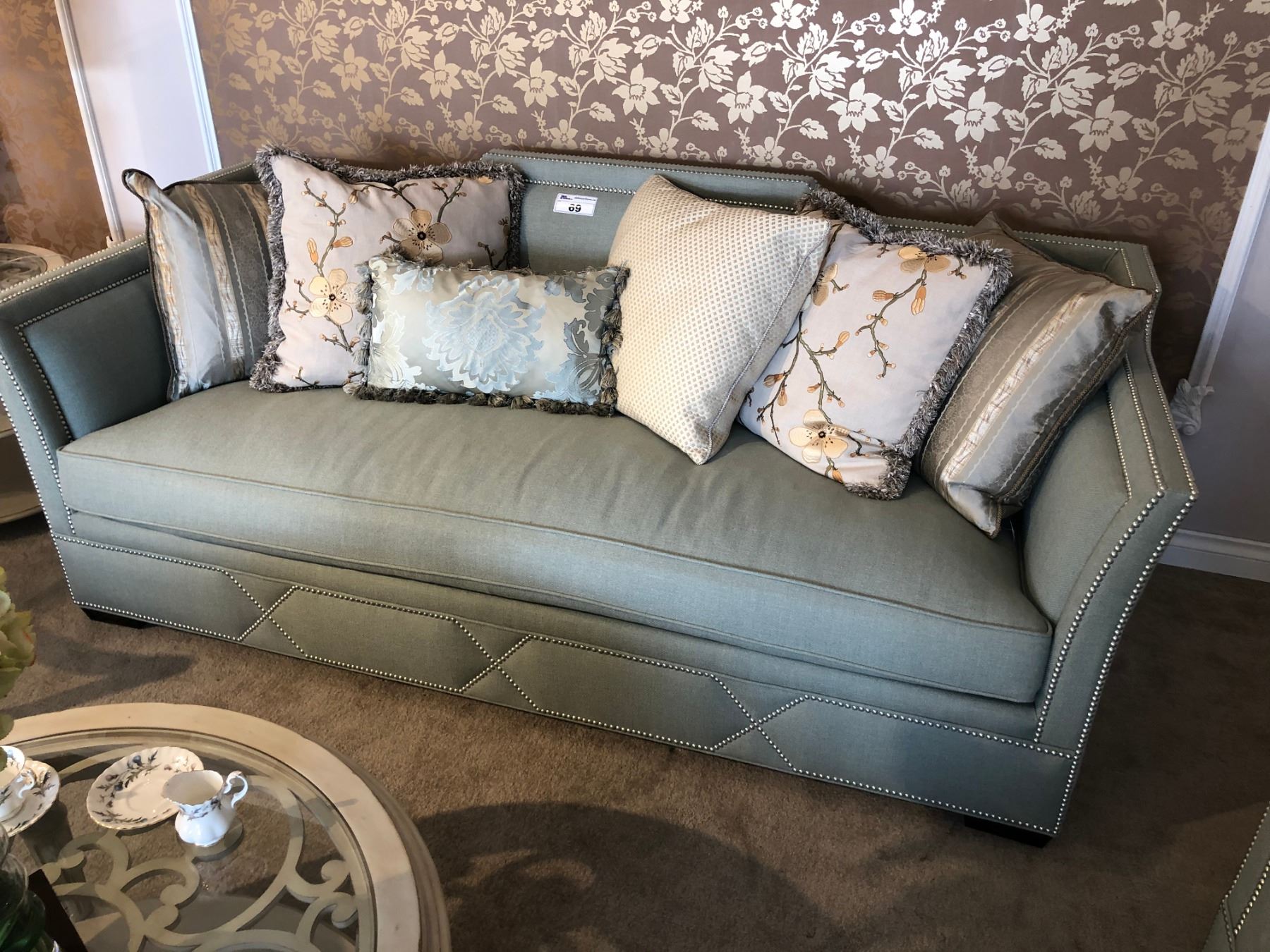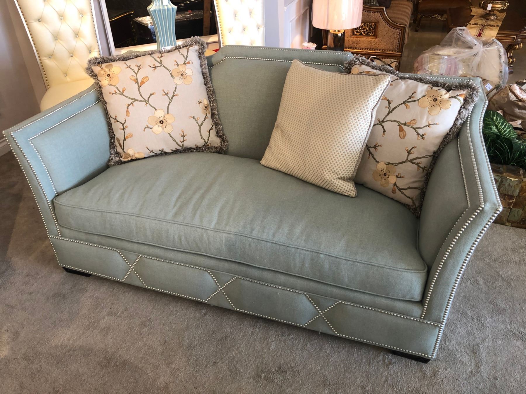 JADE COLOURED SOFA AND LOVE SEAT SET WITH THROW CUSHIONS. RETAIL $9,100.00