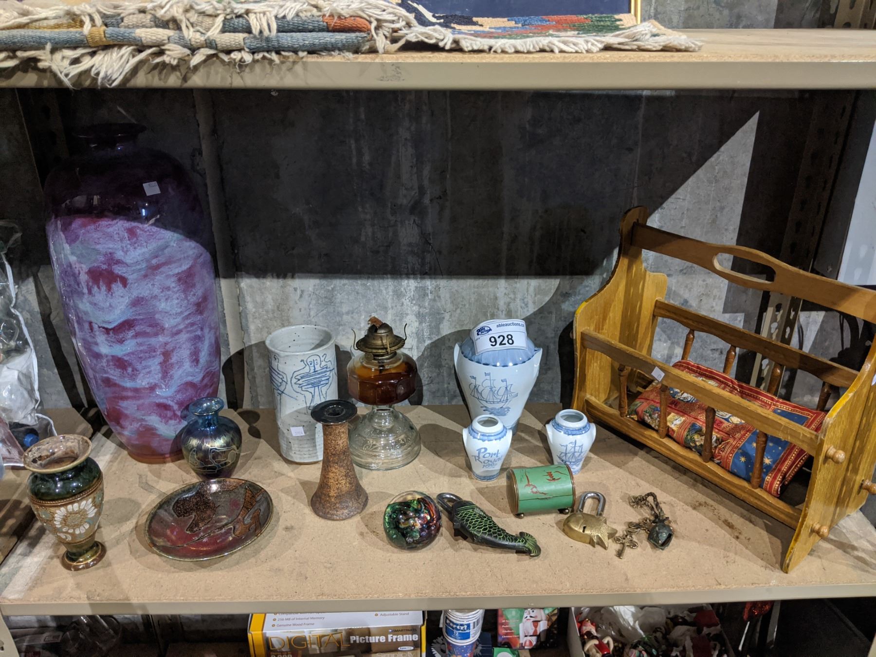 JAMAICAN PRINT POTTERY, FISH LOCKS, WOODEN PAPER RACK, OIL LAMP AND VASES