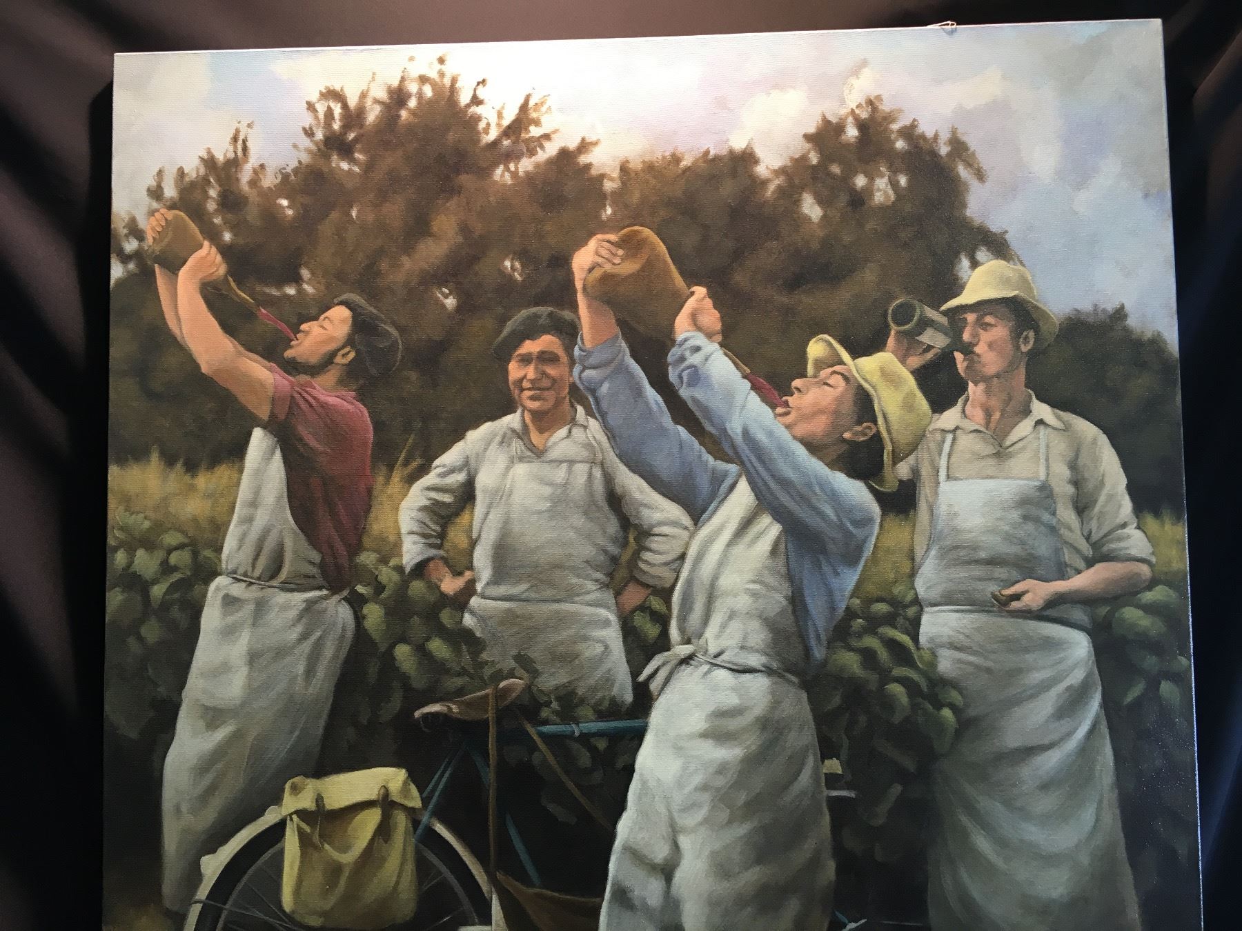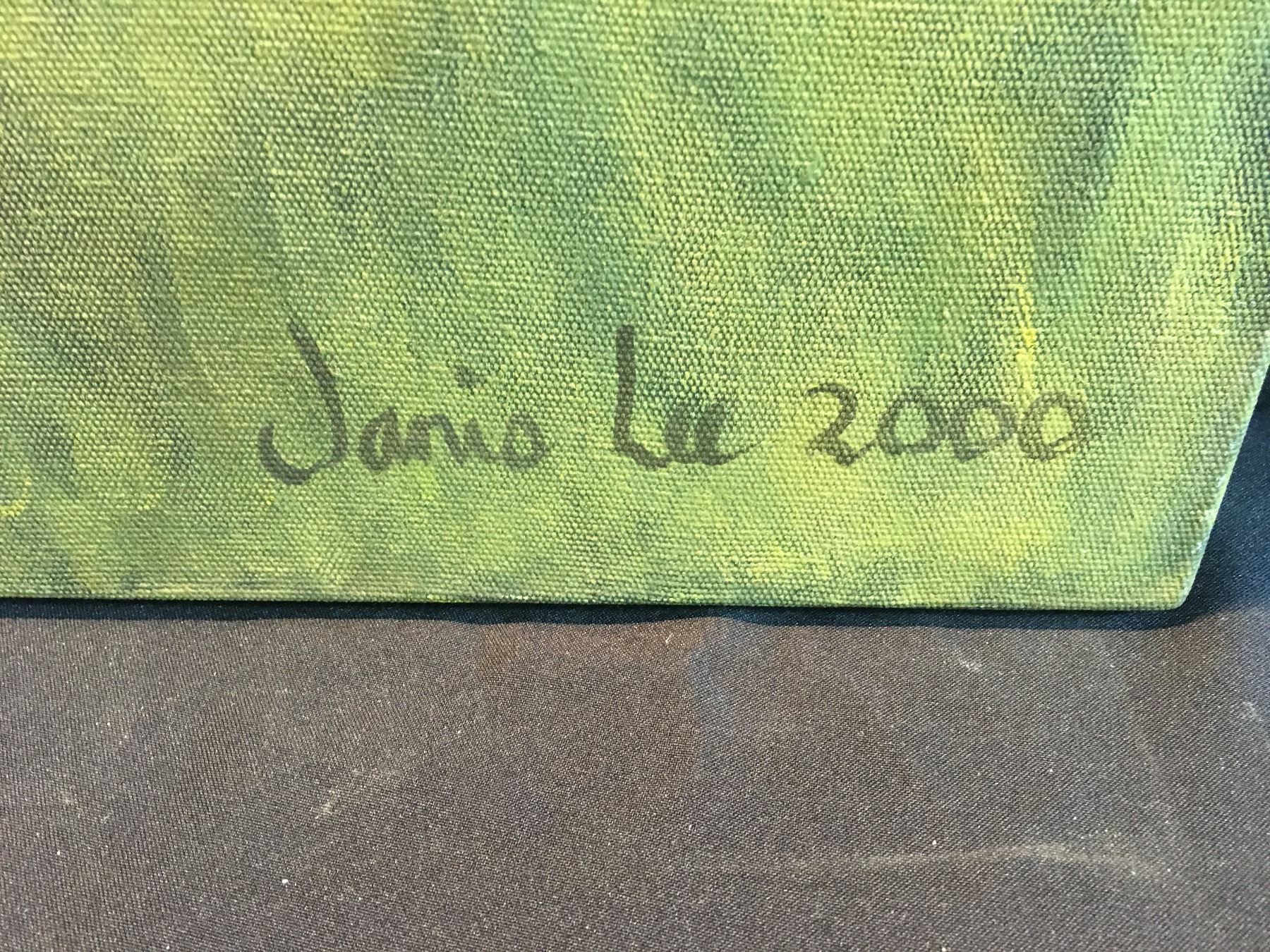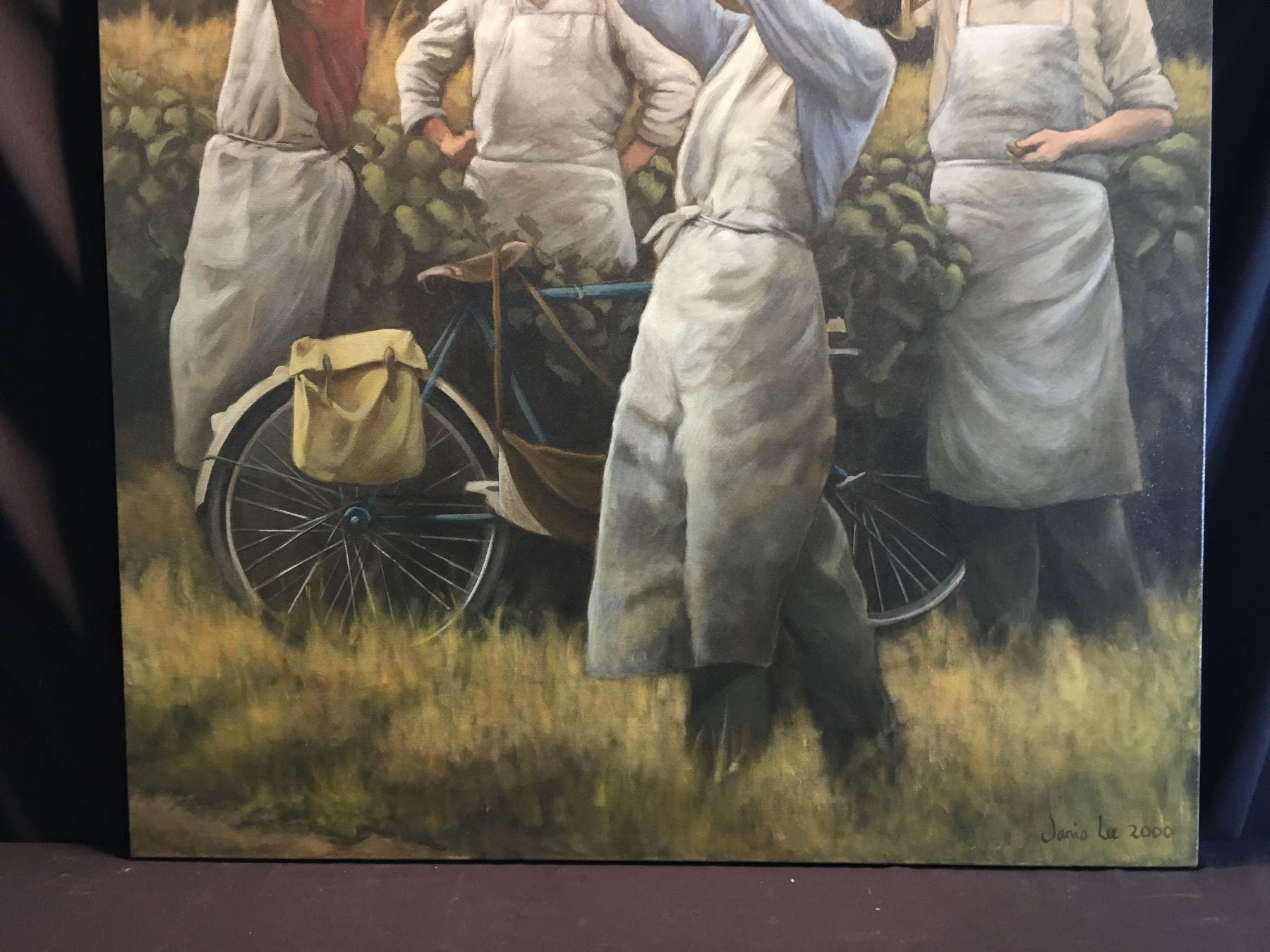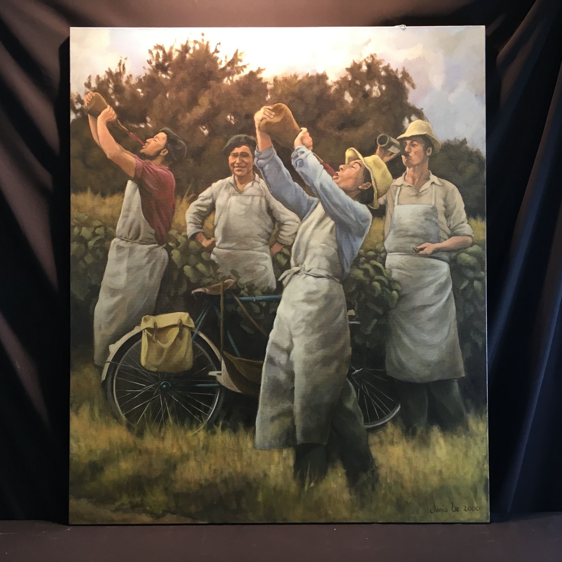 JANIS LEE, ORIGINAL OIL ON CANVAS PAINTING, UNTITLED, MEN IN A VINEYARD, 2000, SIGNED BY ARTIST ON