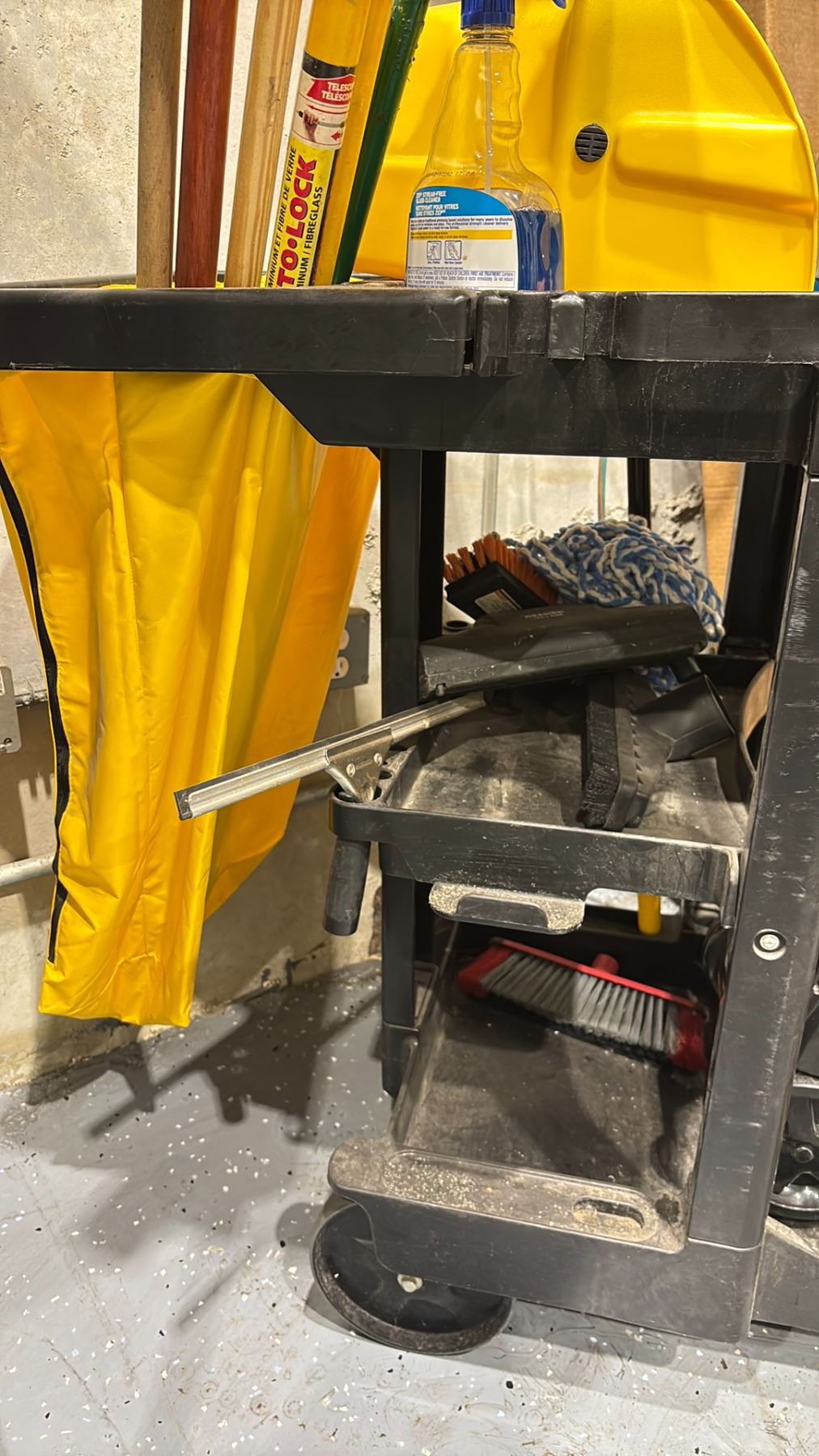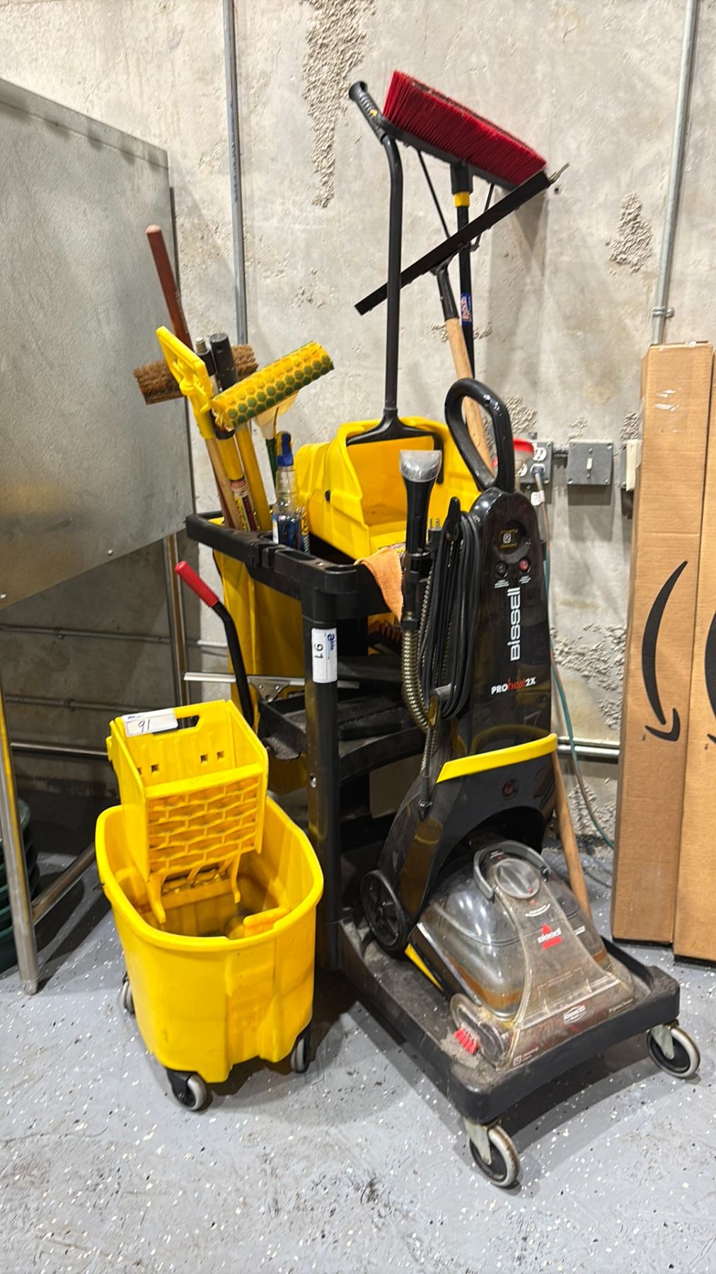 JANITORIAL CART WITH CONTENTS INCLUDING - BISSELL PROHEAT 2X STAND UP VACUUM, COMMERCIAL MOP BUCKET, MOPS, BROOMS & DUSTPAN