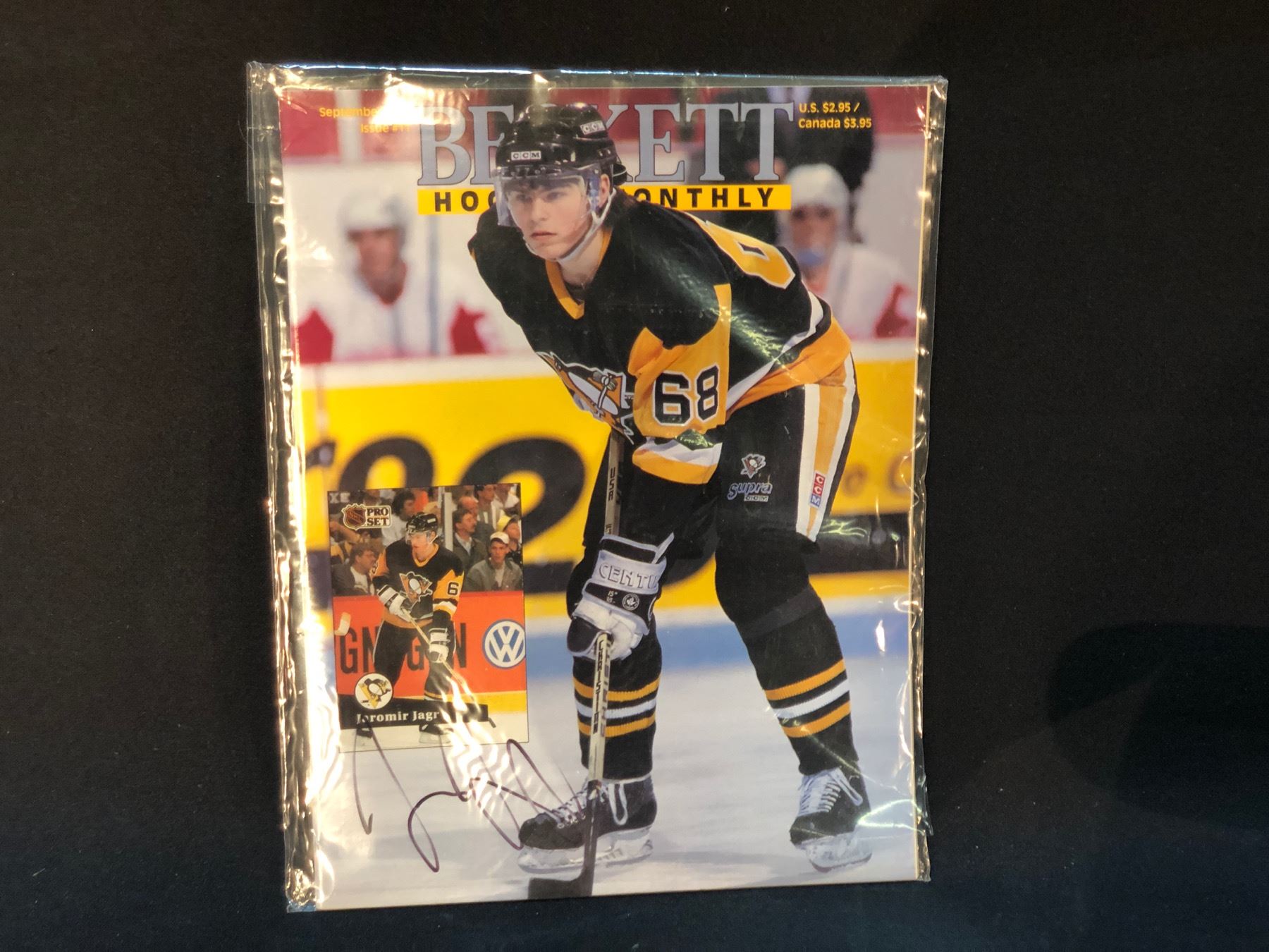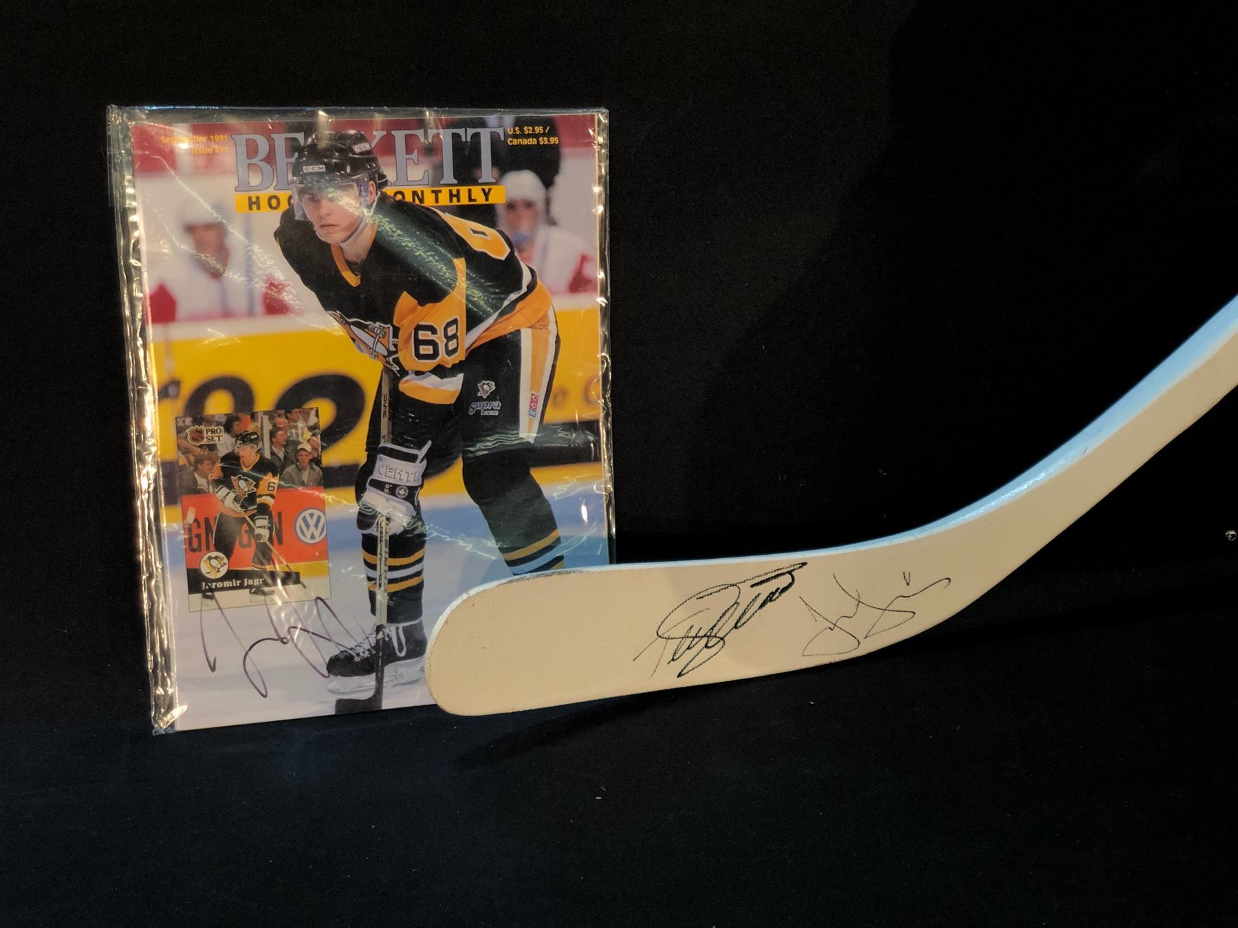 JAROMIR JAGR AND TEEMU SELANNE SIGNED HOCKEY STICK, AND JAROMIR JAGR SIGNED MAGAZINE
