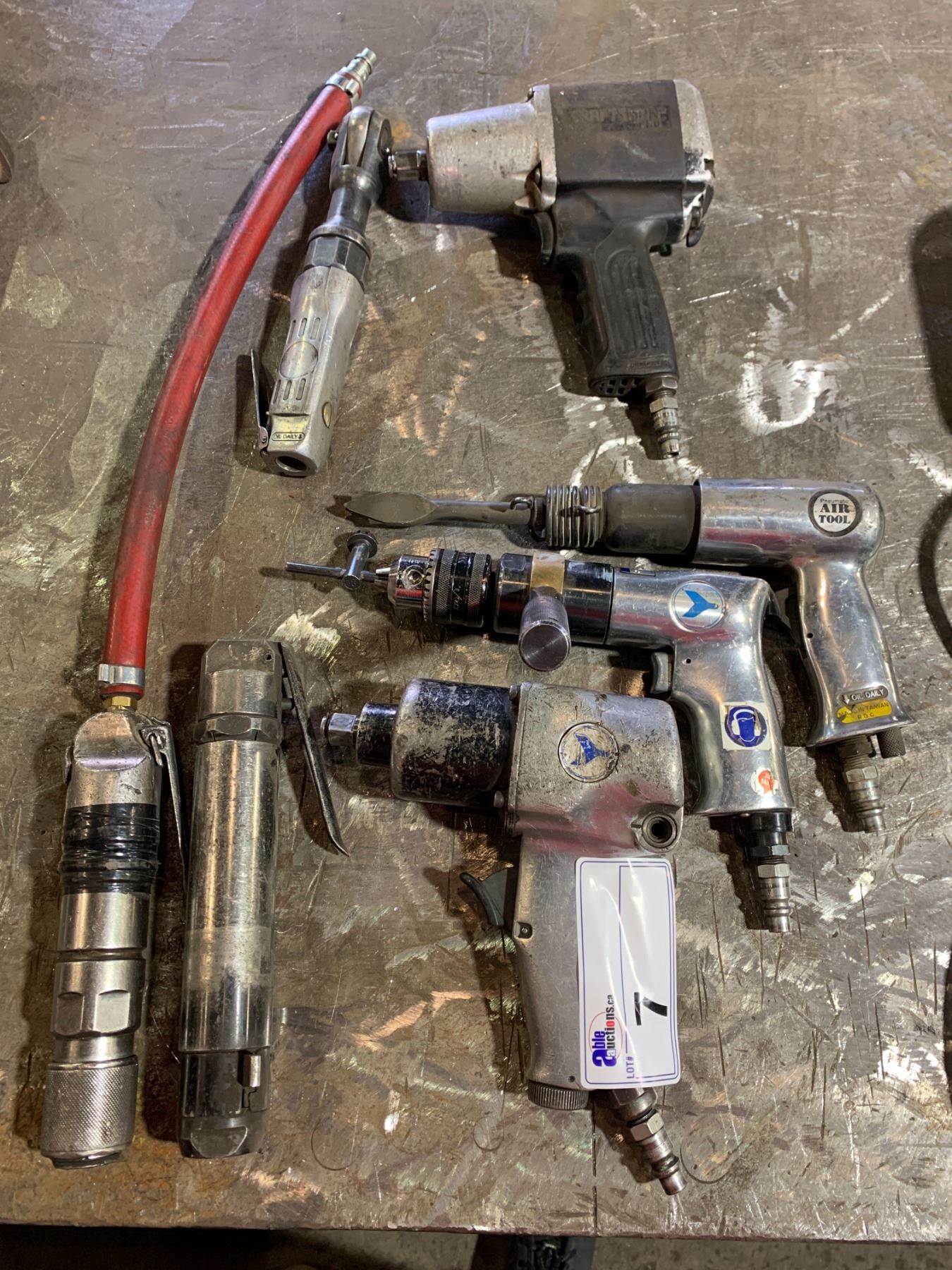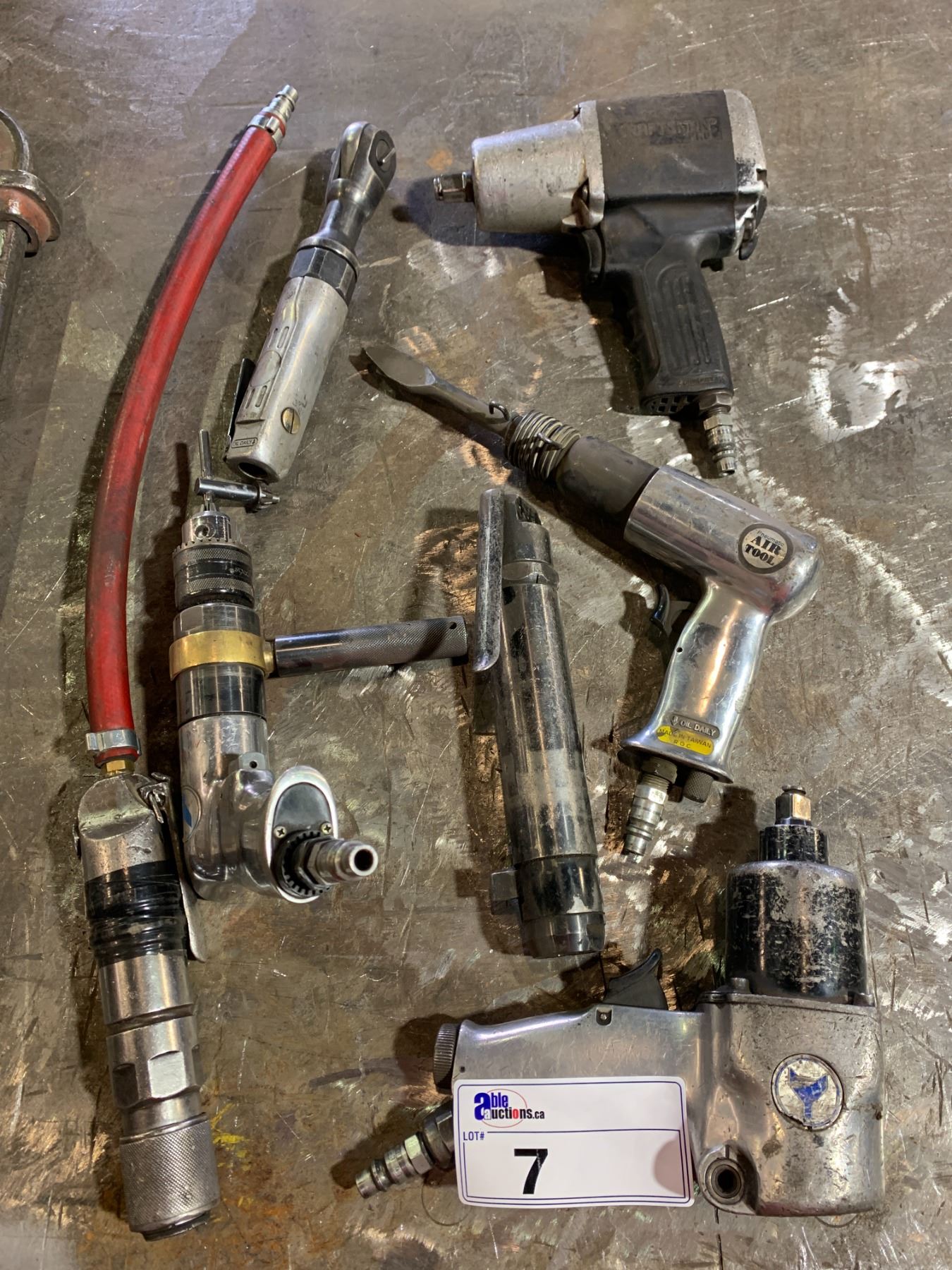 JET PNEUMATIC IMPACT GUN, JET PNEUMATIC ANGLE DRILL WITH HANDLE, AIR TOOLS PNEUMATIC CHIPPER, PNEUMATIC RATCHET, CRAFTSMAN PRO PNEUMATIC IMPACT GUN & 2 PNEUMATIC HAND CHISELS