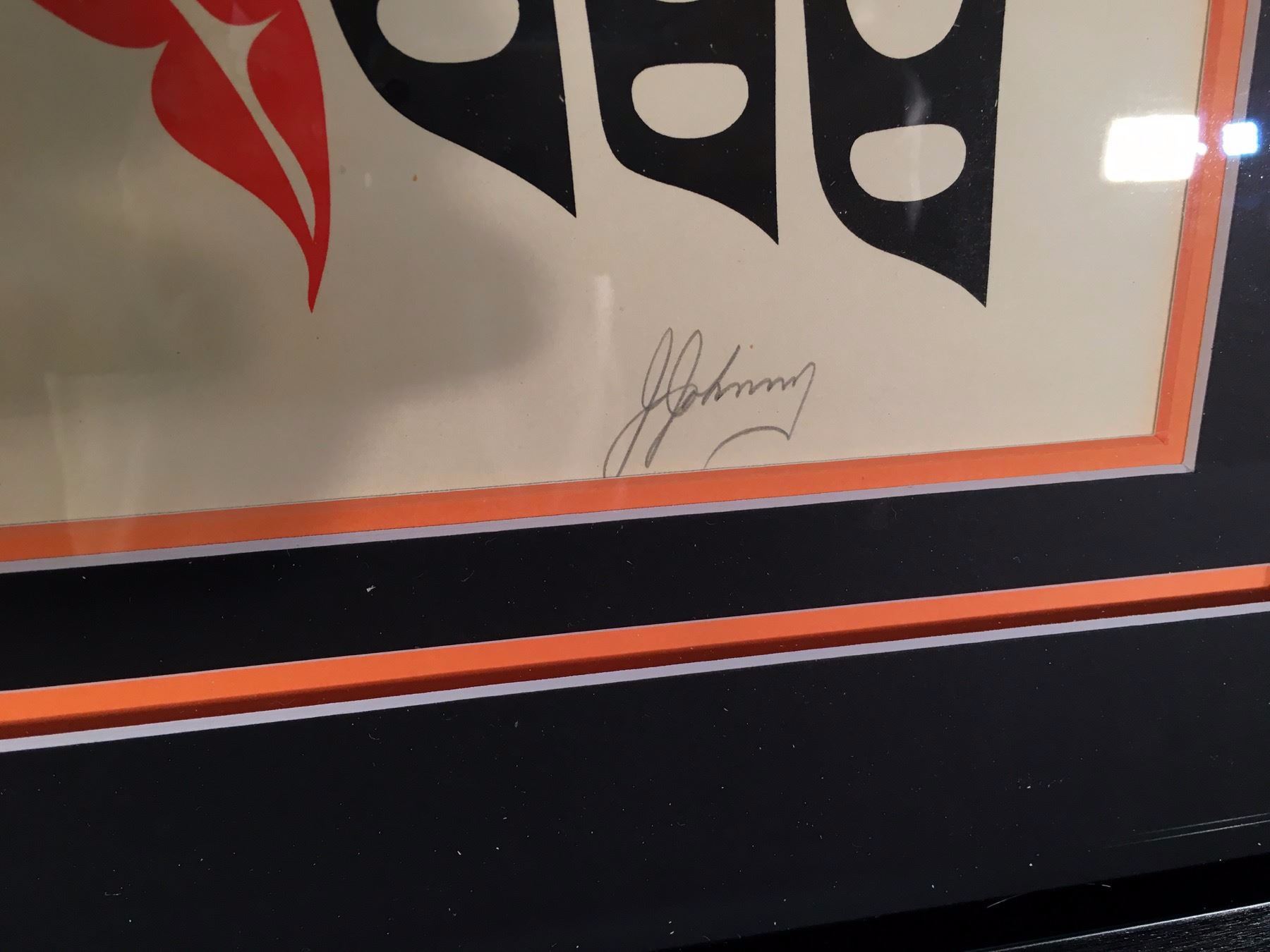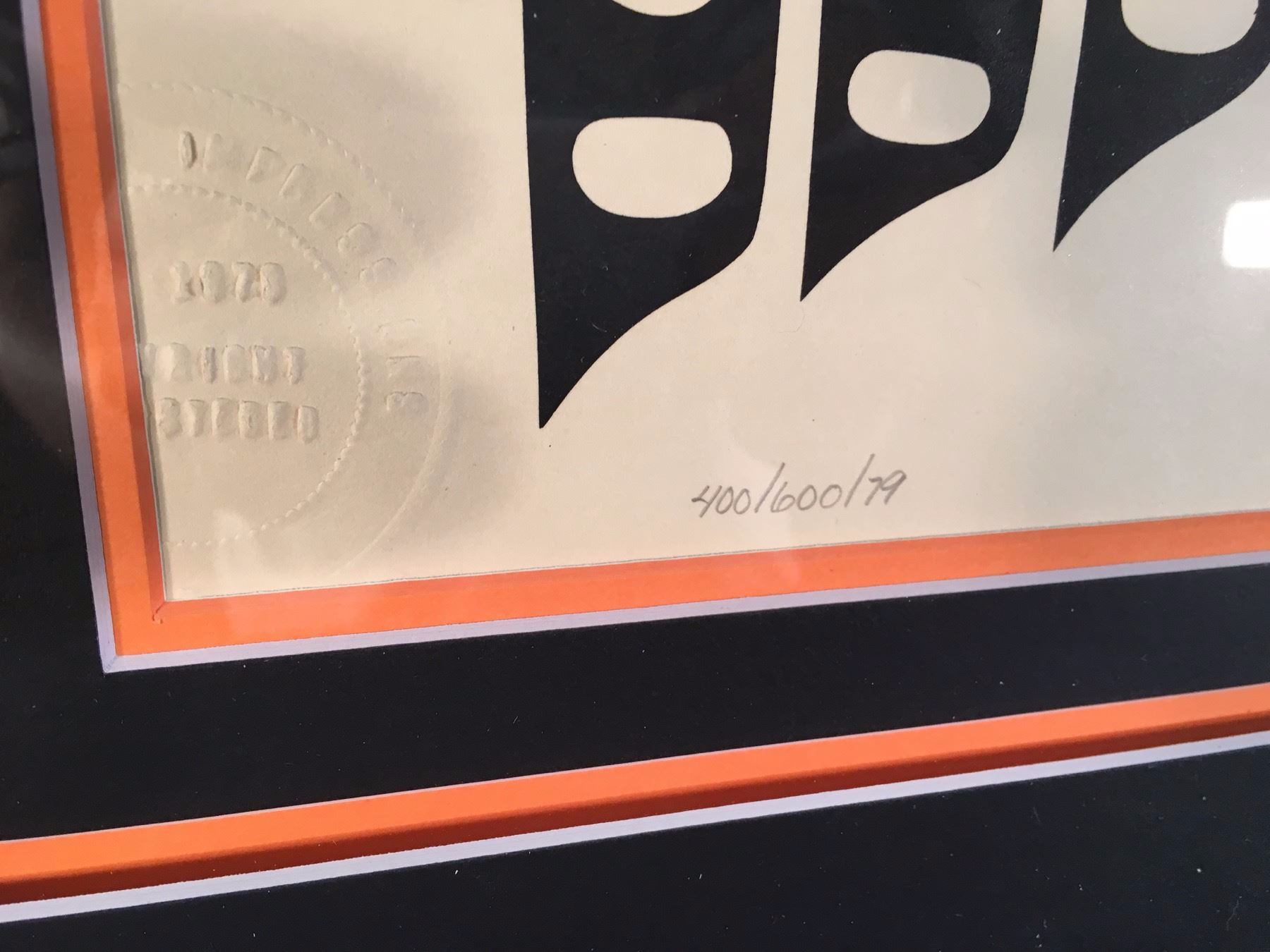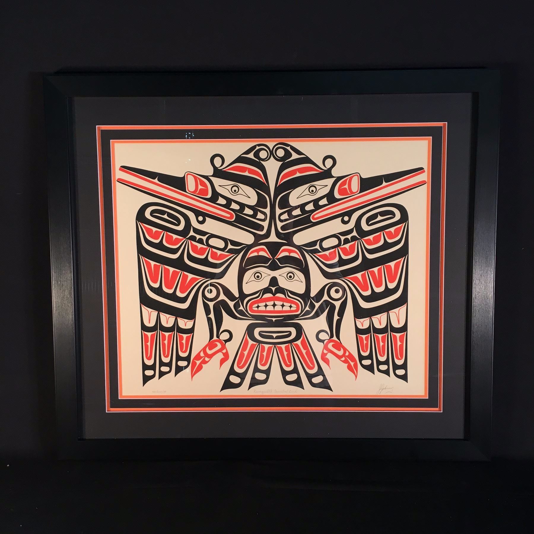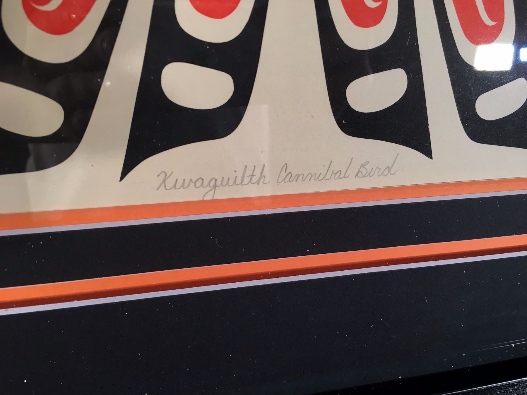 JIM JOHNNY, 1979 FRAMED LIMITED EDITION PRINT 400/600, KWAGIULTH CANNIBAL BIRD, WITH ARTIST BIO AND LIMITED EDITION PRINT INFORMATION, SIGNED BY ARTIST, LOWER RIGHT, 32'' SQUARE INC. FRAME