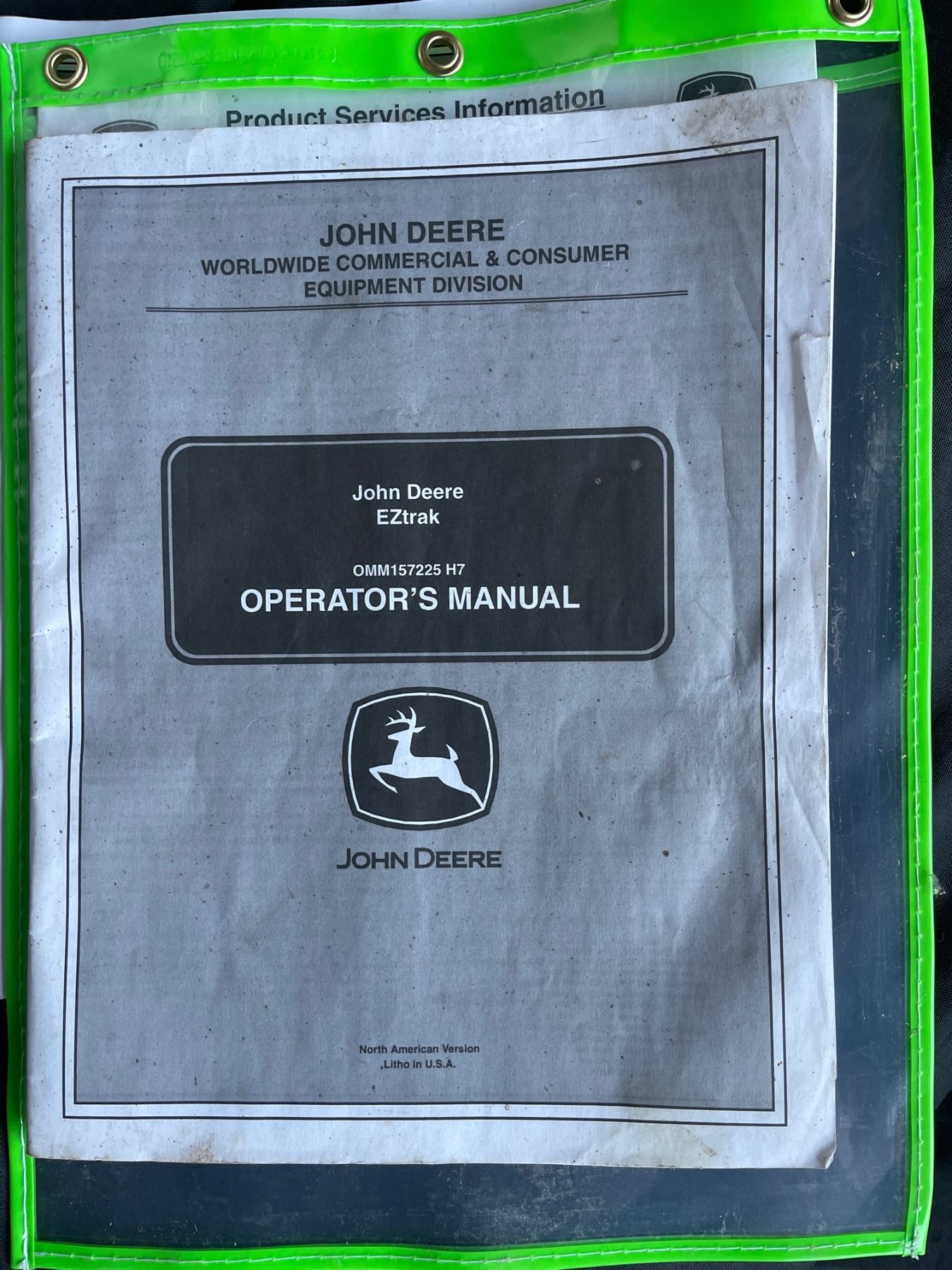 JOHN DEERE EX TRAK GAS POWERED 360 RIDE ON LAWN MOWER ( *HAS KEYS, HOUR METER READS 267 HRS, HRS NOT VERIFIED* ) INCLUDES MULCHING KIT, BAGGER KIT, AUXILIARY BELT DRIVEN GRASS BLOWER, OEM STORAGE COVER, EXTRA BELTS AND BATTERY CHARGER