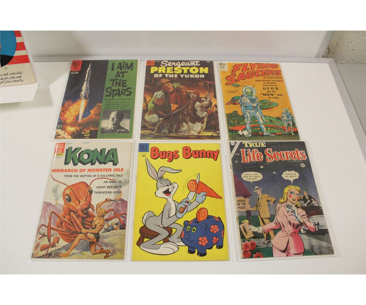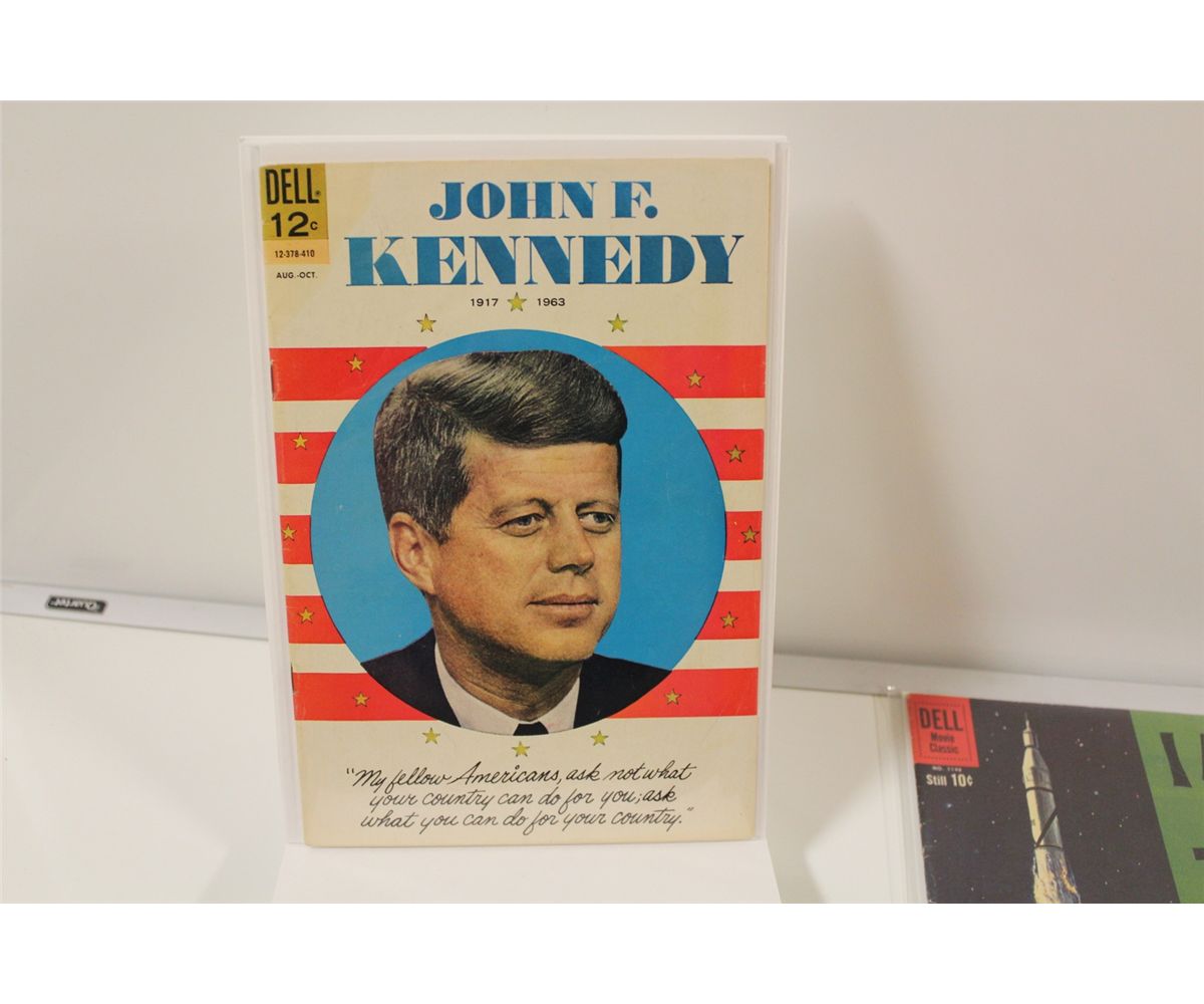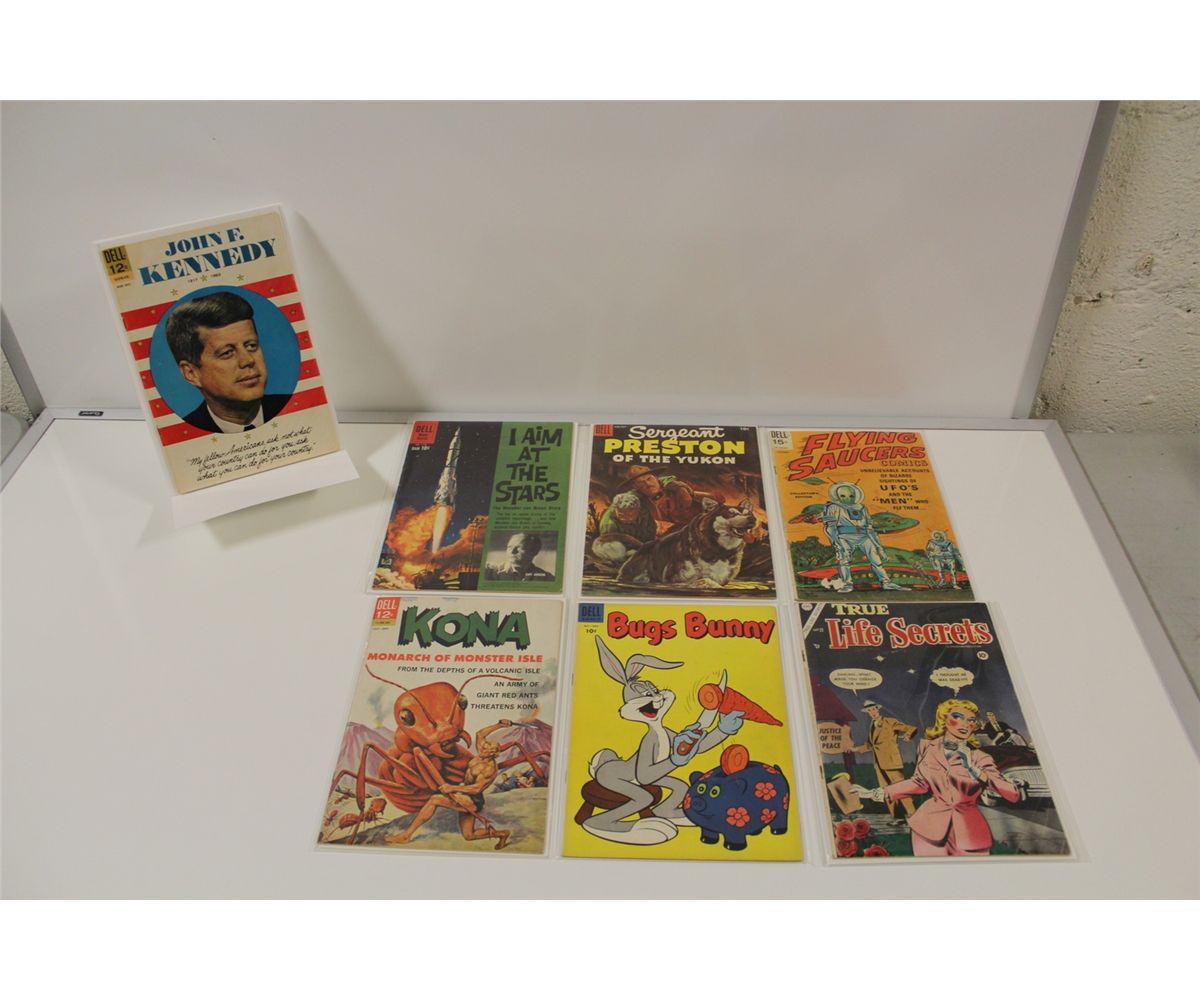 JOHN F. KENNEDY (1964) ONE SHOT DELL COMIC IN SOLID MID GRADE PLUS 6 OTHER ASSORTED DELL COMIC TITLES, ALSO IN MID GRADE. INCLUDES TRUE LIFE SECRETS #22, BUGS BUNNY #39 (1954) KONA #7, SERGENT PRESTON #16, I AIM AT THE STARS NO. 1148