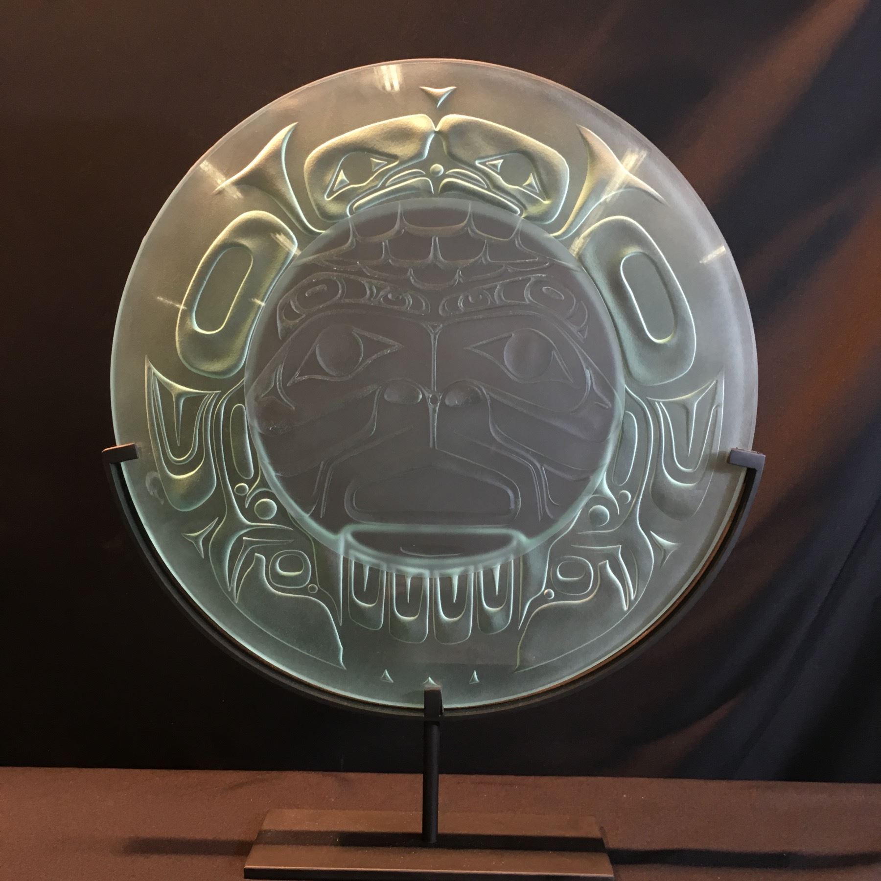 JOHN NUTTER, "BIRTH OF THE TSIMSHIAN NATION" ETCHED ROUND GLASS PANEL ON METAL BASE, DESIGN BY TSIMSHIAN ARTIST TERRY STARR, 20'' WIDE