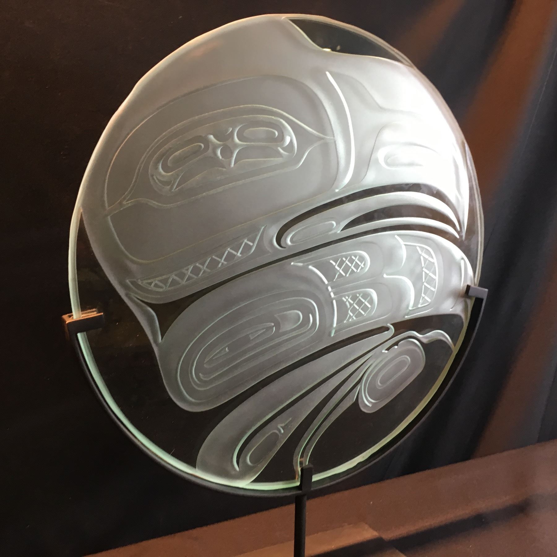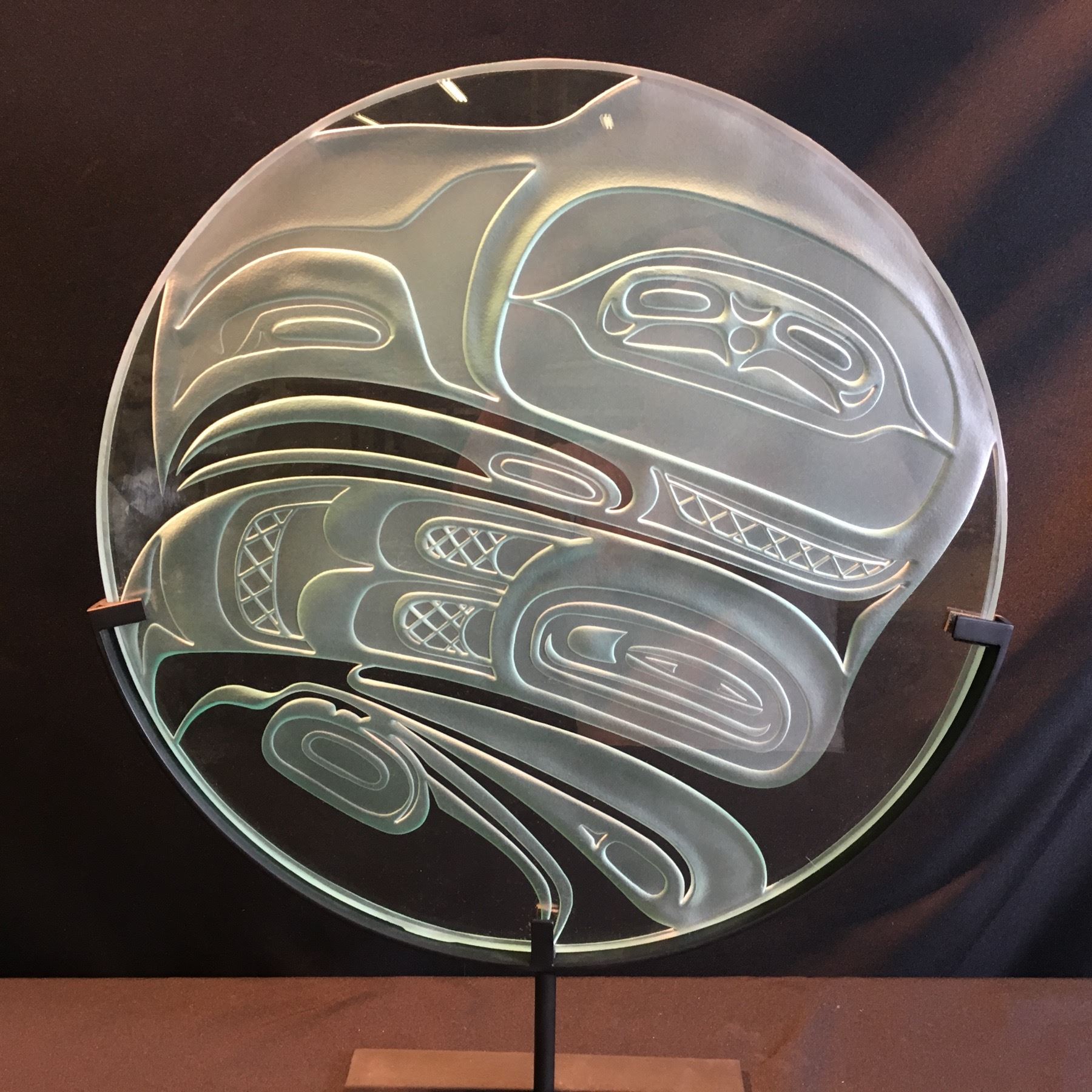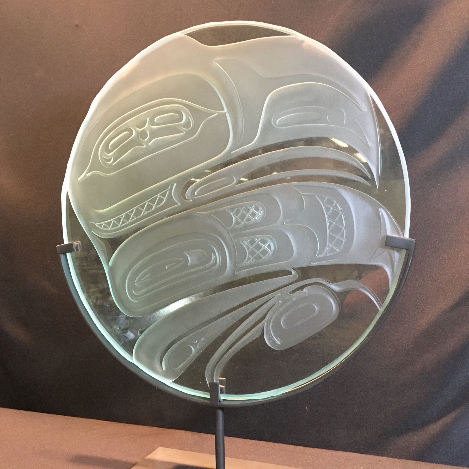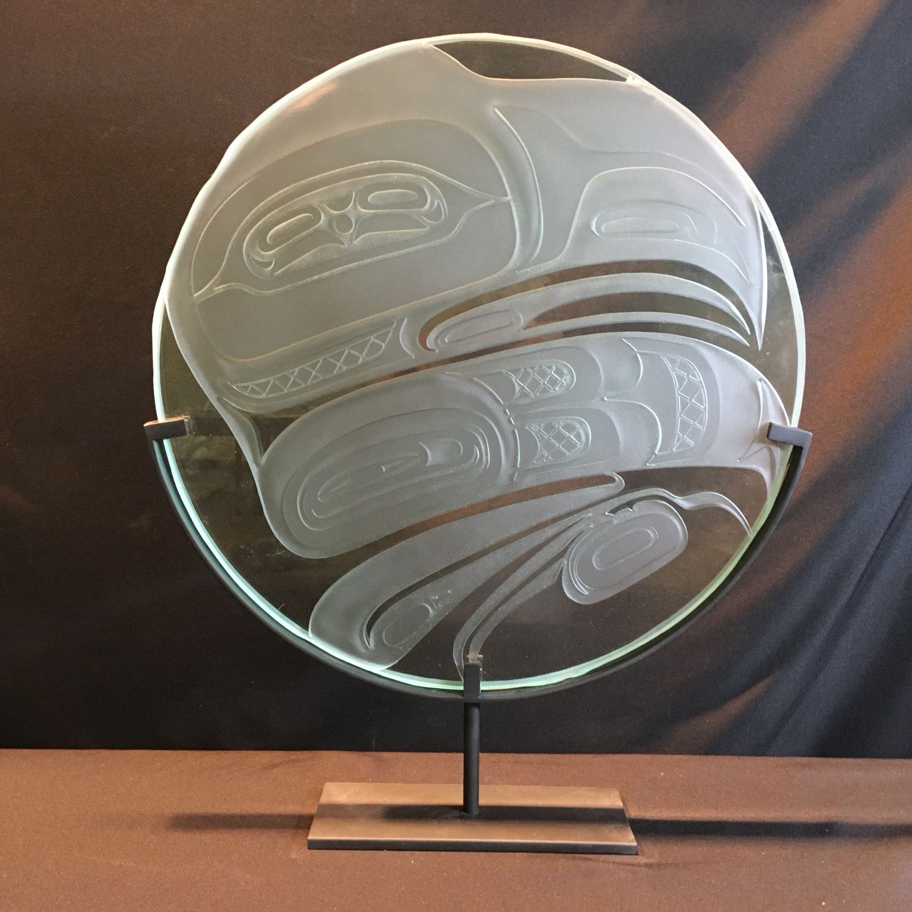JOHN NUTTER, RAVEN TRANSFORMATION DESIGN, ETCHED ROUND GLASS PANEL ON METAL BASE, 20'' WIDE