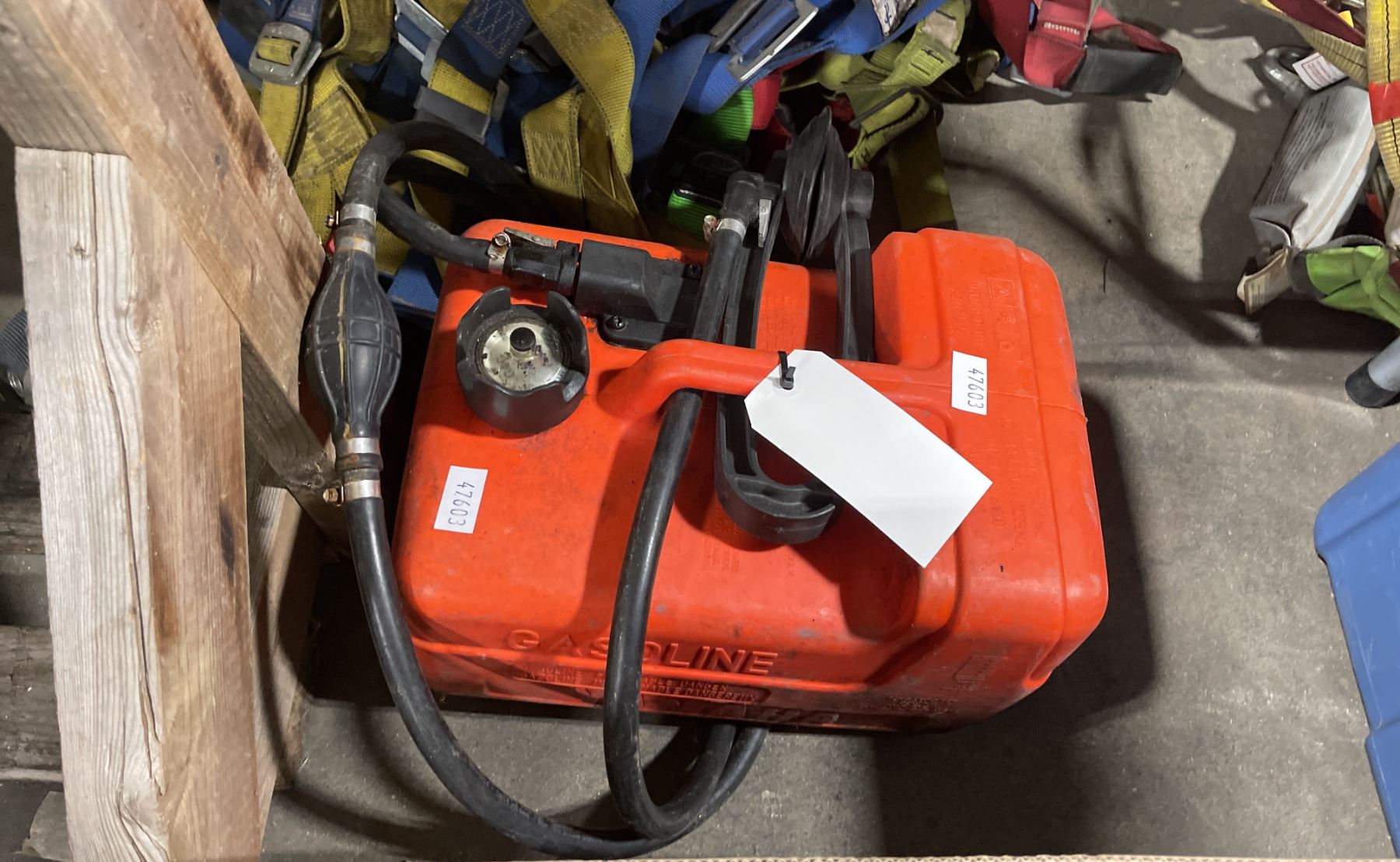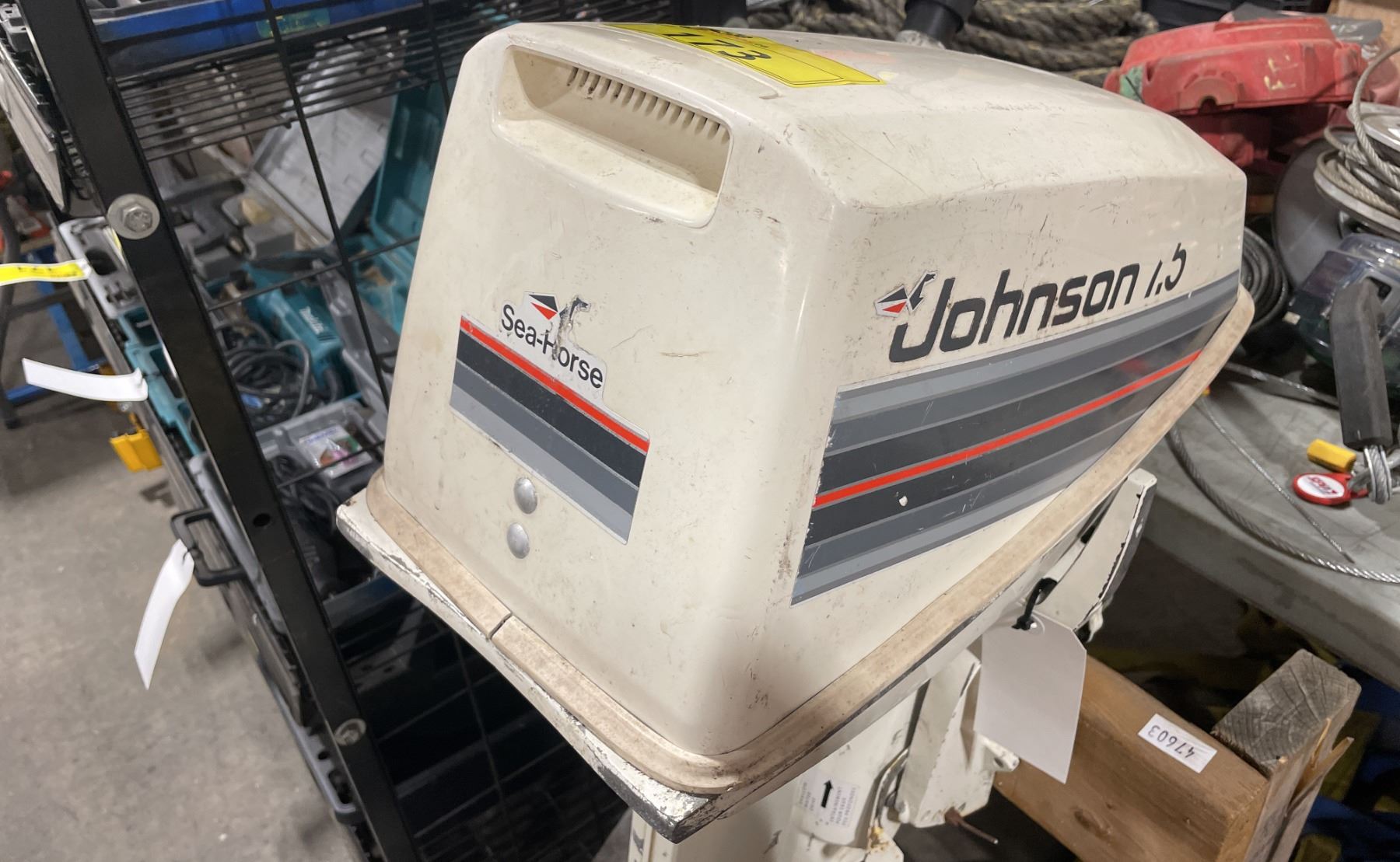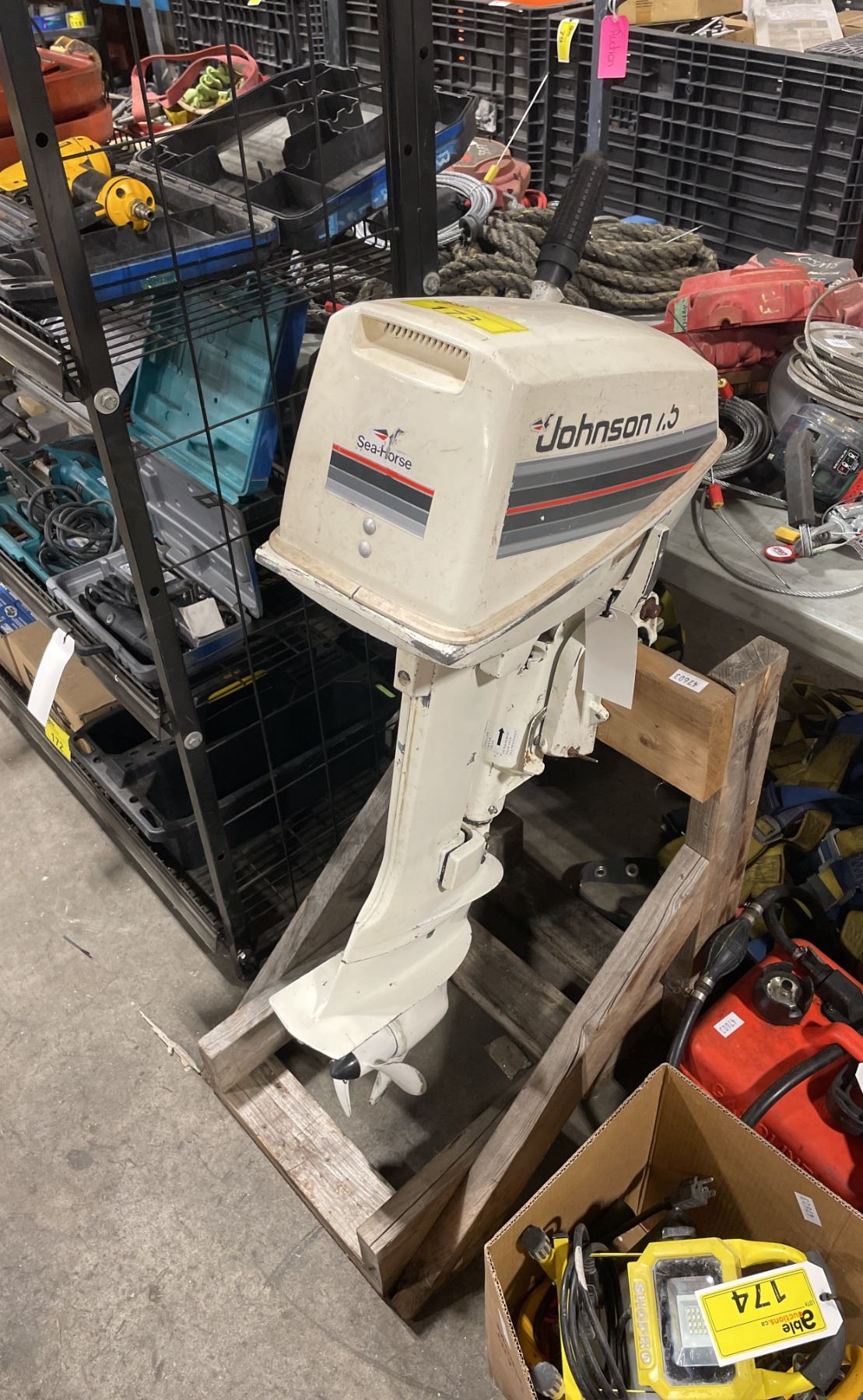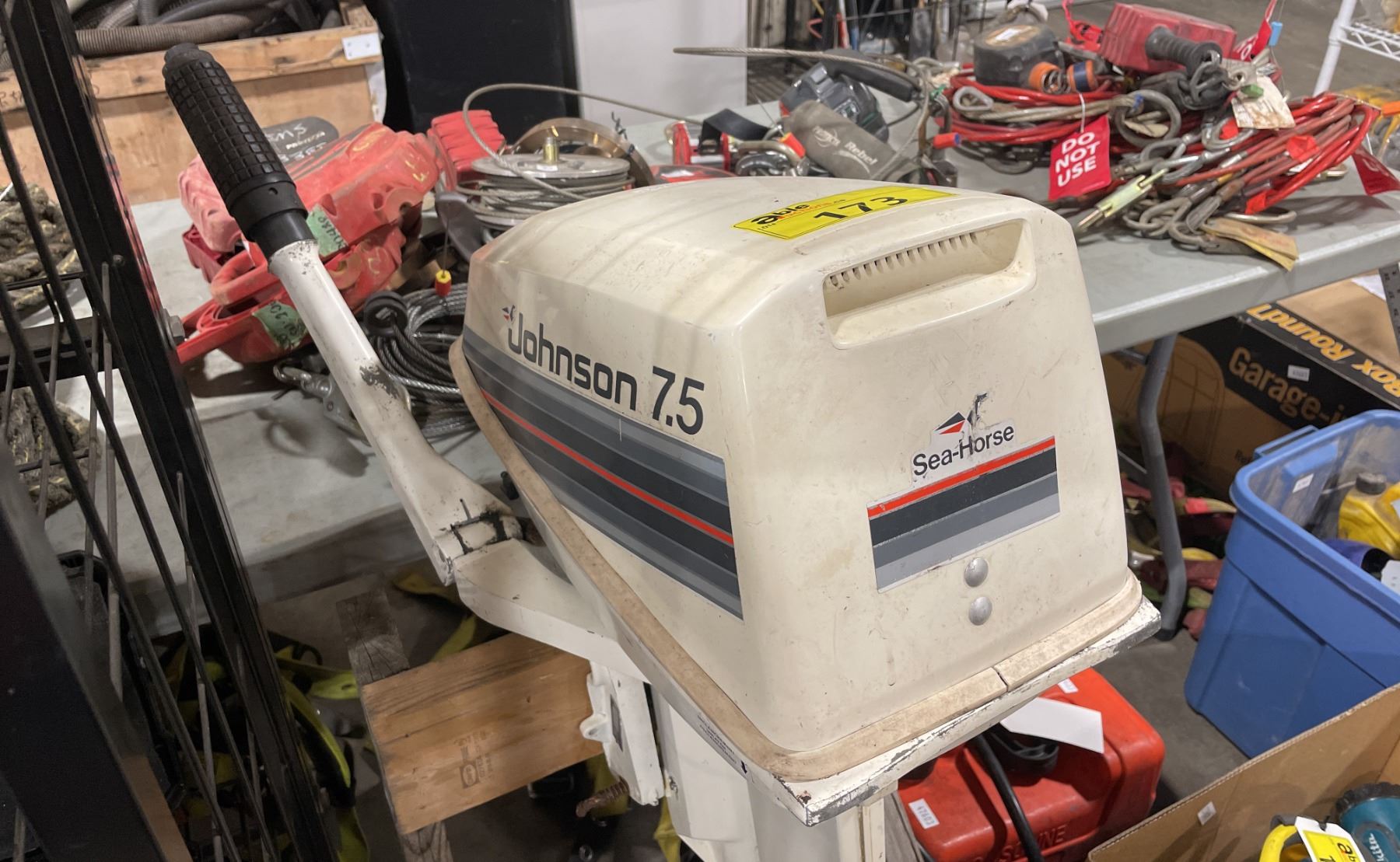 JOHNSON 7.5 SEA-HORSE GAS POWERED OUTBOARD MOTOR WITH TILLER ARM & SMALL RED MARINE GAS CAN