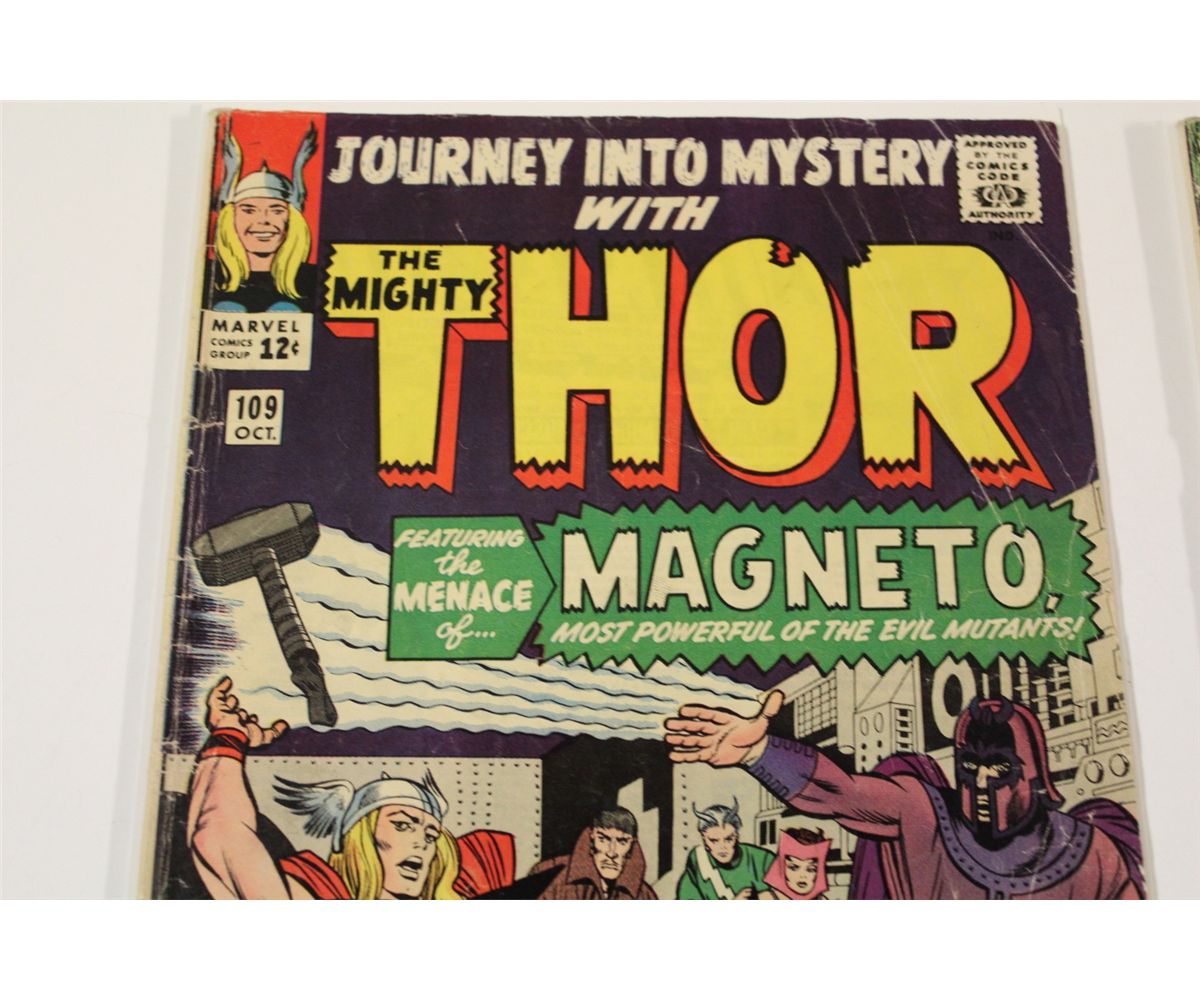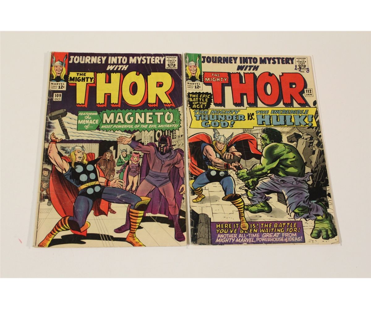 JOURNEY INTO MYSTERY #109 & 112 (1964-65) 2 KEY ISSUES WITH CLASSIC COVERS - #109 - 1ST MAGNETO X-OVER, #112 - THOR VS. HULK, ORIGIN LOKI. BOTH ARE SOLID LOWER MID GRADE COPIES, GLOSSY, TIGHT & SUPPLE. NICE BOOKS!