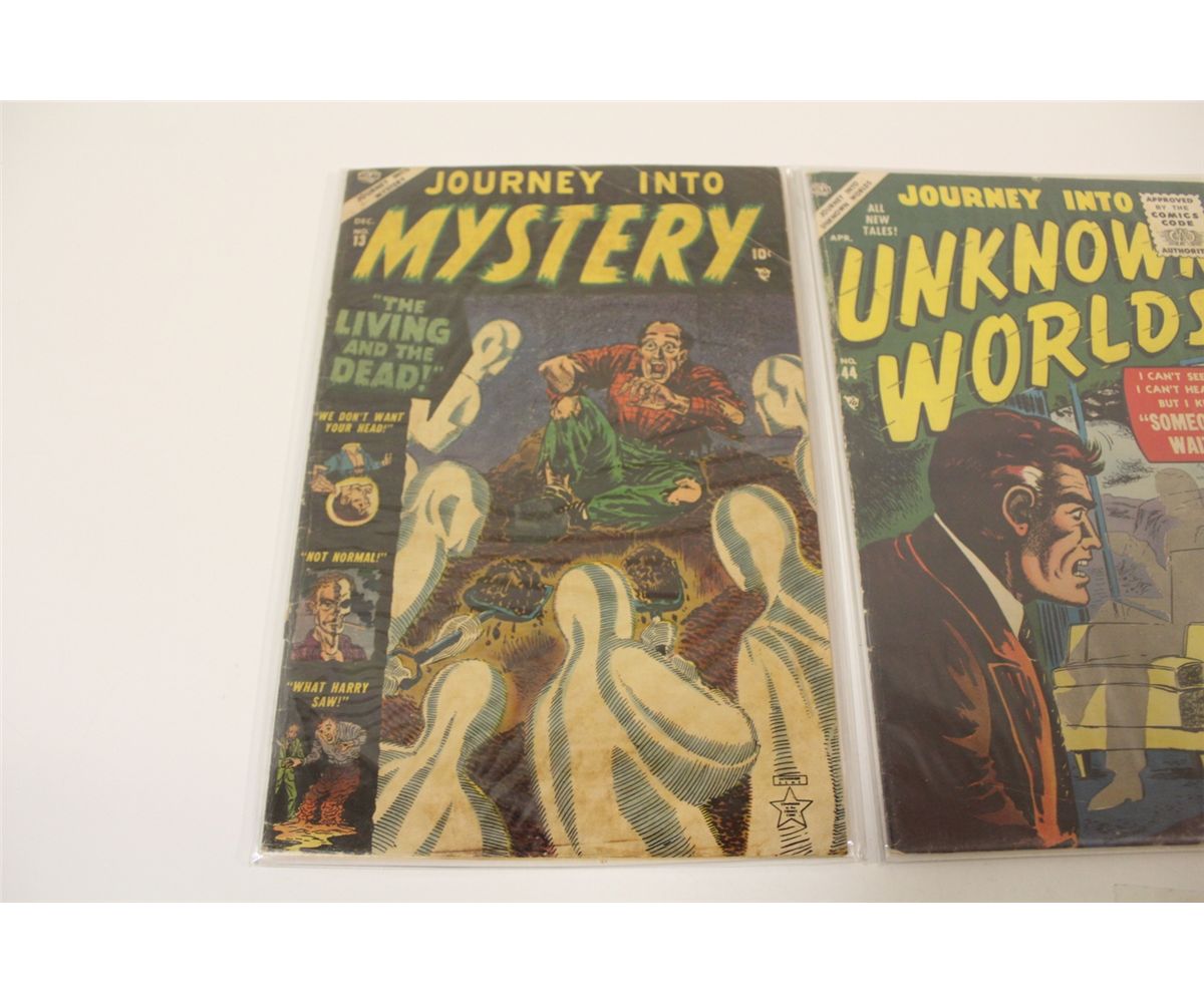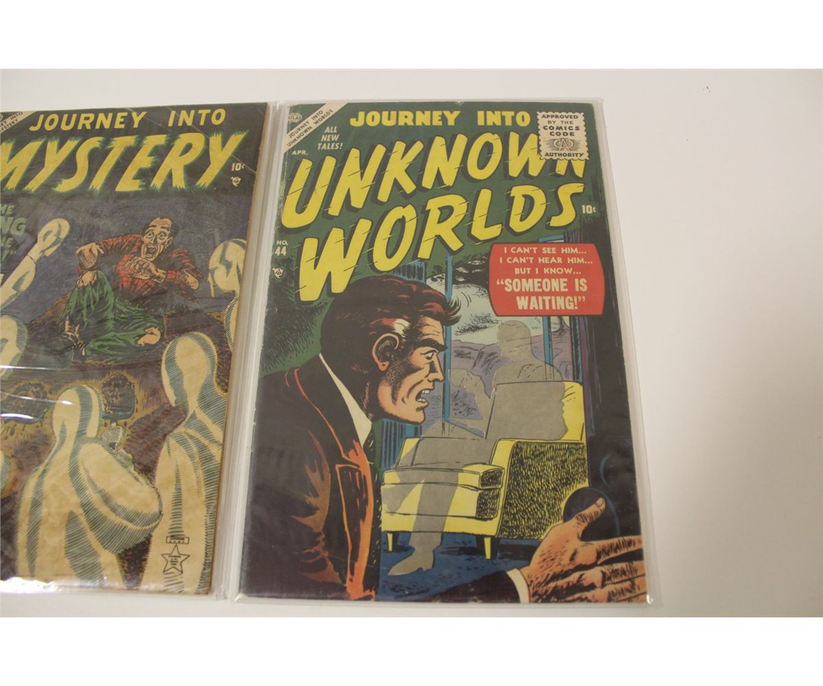 JOURNEY INTO MYSTERY #13 (1953) & JOURNEY INTO UNKNOWN WORLDS #44 (1956) 2 ATLAS PRE-CODE HORROR LOT. JIM #13 IS A LOWER GRADE, COVER DETATCHED, NO PIECES OUT, COMPLETE. WORLD'S #44 IS A SOLID MID GRADE TIGHT & SUPPLE.