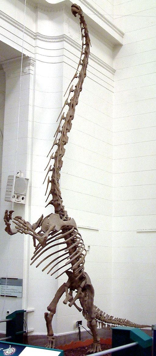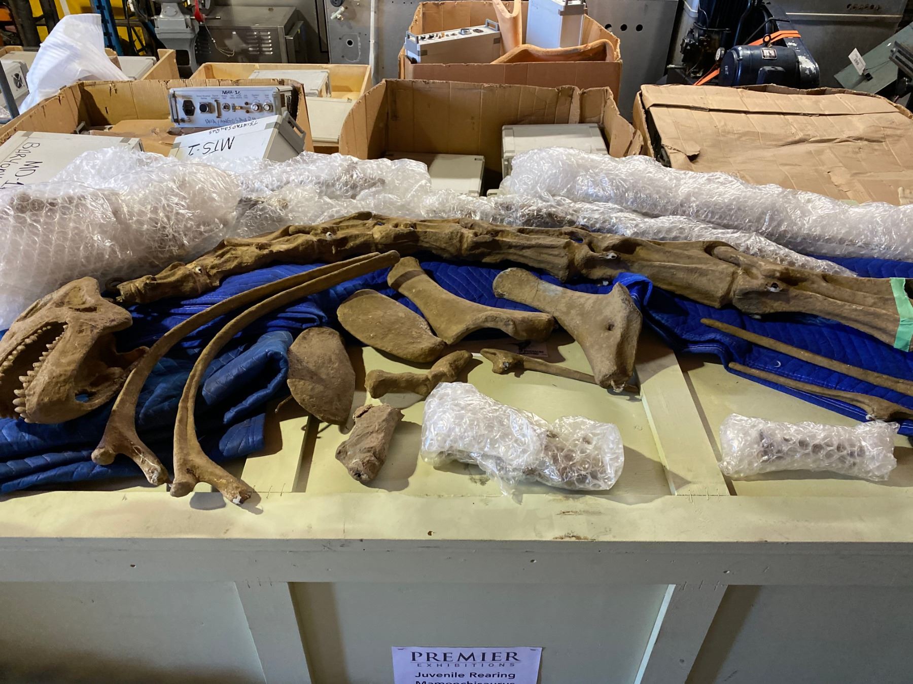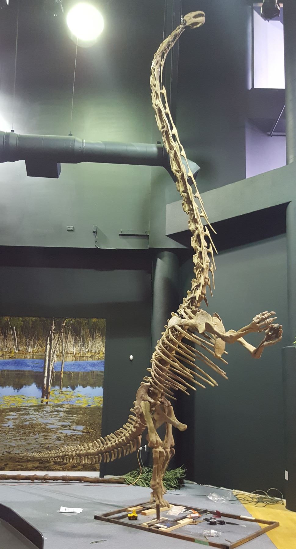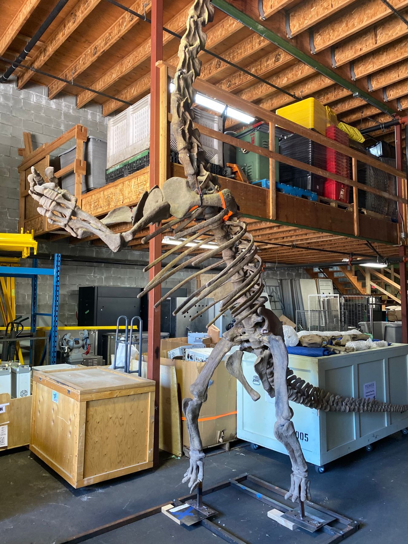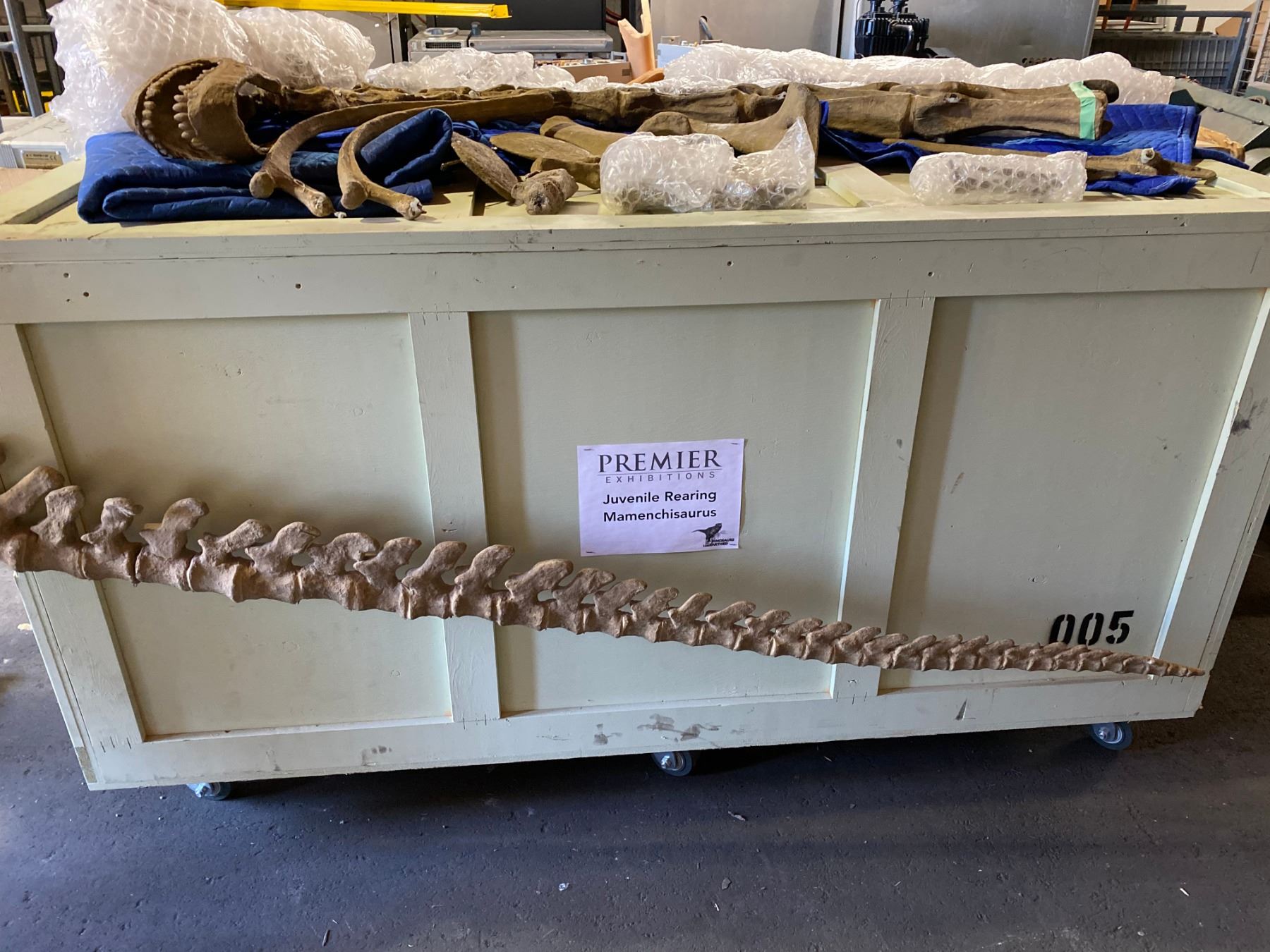 JUVENILE MAMENCHISAURUS FULL SKELETON ON STEEL FRAME, FOUND IN CHINA FROM THE LATE JURASSIC PERIOD, STANDING ON HIND LEGS TO REACH FOR FOOD, TOTAL MEASUREMENTS 50"W X 210"L X 25'H TO HEAD C/W 1-TRANSPORT ROLLING ROAD CASE 44"W X 84"L X 46"H *REPRODUCTION* APPROX 1800LBS