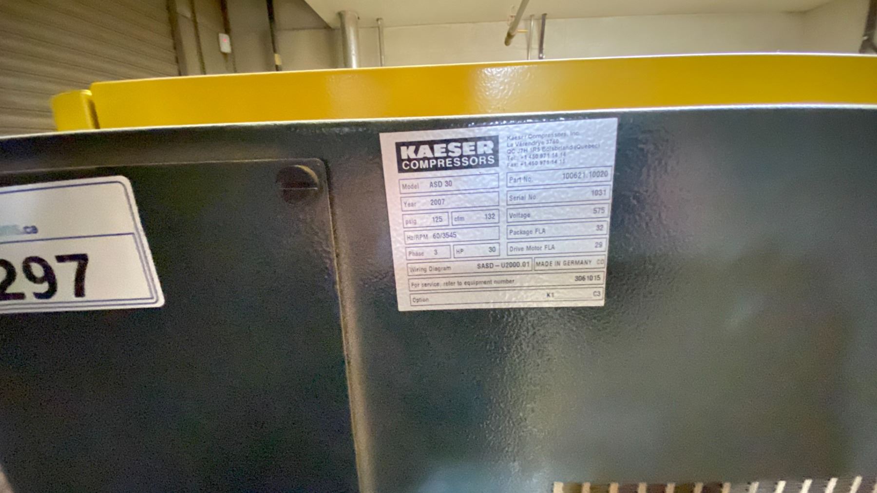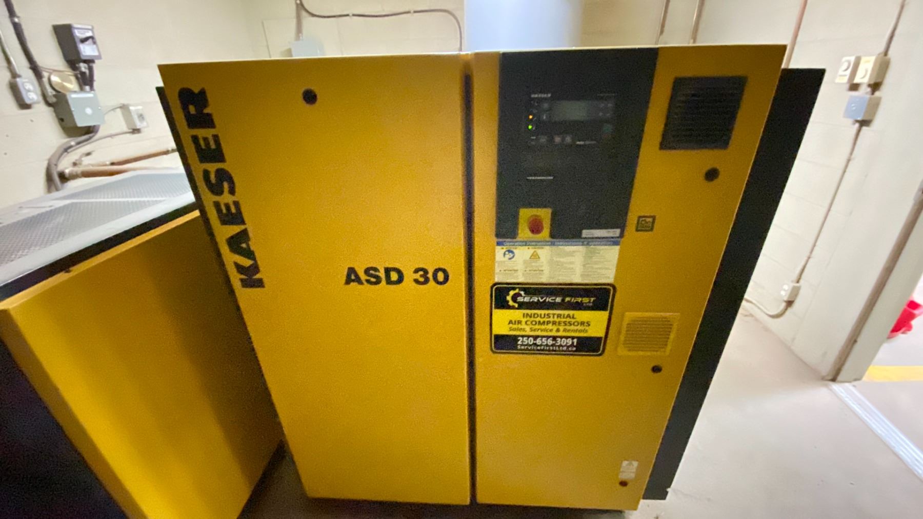 KAESER COMPRESSORS MODEL ASD30 SCREW COMPRESSOR. 132 CFM, 30HP, 3 PHASE, 54"X36"X60"H RUN HOURS 63698 UNDER LOAD 22321 *REQUIRES PROFESSIONAL TO DISMANTLE* *HOURS NOT VERIFIED*