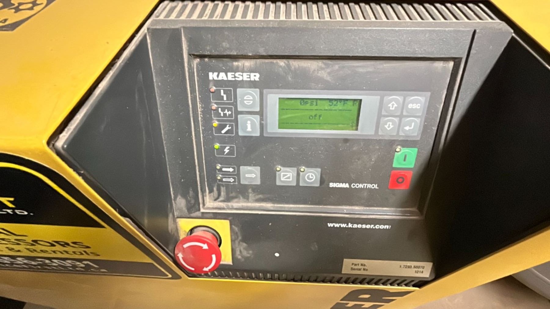 KAESER COMPRESSORS MODEL SK19 15HP ROTARY SCREW AIR COMPRESSOR, 33"X31"X40"H, 68 CFM 17800 TOTAL HOURS 7782 LOAD HOURS *HOURS NOT VERIFIED* *REQUIRES PROFESSIONAL TO DISMANTLE*