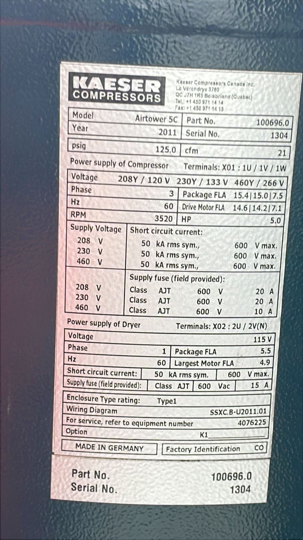 KAESER INDUSTRIAL AIR COMPRESSOR MODLE AIRTOWER 5C. SERIAL # 1304