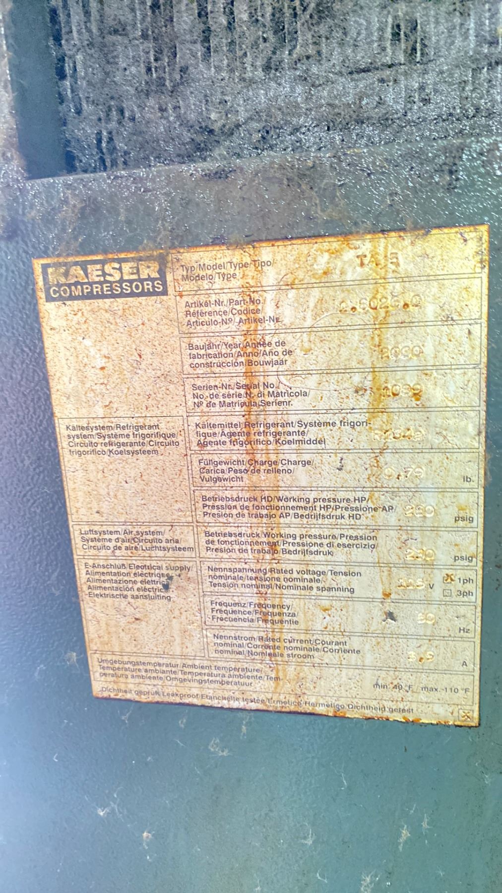 KAESER MODEL TA5 AIR DRYER/600 L/MIN 250 W 230V **REMOVAL OF THIS PIECE REQUIRES HIAB/CRANE LIFT AND HEAVY MOVING SKATES**