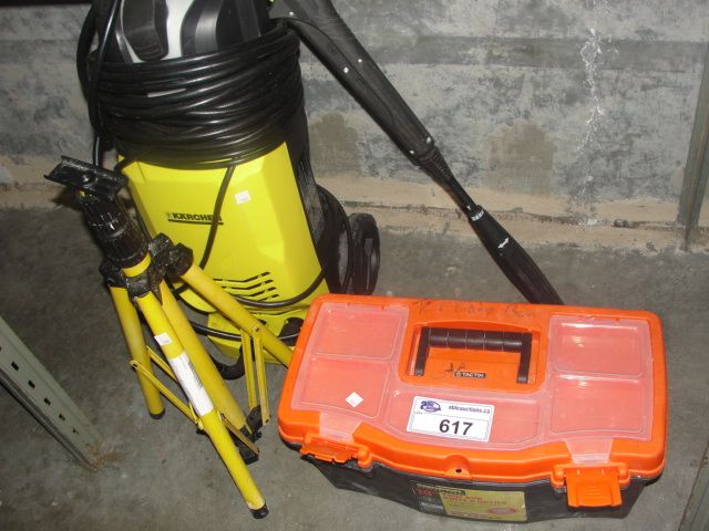KARCHER ELECTRIC PRESSURE WASHER, TRIPOD AND ORANGE AND BLACK TOOLBOX WITH CONTENTS