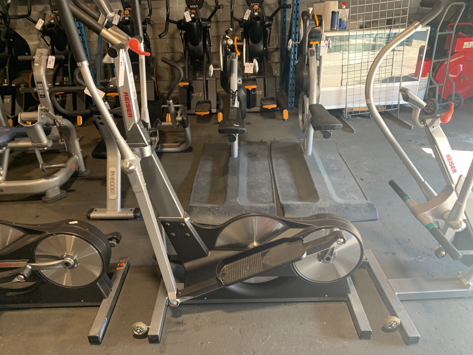 KEISER M3 COMMERCIAL SPIN BIKE / CROSSTRAINER WITH BLACK SEAT, RED TENSION HANDLE, & DIGITAL PEDOMETER ( STRAIGHT ARMS )