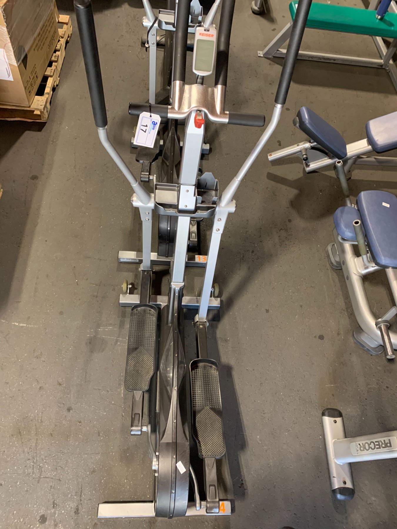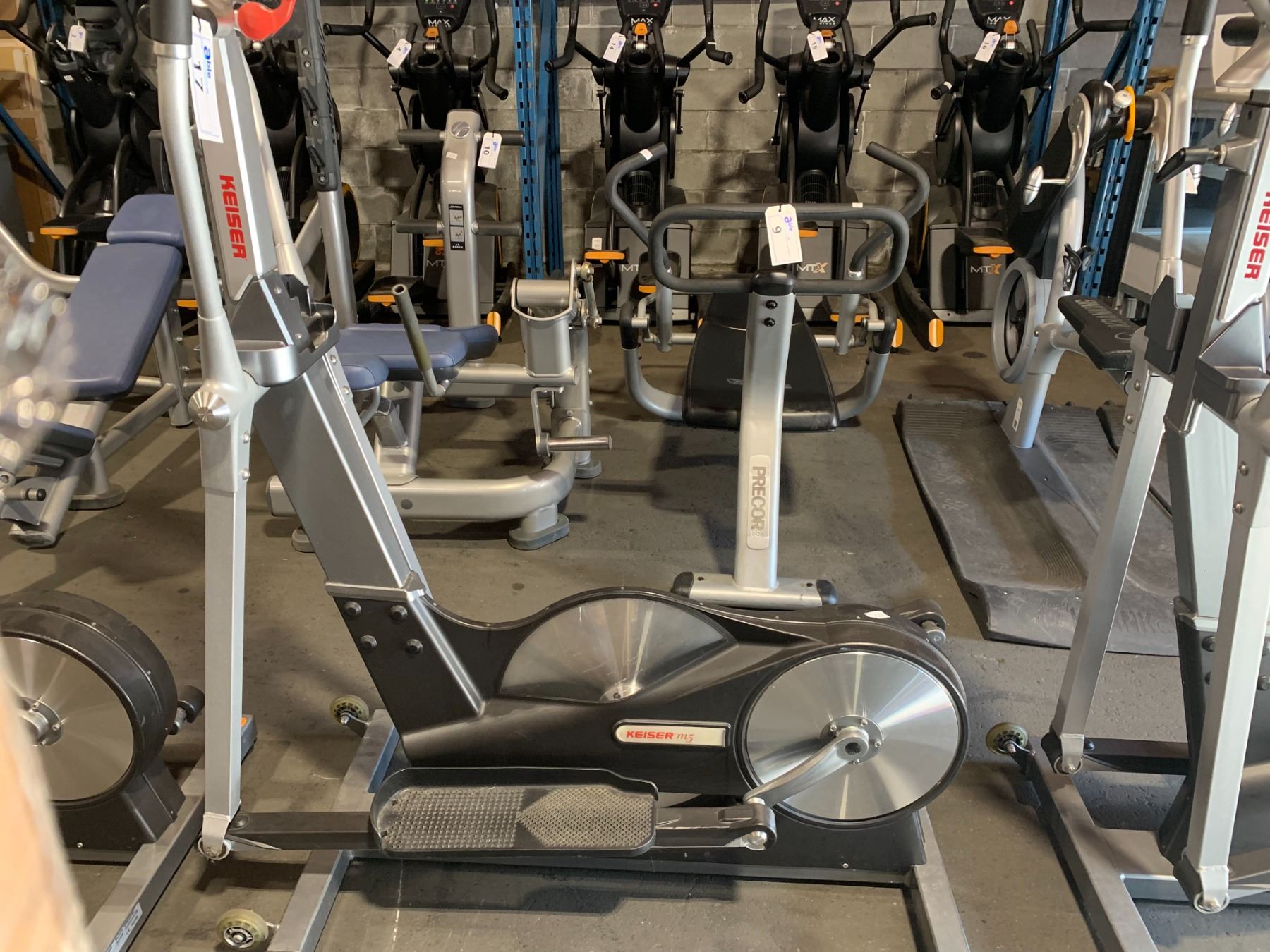 KEISER M3 COMMERCIAL SPIN BIKE / CROSSTRAINER WITH BLACK SEAT, RED TENSION HANDLE, & DIGITAL PEDOMETER ( STRAIGHT ARMS )