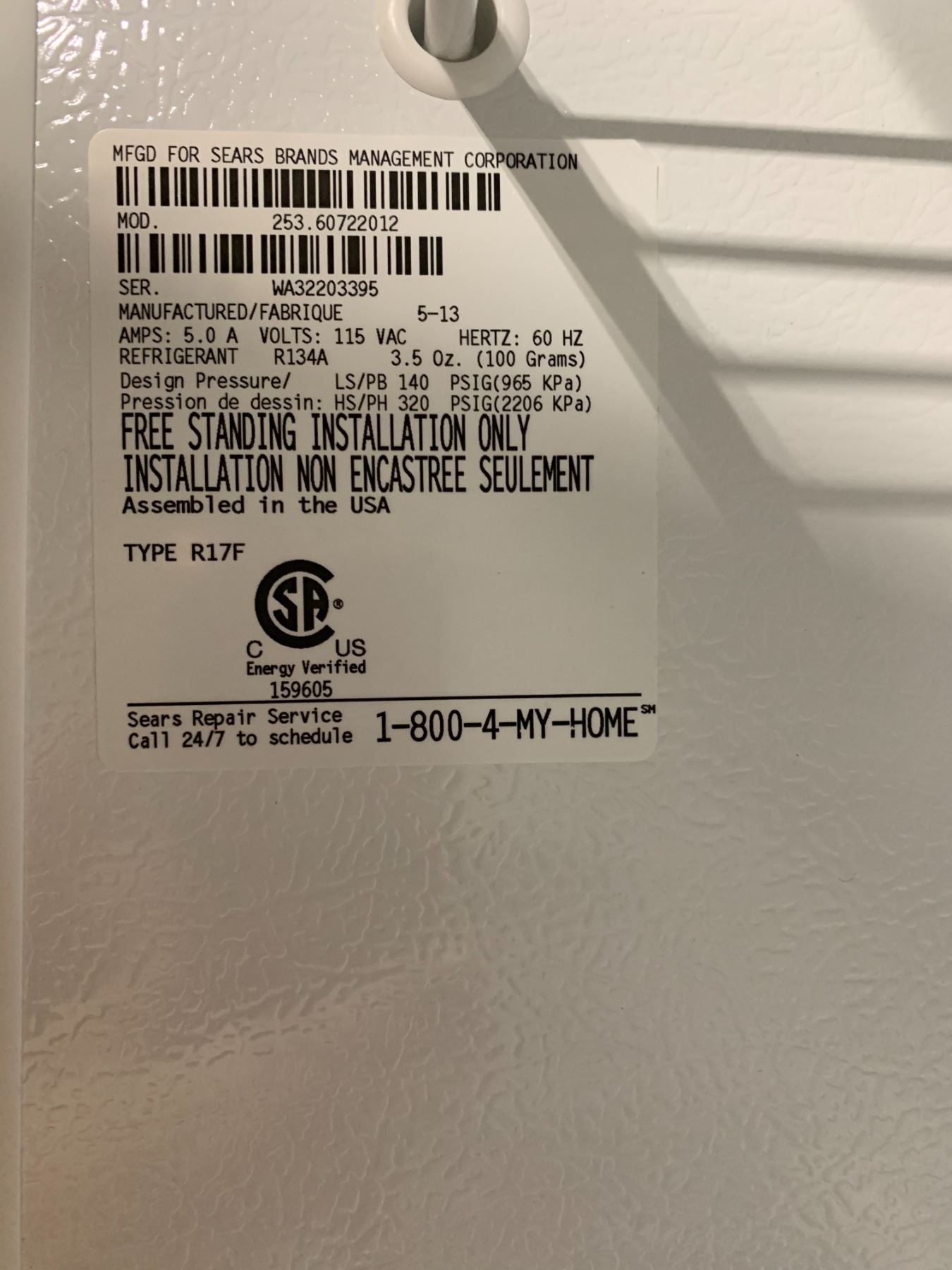 KENMORE 253.60722012 WHITE SINGLE DOOR REFRIGERATOR