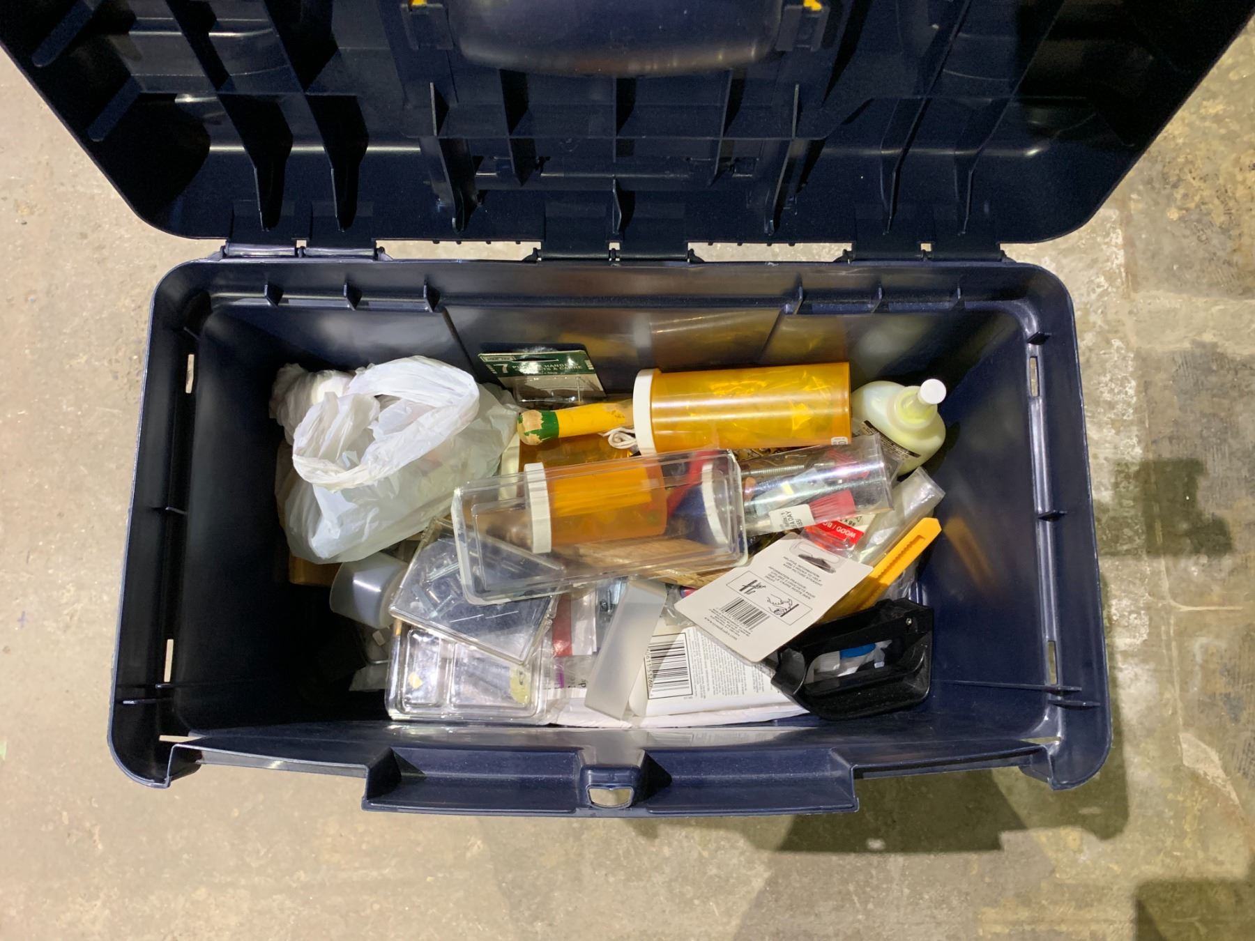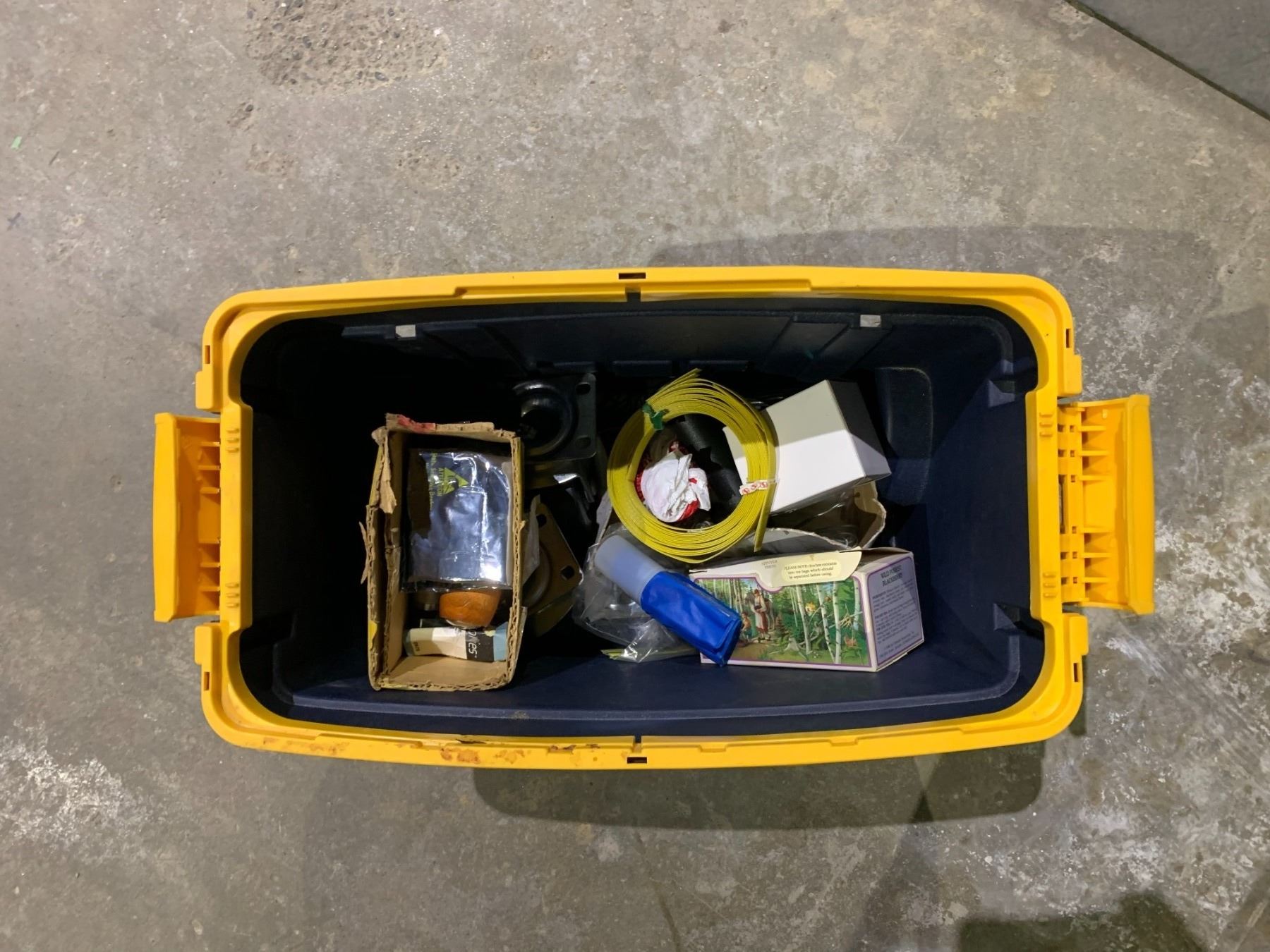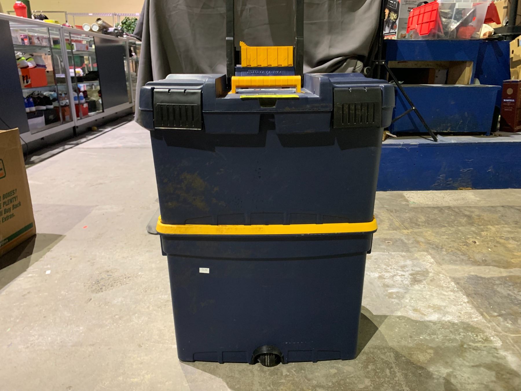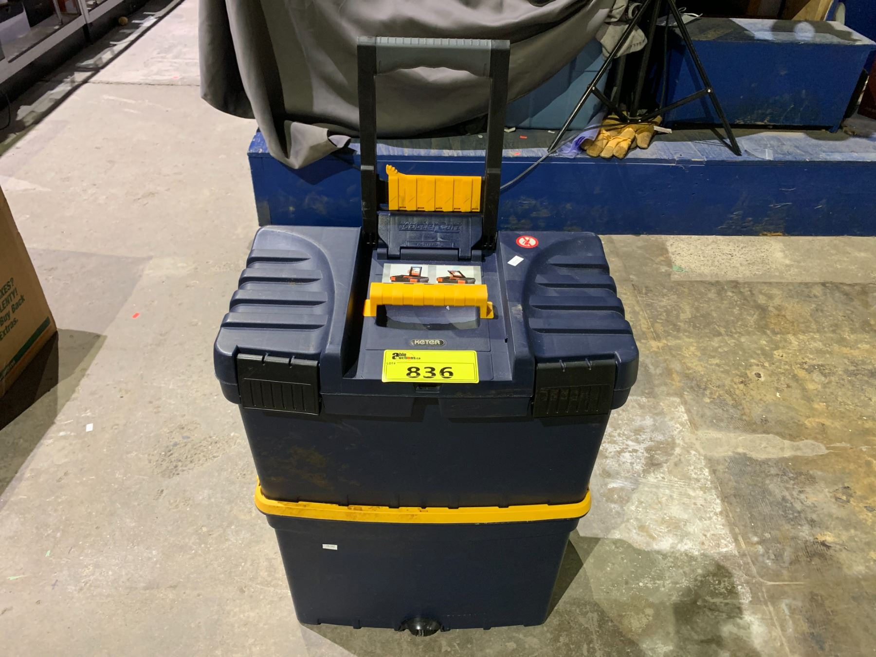 KETER MASTERCART MOBILE TOOLBOX WITH ASSORTED CONTENTS INCLUDING; CASTER WHEELS, BUTTONS, HAND TOOLS & MORE