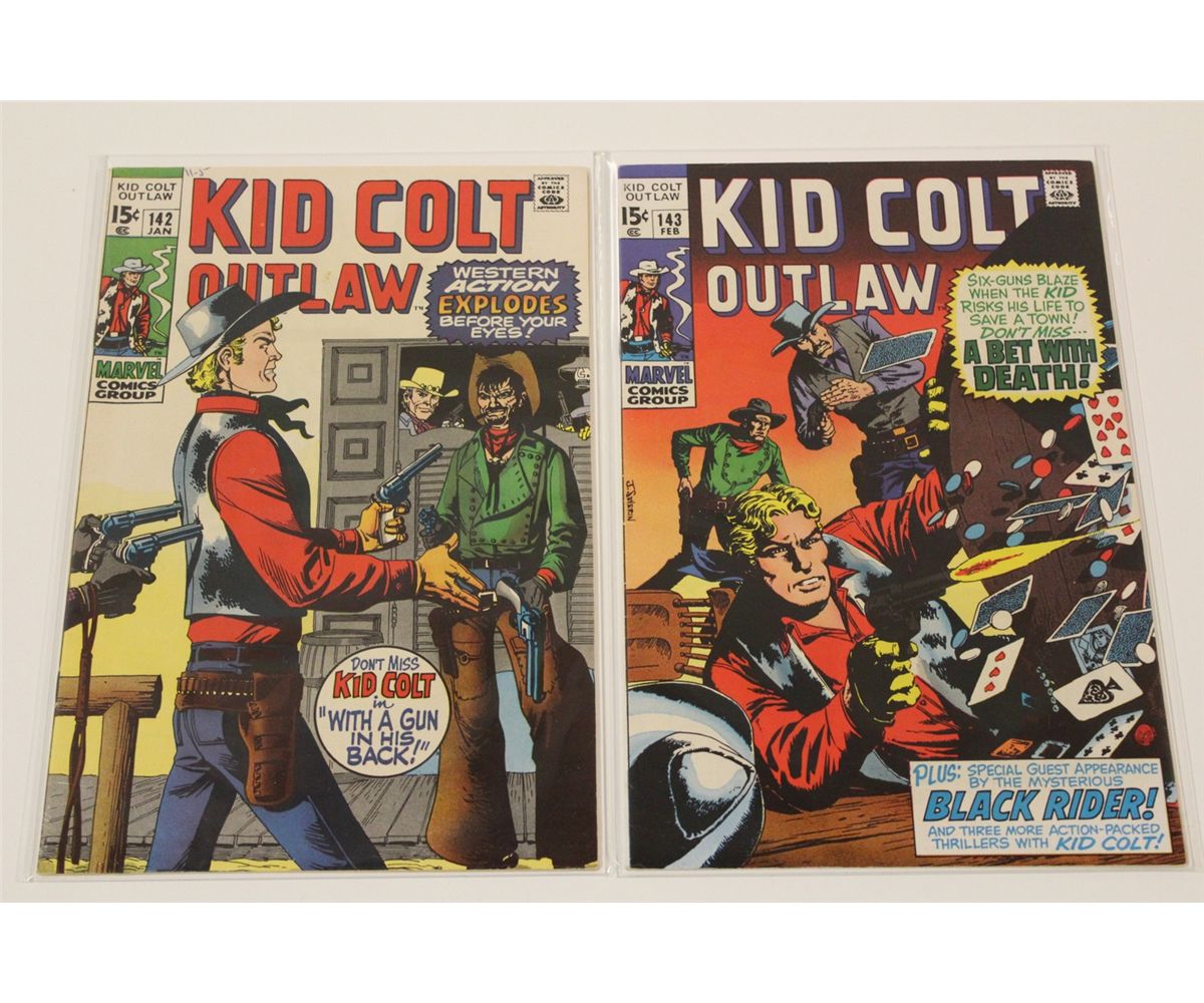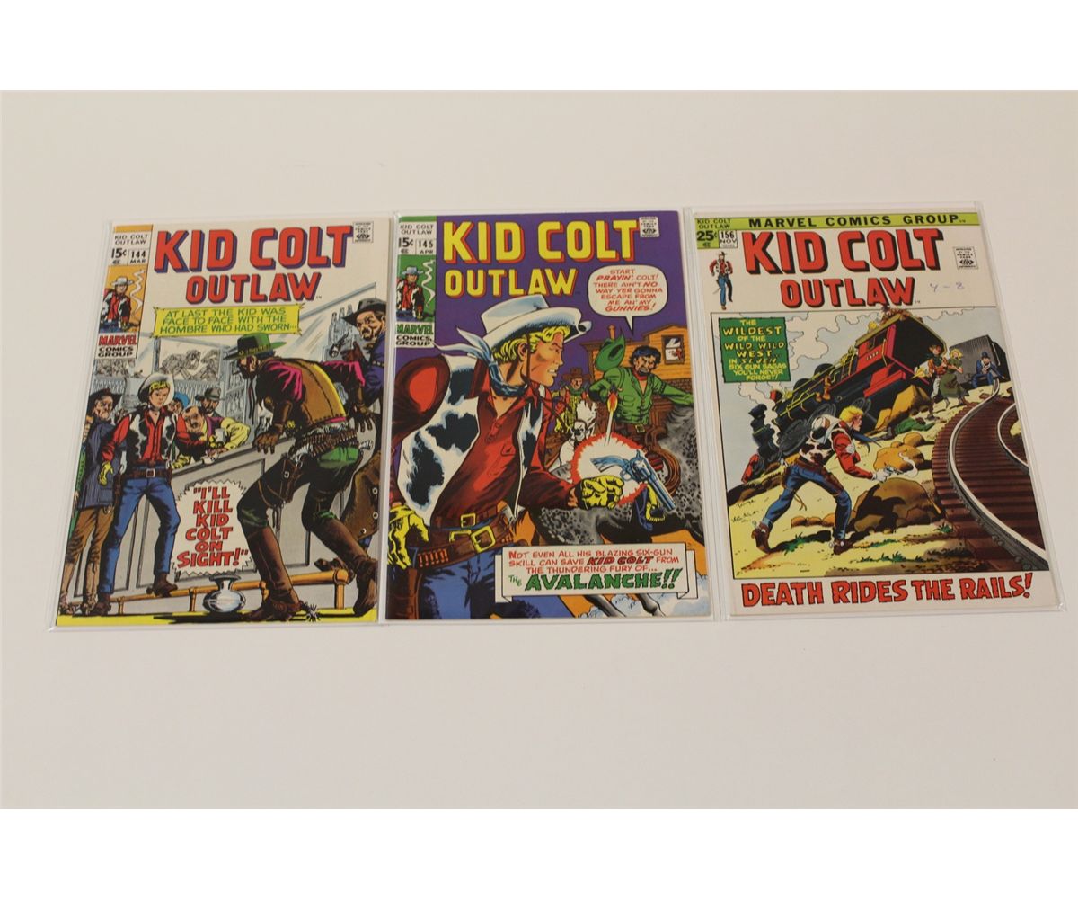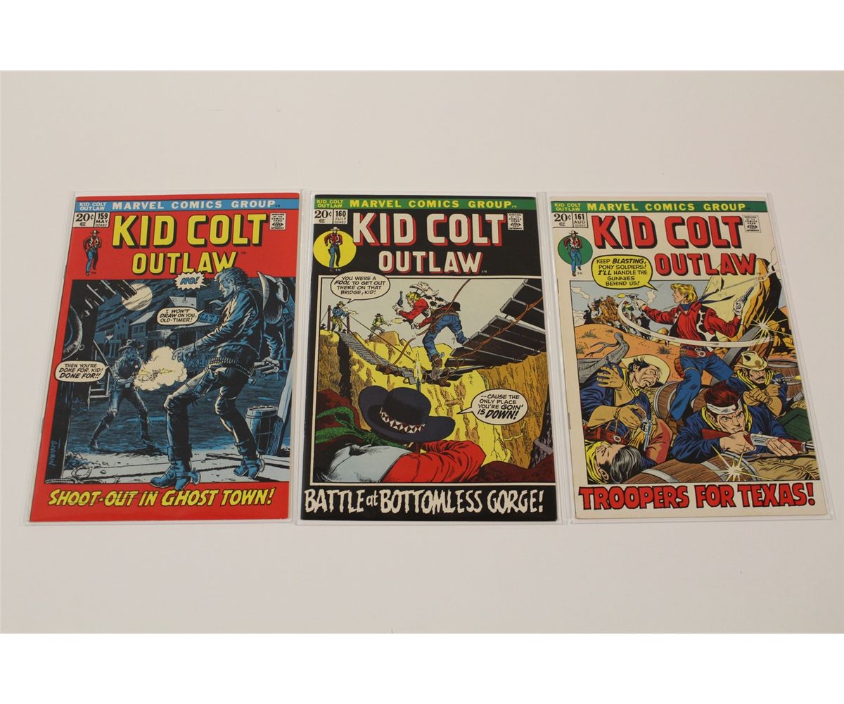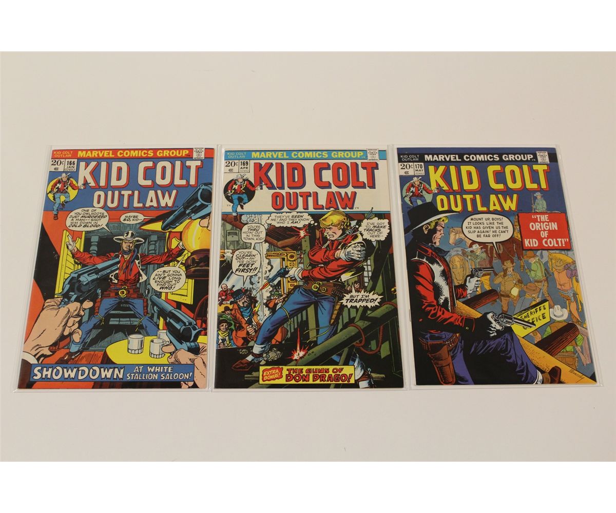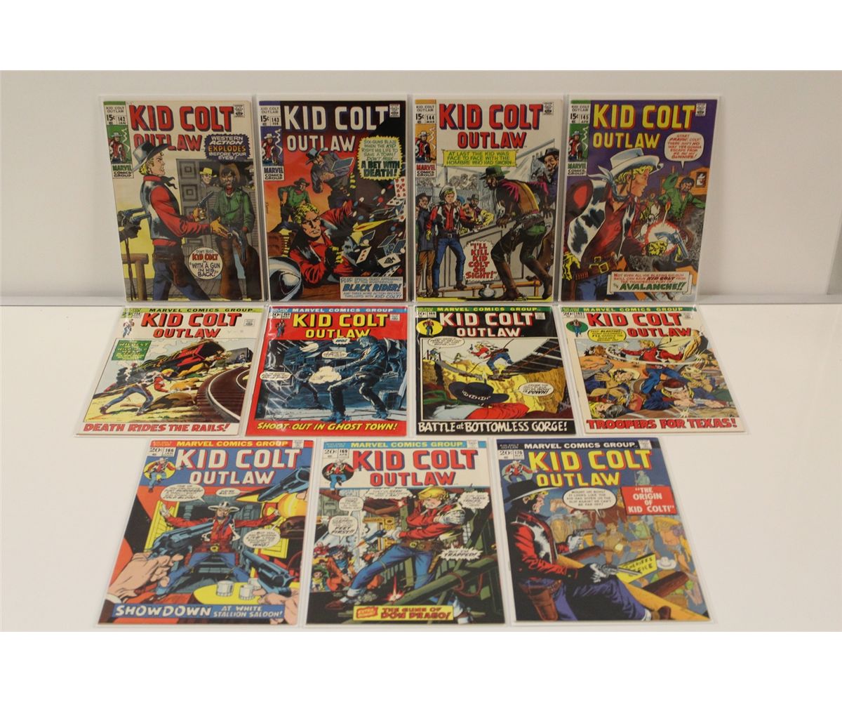 KID COLT OUTLAW #142-170 HIGH GRADE (1970-73) SHARP RUN OF 11 EARLY BRONCE 15 & 20 CENT ISSUES. INCLUDES #142-145, 156, 159-161 166 & 169-170. HIGH GRADE, WHITE, SHARP, GLOSSY, , TIGHT & SUPPLE, HARD TO FIND GENRE BOOKS IN TOP GRADE, GORGEOUS COPIES! 2013 OVERSTREET TOP END GUIDE VALUE OF OVER $300