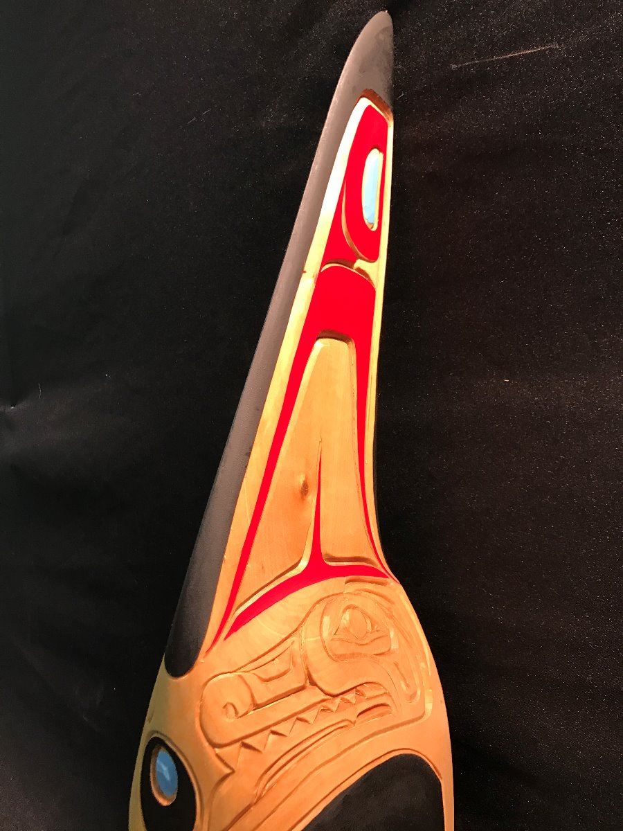 KILLER WHALE CHIEF MASK BY GITSKAN NATION'S RUPERT JEFFREY. MASK IS CARVED IN BIRCH WOOD MASK MEASURES: 31" TALL X 6.5" WIDE