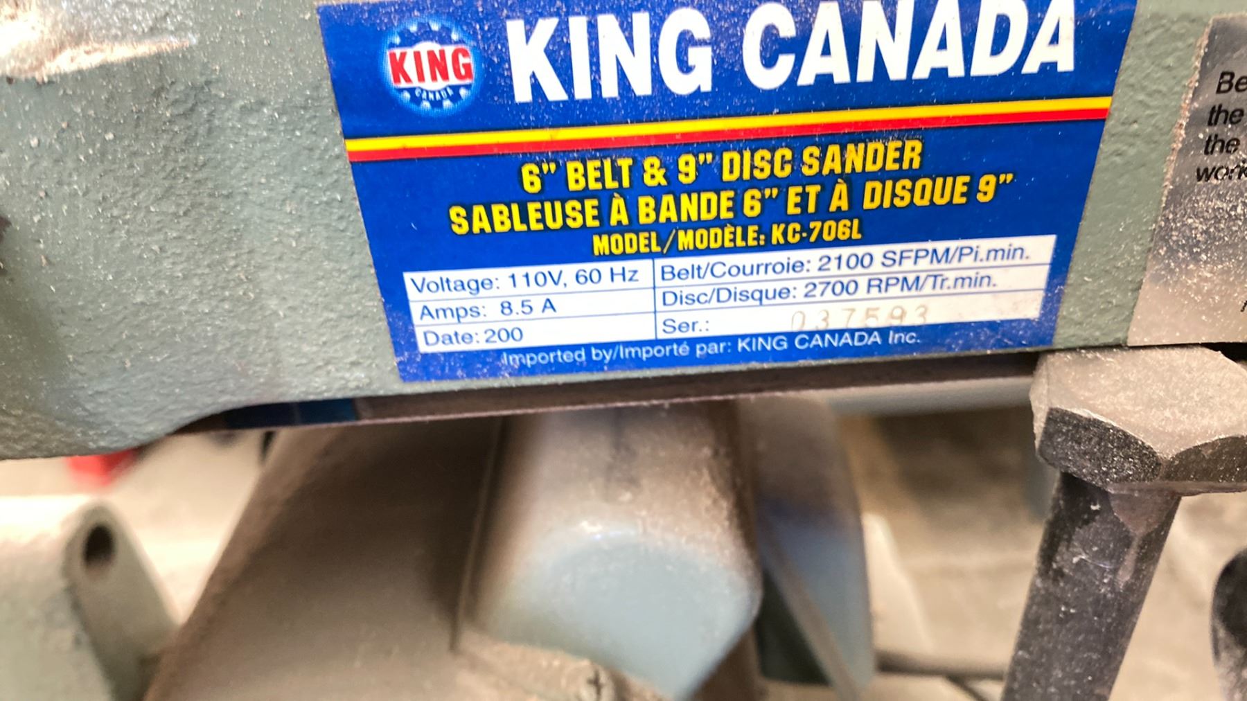 KING 6' HORIZONTAL BELT AND DISC SANDER 6" BELT, 9" DISC