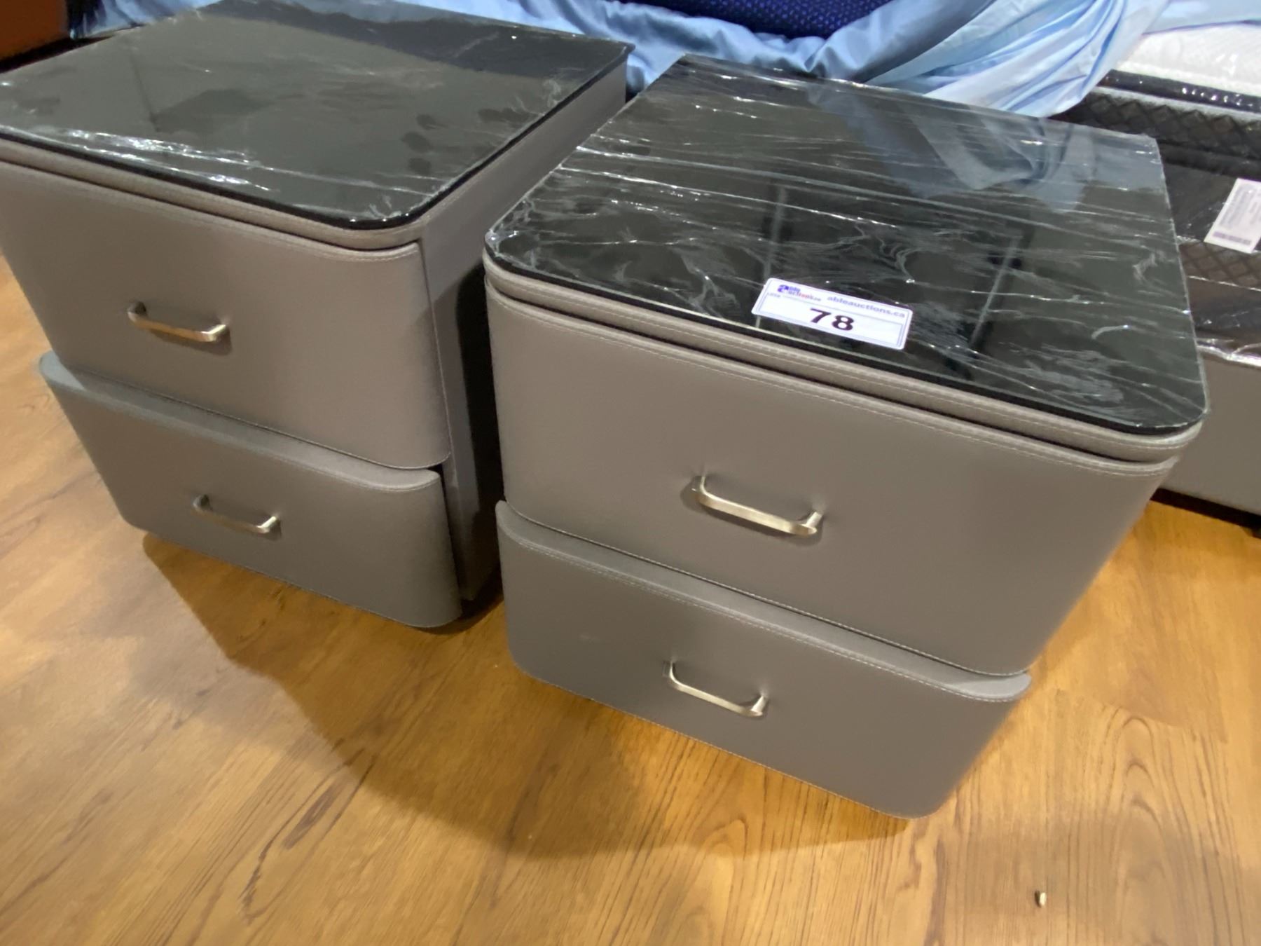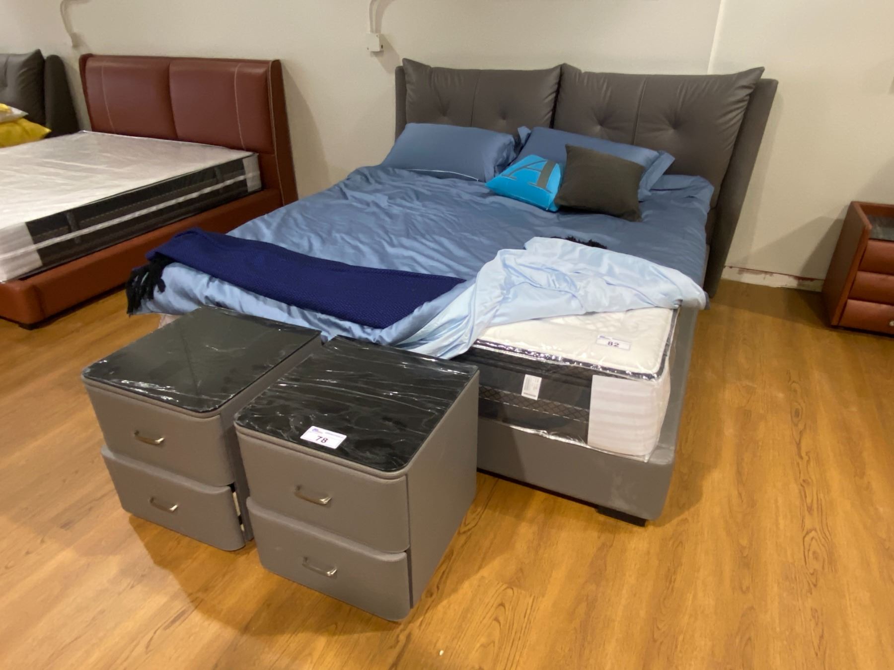 KING SIZE (75" WIDE) GREY LEATHER BED WITH 2 MATCHING NIGHT STANDS