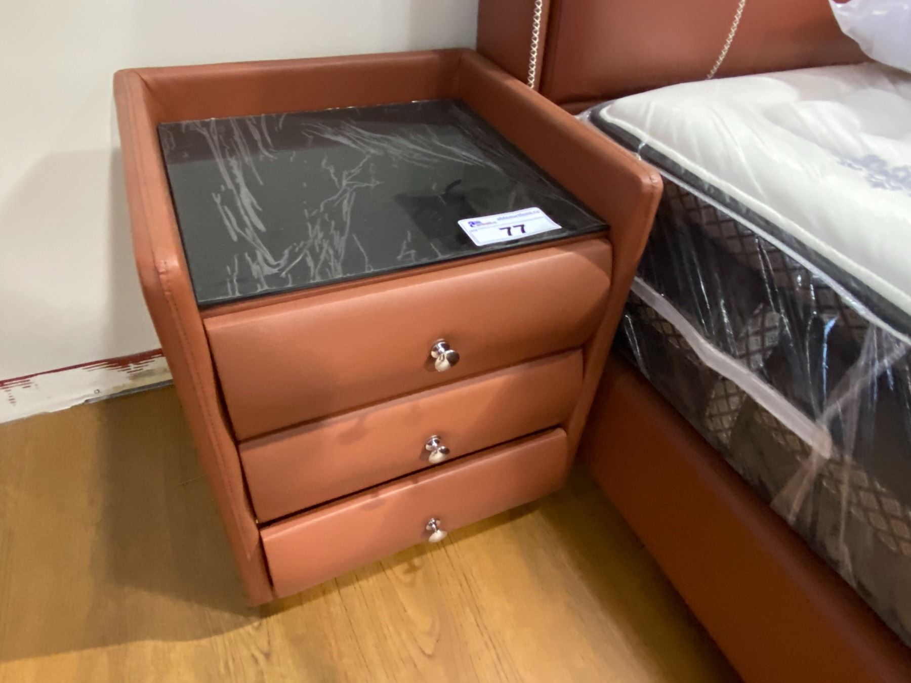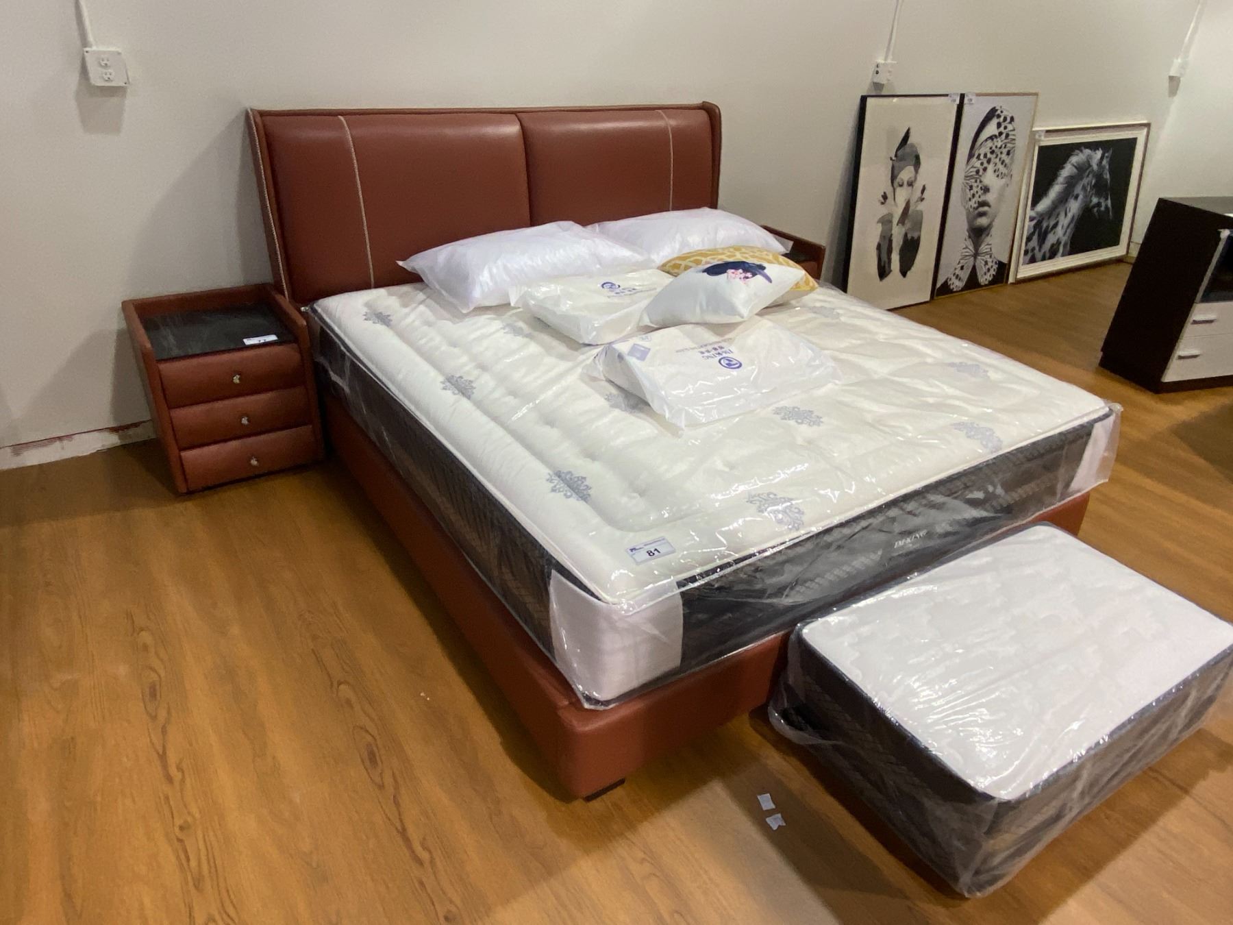 KING SIZE (75" WIDE) RED / BROWN LEATHER BED WITH 2 MATCHING NIGHT STANDS