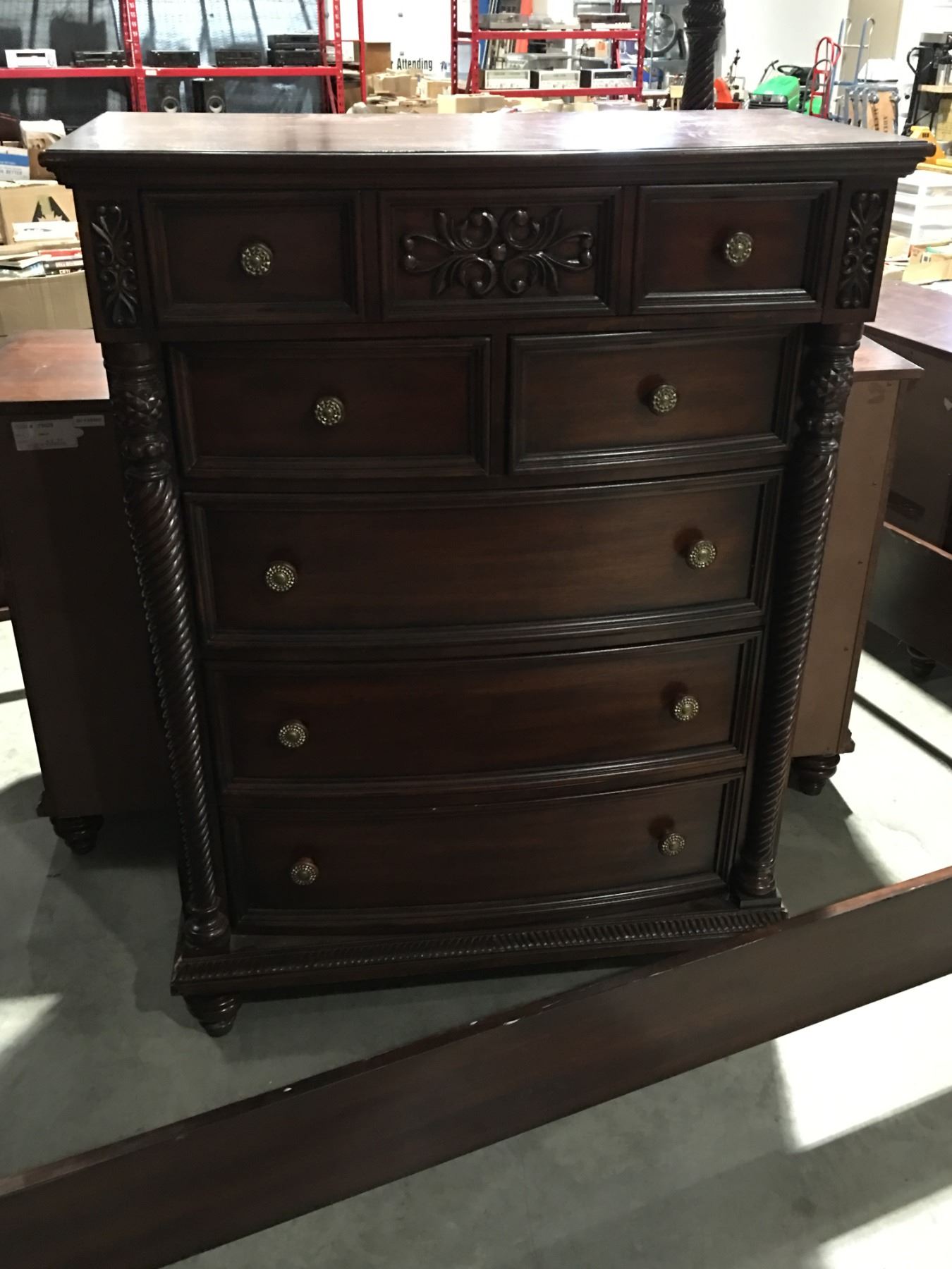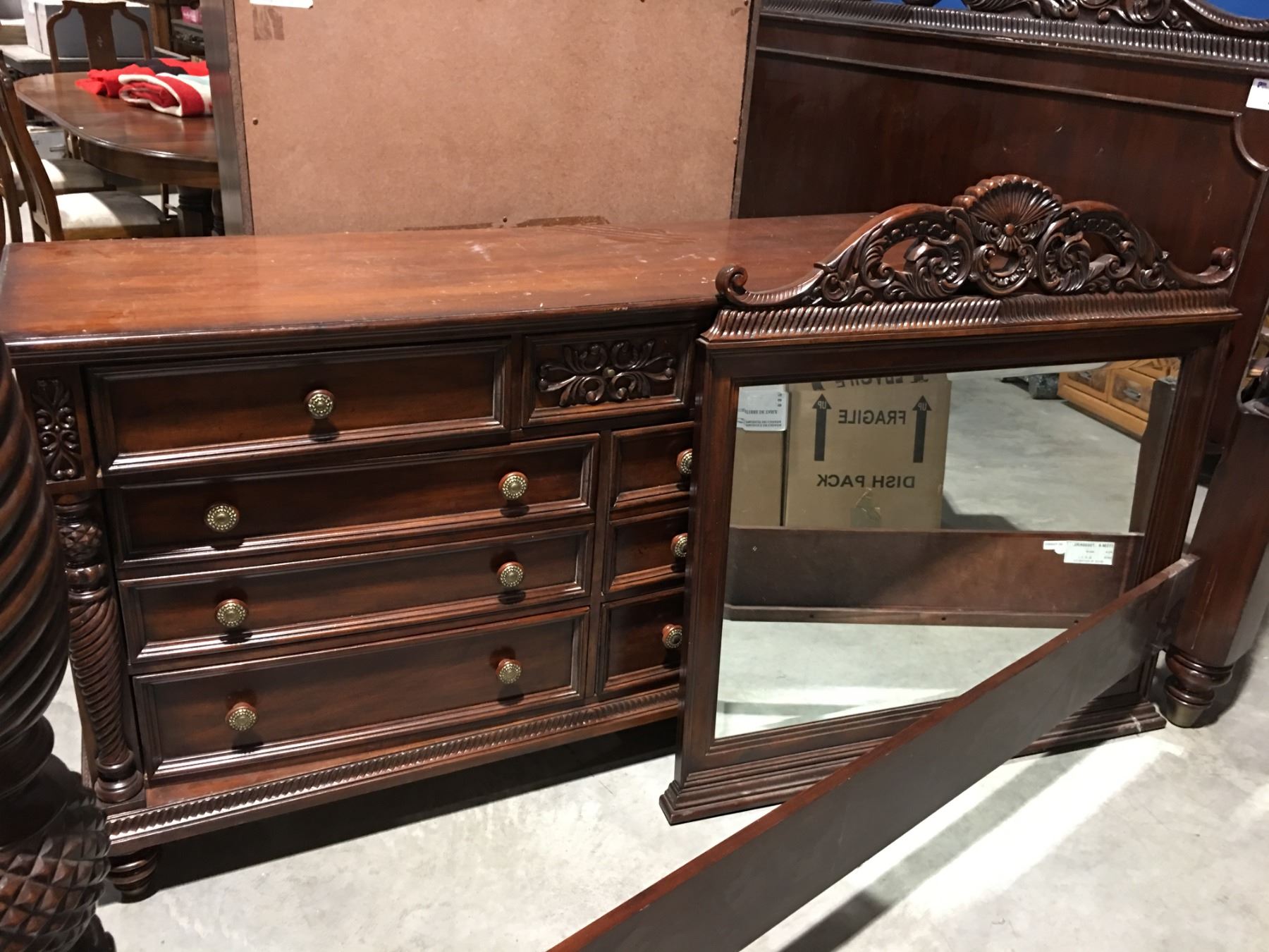 KING SIZE MAHOGANY BEDROOM SUITE - 4 POSTER BED, DRESSER WITH MIRROR, HIGHBOY DRESSER & 2 NIGHT STANDS (MINOR DAMAGE PRESENT SOME REPAIRS MAY BE REQUIRED)