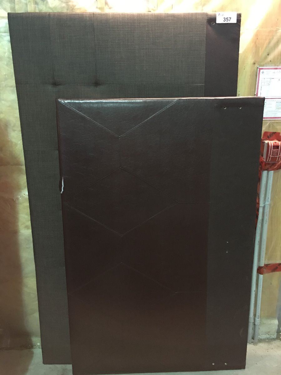 KING SIZED GREEN UPHOLSTERED HEADBOARD & A QUEEN SIZED BROWN LEATHER UPHOLSTERED HEADBOARD (BOTH HEADBOARDS HAVE DAMAGE PRESENT)
