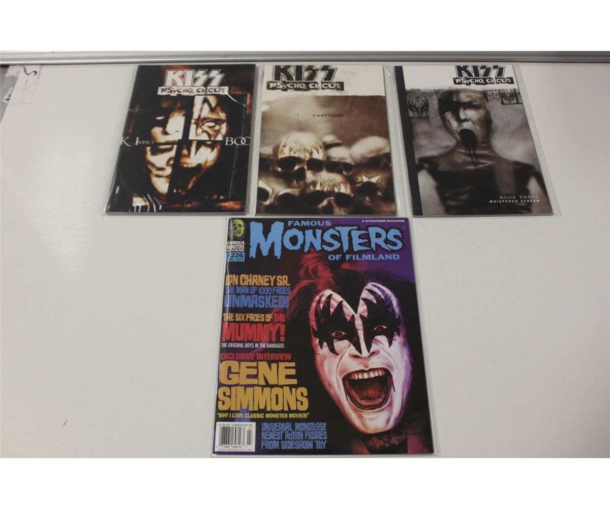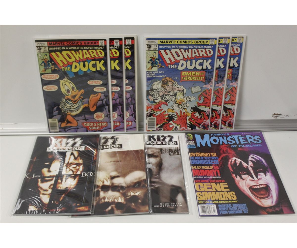 KISS LOT: HOWARD THE DUCK #12 & 13 X 3 COPIES OF EACH - 1ST APPEARANCE KISS IN COMICS (1977), KISS PSYCHO CIRCUS TRADES VOL. #1-3 & FAMOUS MONSTERS #226 GENE SIMMONS/PAUL STANLEY FLIP COVER.  HIGH GRADE AVERAGE.  2013 OVERSTREET TOP END GUIDE VALUE OF OVER $350.