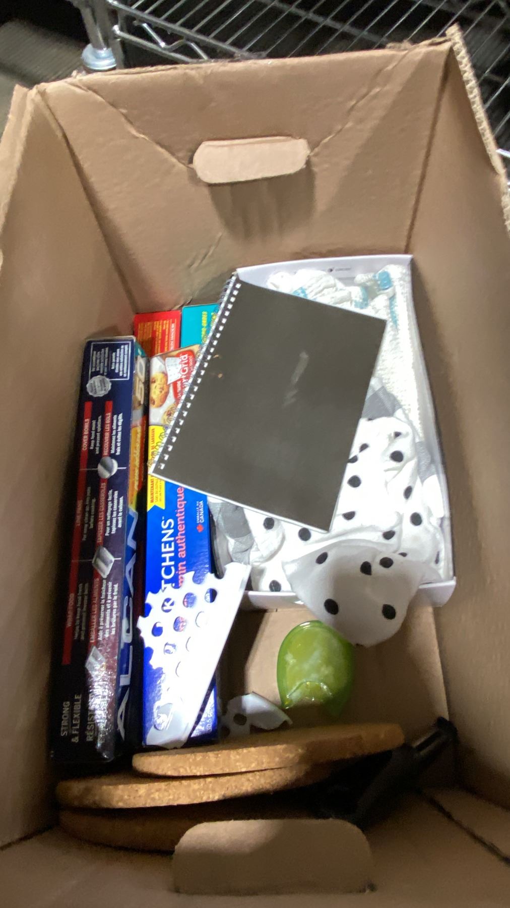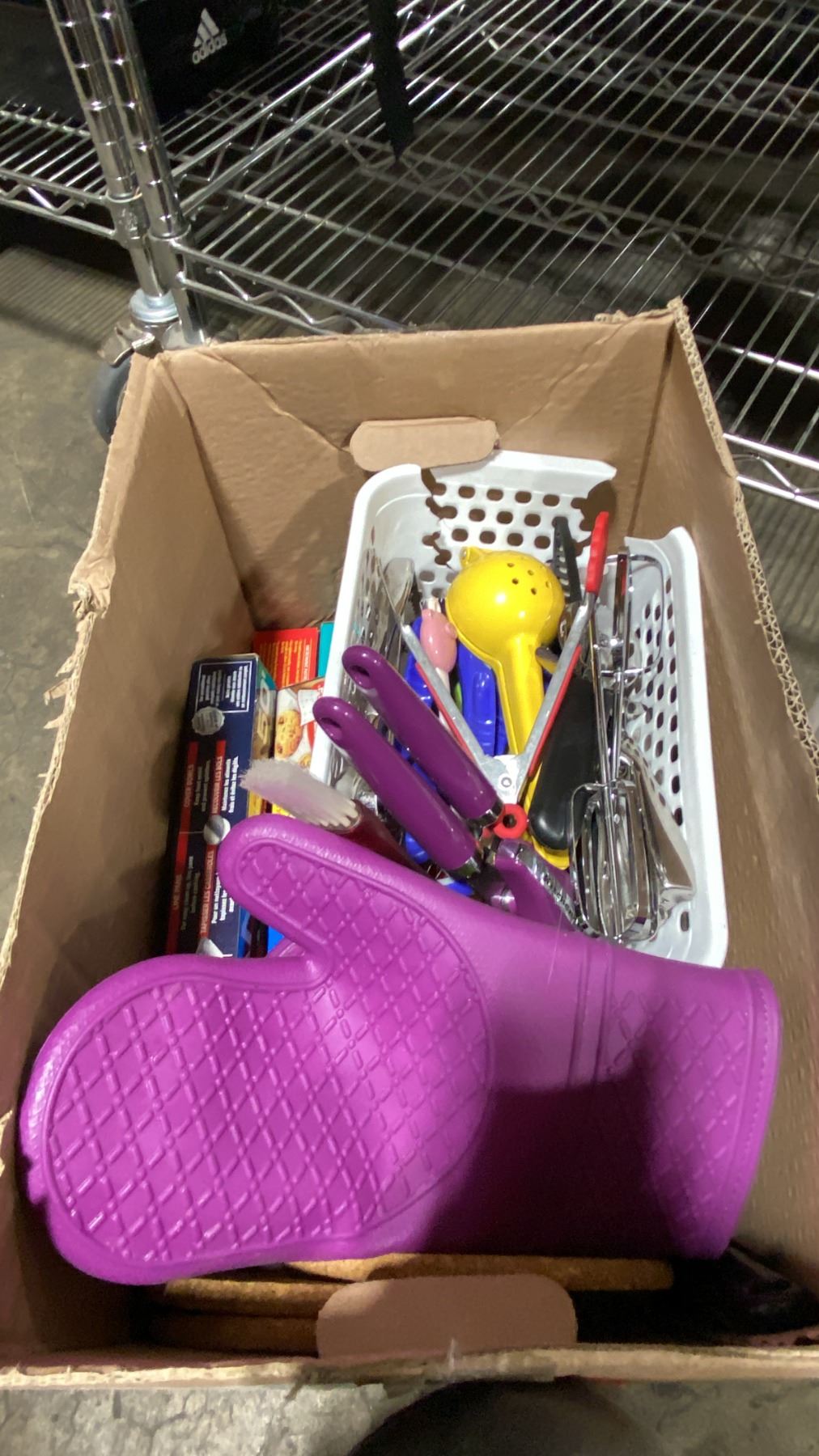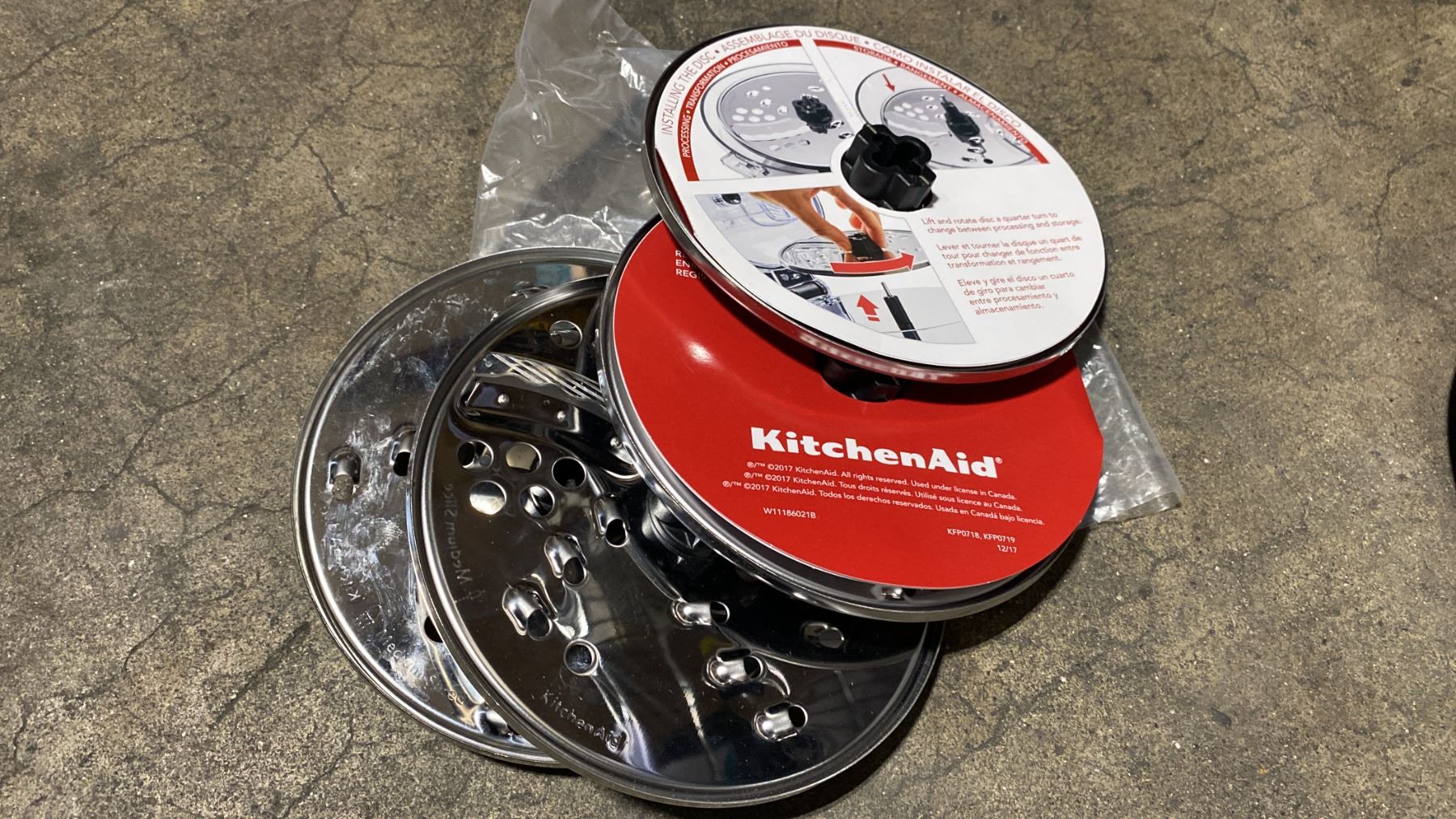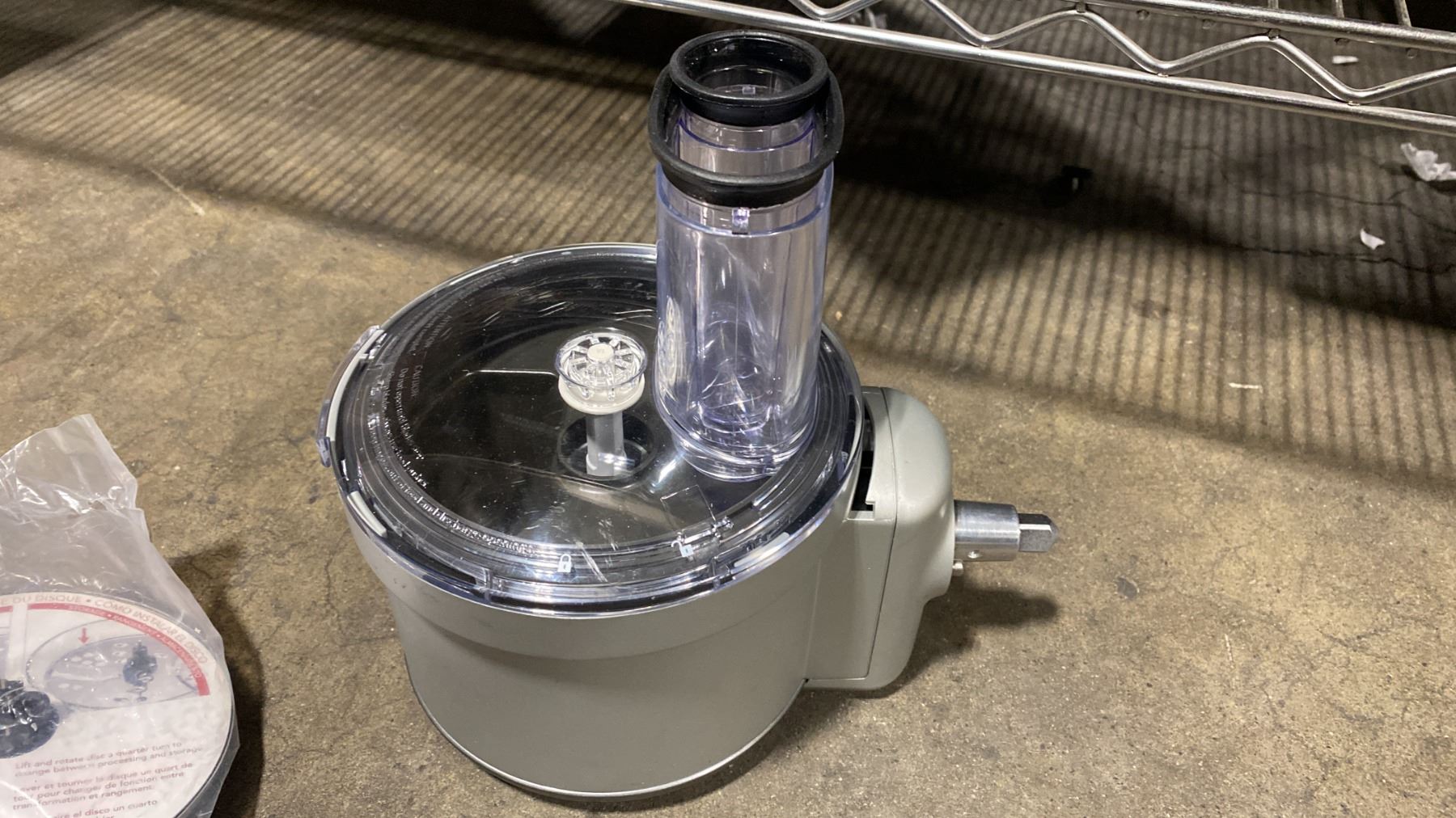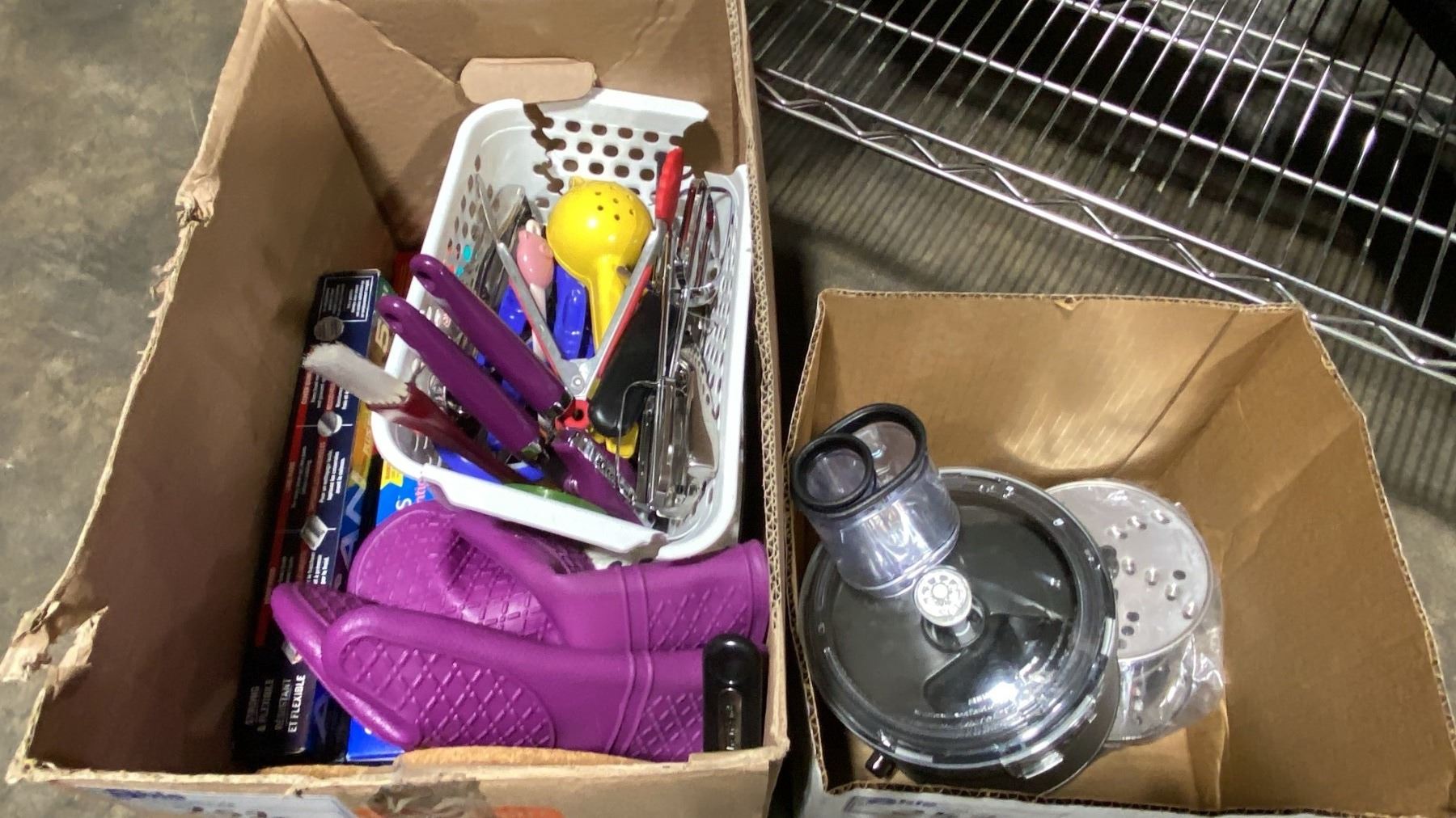 KITCHENAID STAND MIXER FOOD PROCESSOR ATTACHMENT WITH NO BLADES & BOX OF ASSORTED NEW KITCHEN ITEMS