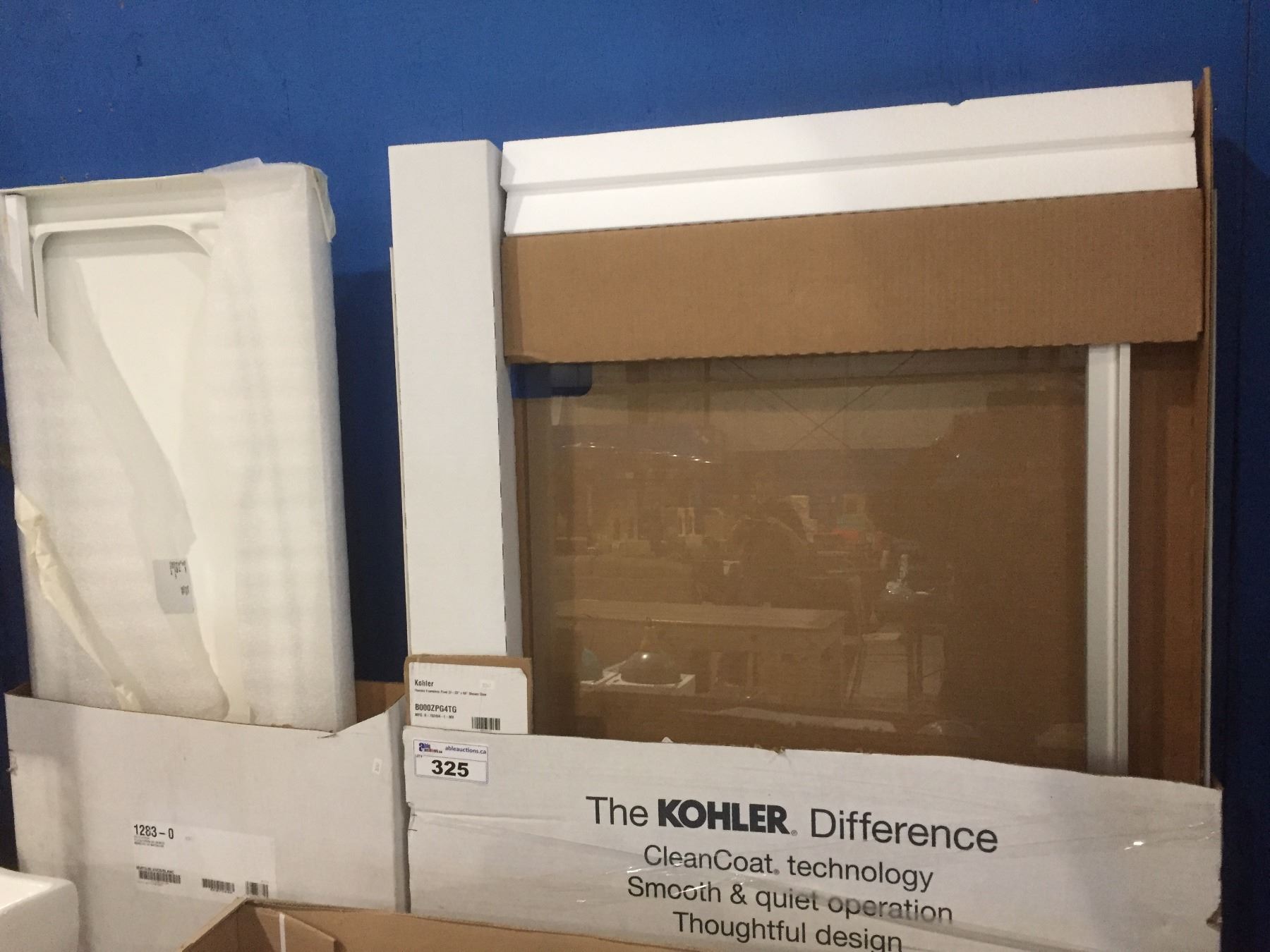 KOHLER FRAMELESS PIVOT SHOWER DOOR & WHITE BATH APRON