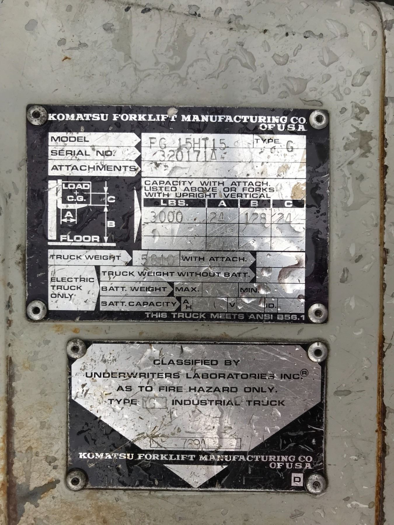KOMATSU FG15HT15 2 STAGE 128" MAST 3,000LBS CAPACITY PROPANE SITDOWN COUNTER BALANCE FORKLIFT WITH SIDE SHIFT TRACTION SOLID RUBBER TIRES FRONT AND FLAT SOLID RUBBER TIRES BACK HOURS 7155.6 (HOURS NOT VERIFIED) *PROPANE TANK NOT INCLUDED*
