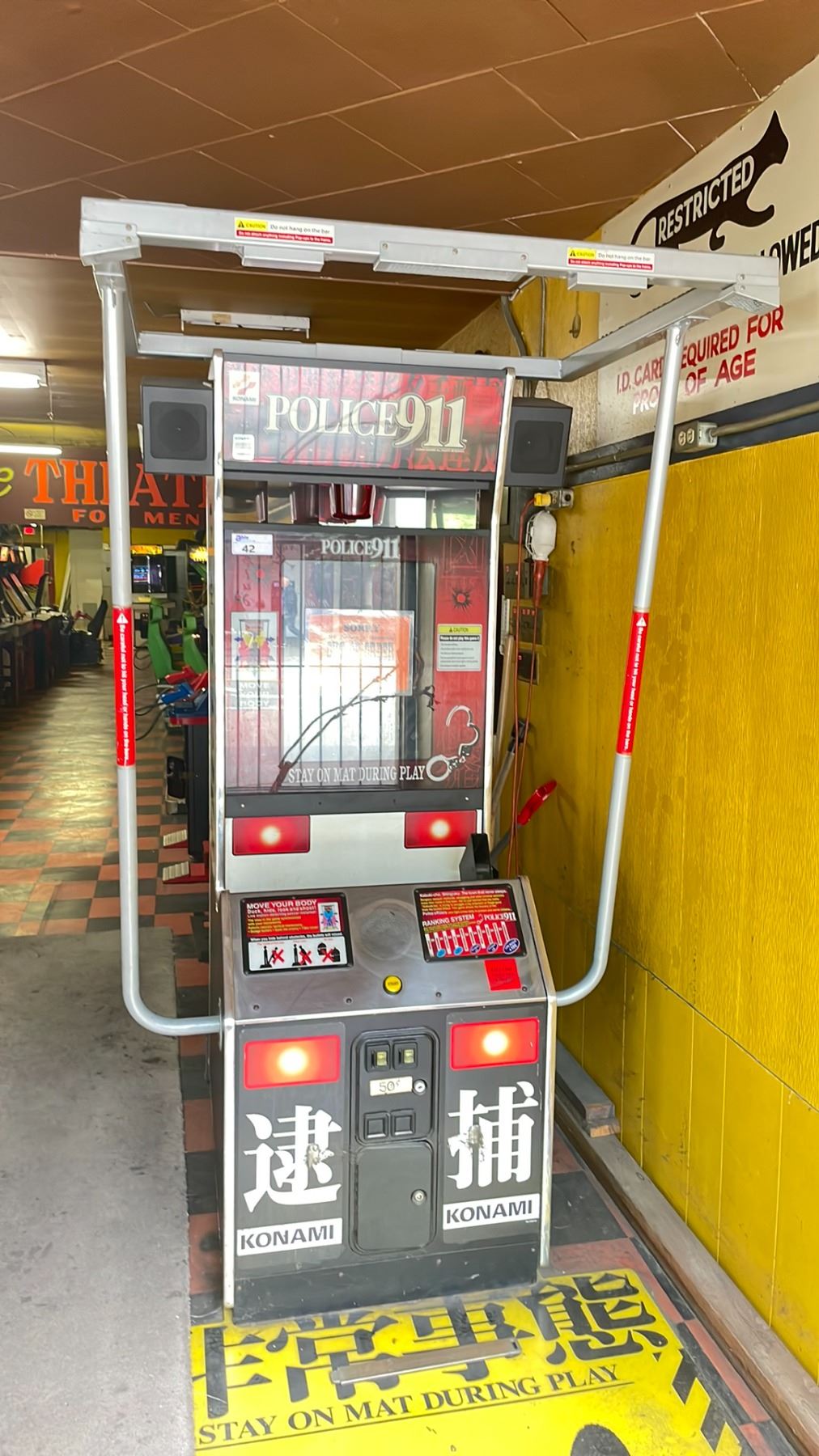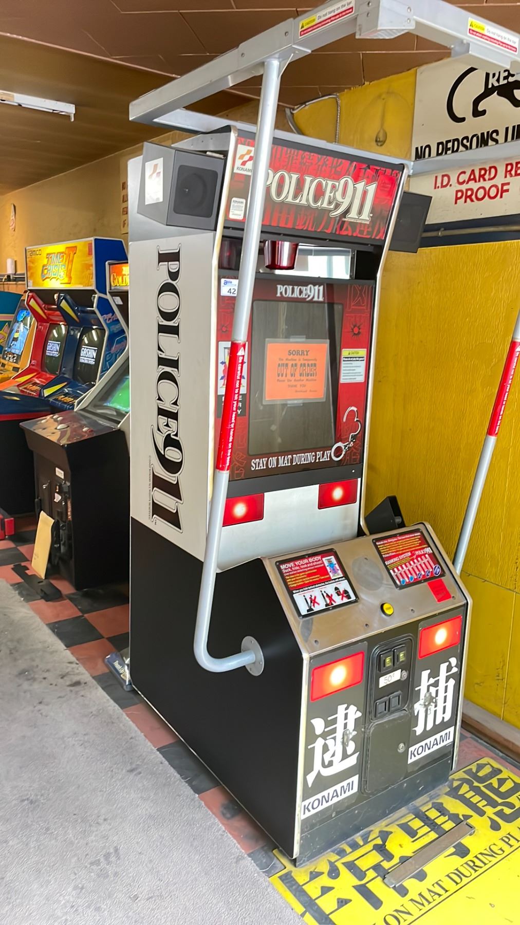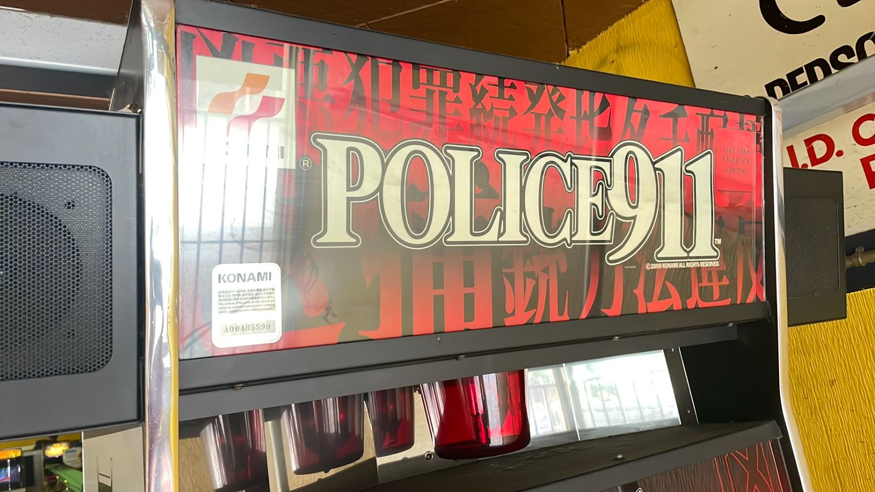 KONAMI POLICE 911 SINGLE PERSON COIN OPERATED UPRIGHT SHOOTER ARCADE GAME IN STOCK CABINET WITH MANUALS *OUT OF ORDER, MISSING GUN, NEEDS REPAIRS*