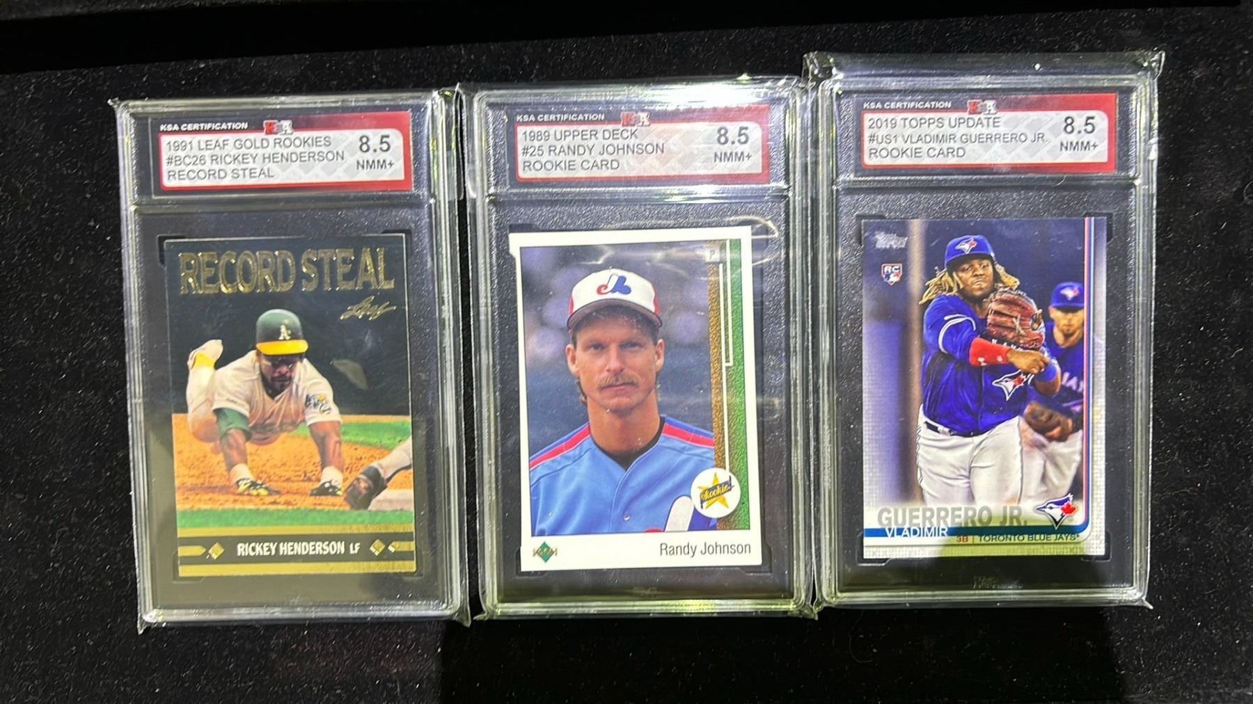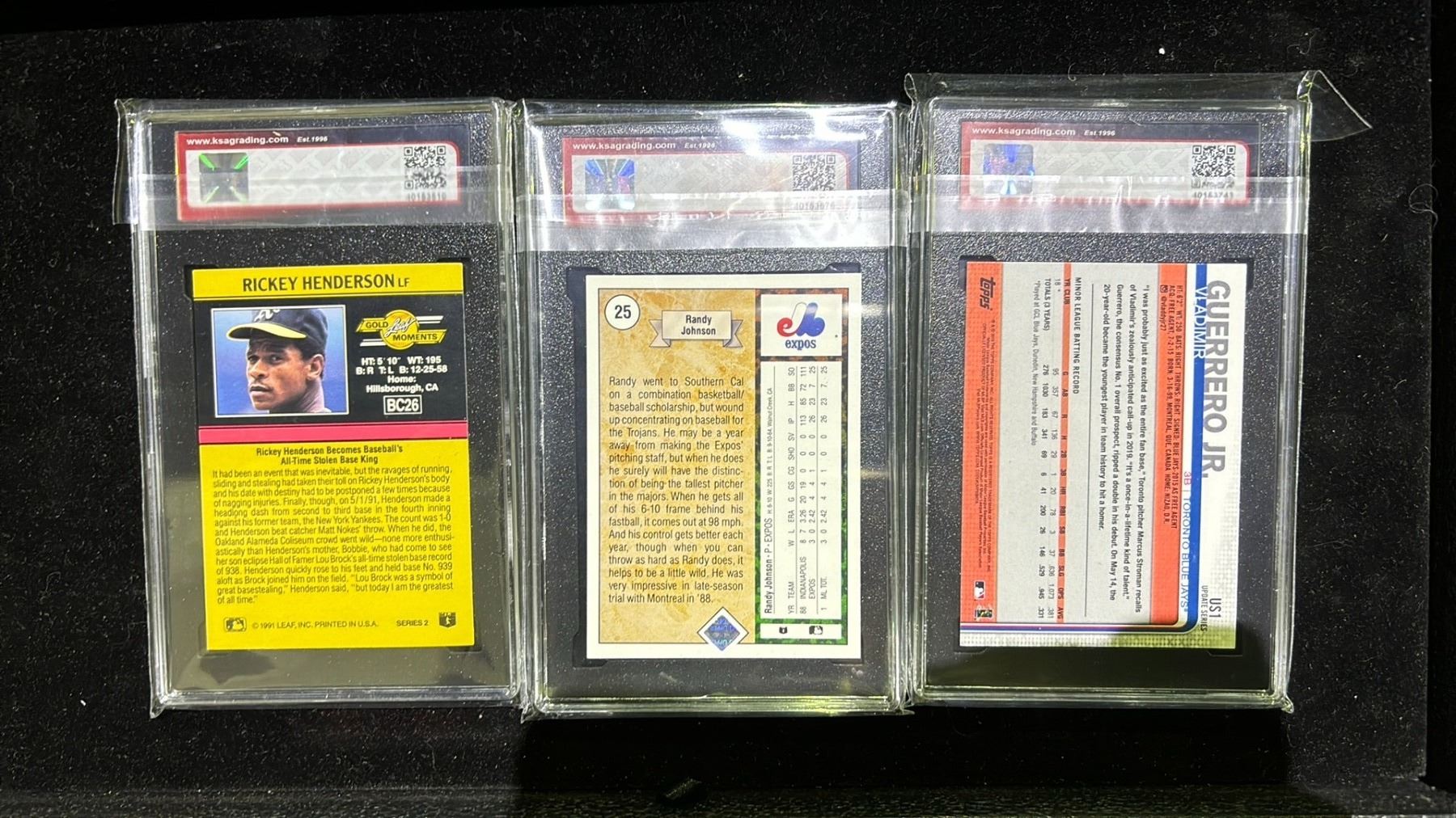 KSA 8.5 1989 UPPER DECK #25 RANDY JOHNSON ROOKIE, KSA 8.5 1991 LEAF GOLD ROOKIES #BC25 RICKEY HENDERSON RECORD STEAL & KSA 2019 TOPPS UPDATE #US1 VLADIMIR GUERRERO JR. ROOKIE CARDS