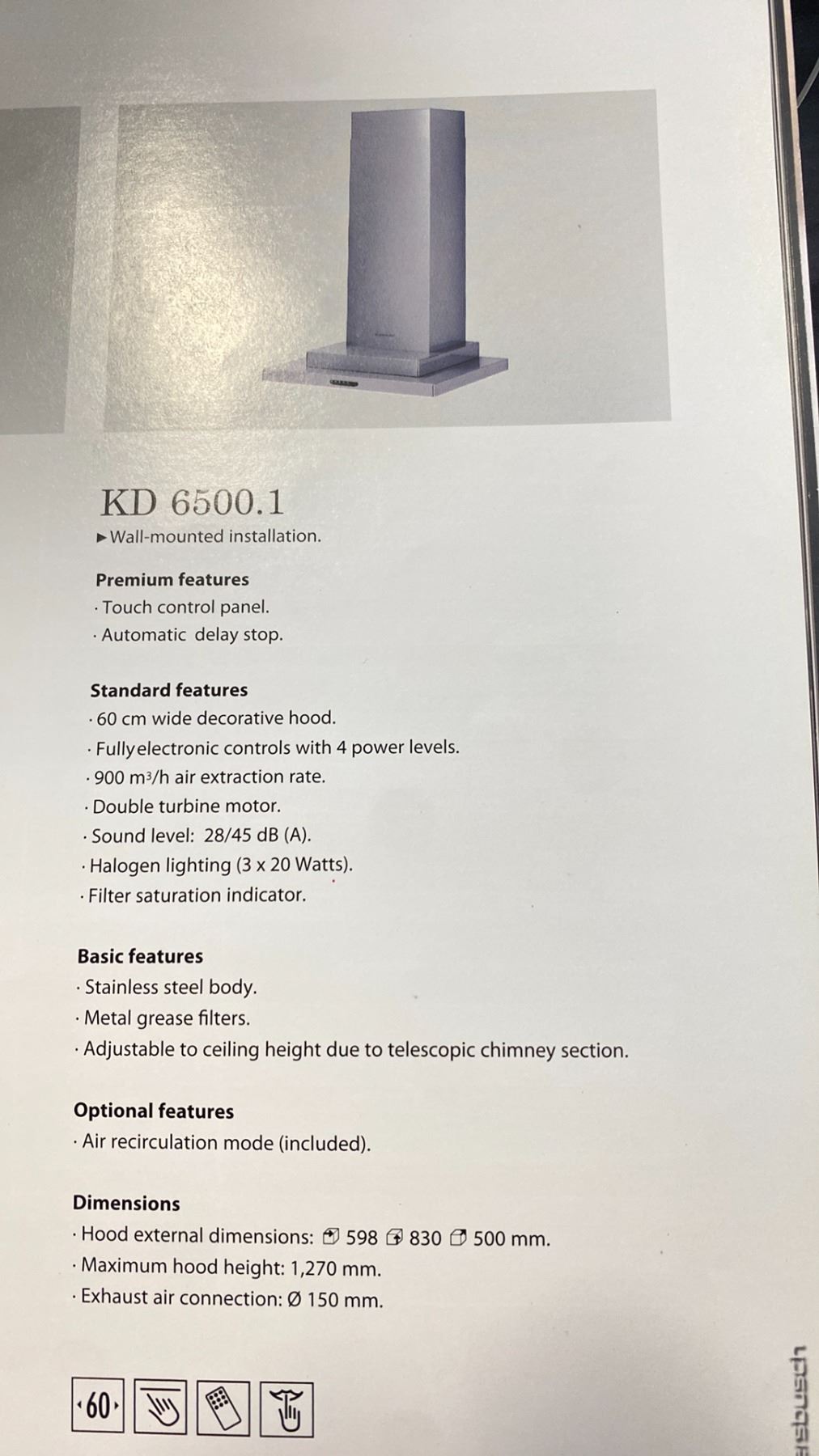 KUPPERSBUSCH KD65000 7 POWER LEVEL HOOD FAN, 725 CFMS, WALL MOUNT HOOD, 23.5"W