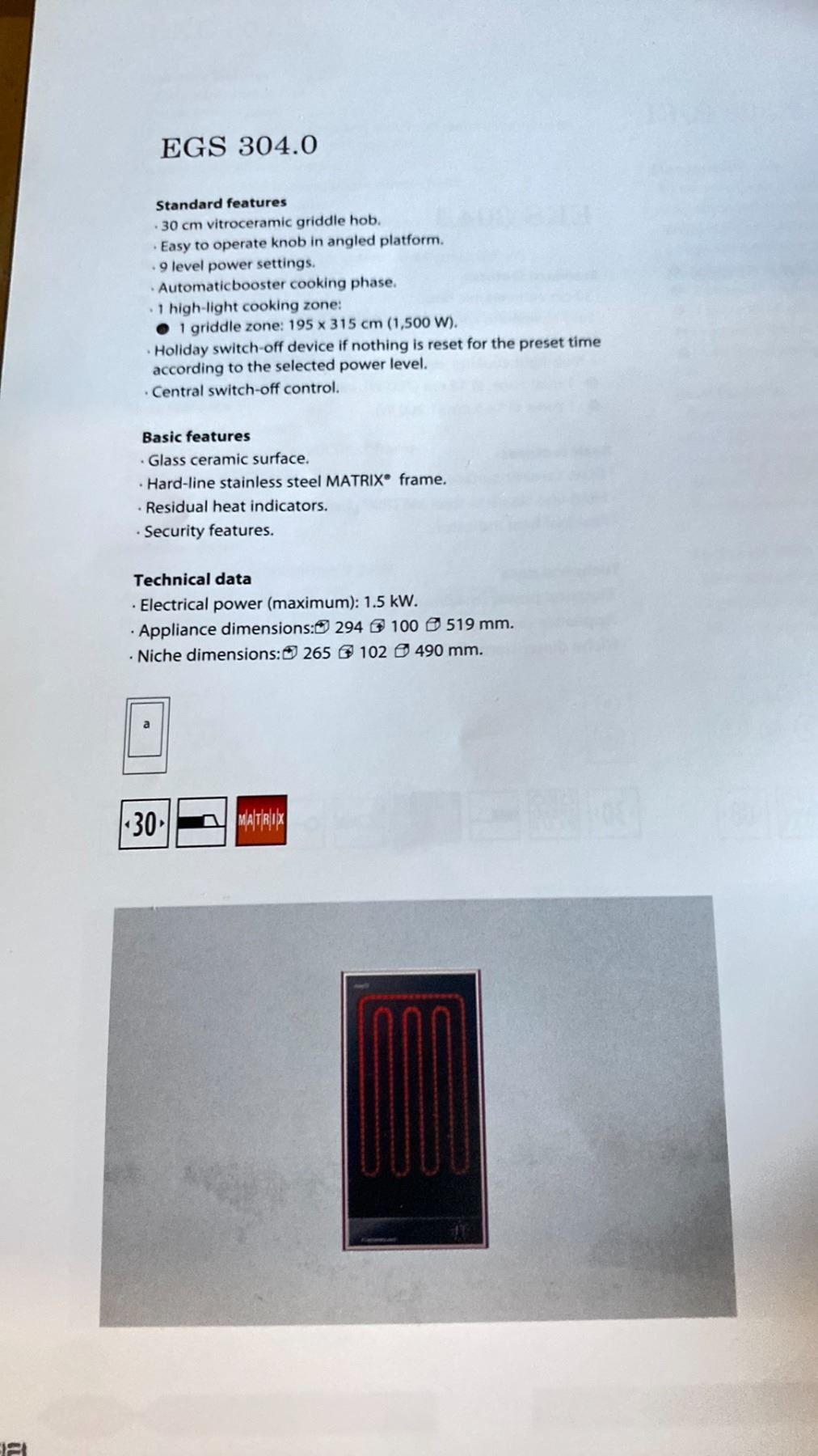 KUPPERSBUSCH MODEL EGS3040 ELECTRIC GRIDDLE CERAN TOP WITH KNOB 11.5"L X 20.5"W X 3.75"D
