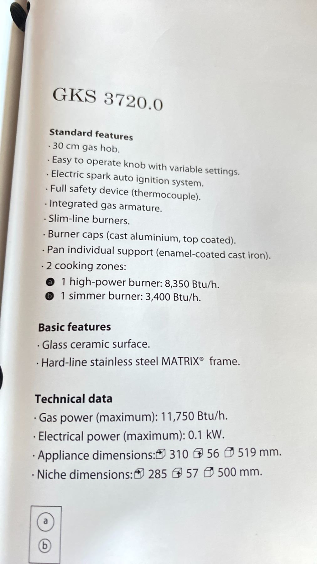 KUPPERSBUSCH MODEL GKS37200M GAS COOKTOP WITH KNOBS CERAN TOP 12"L X 20.5"W X 2.5"D
