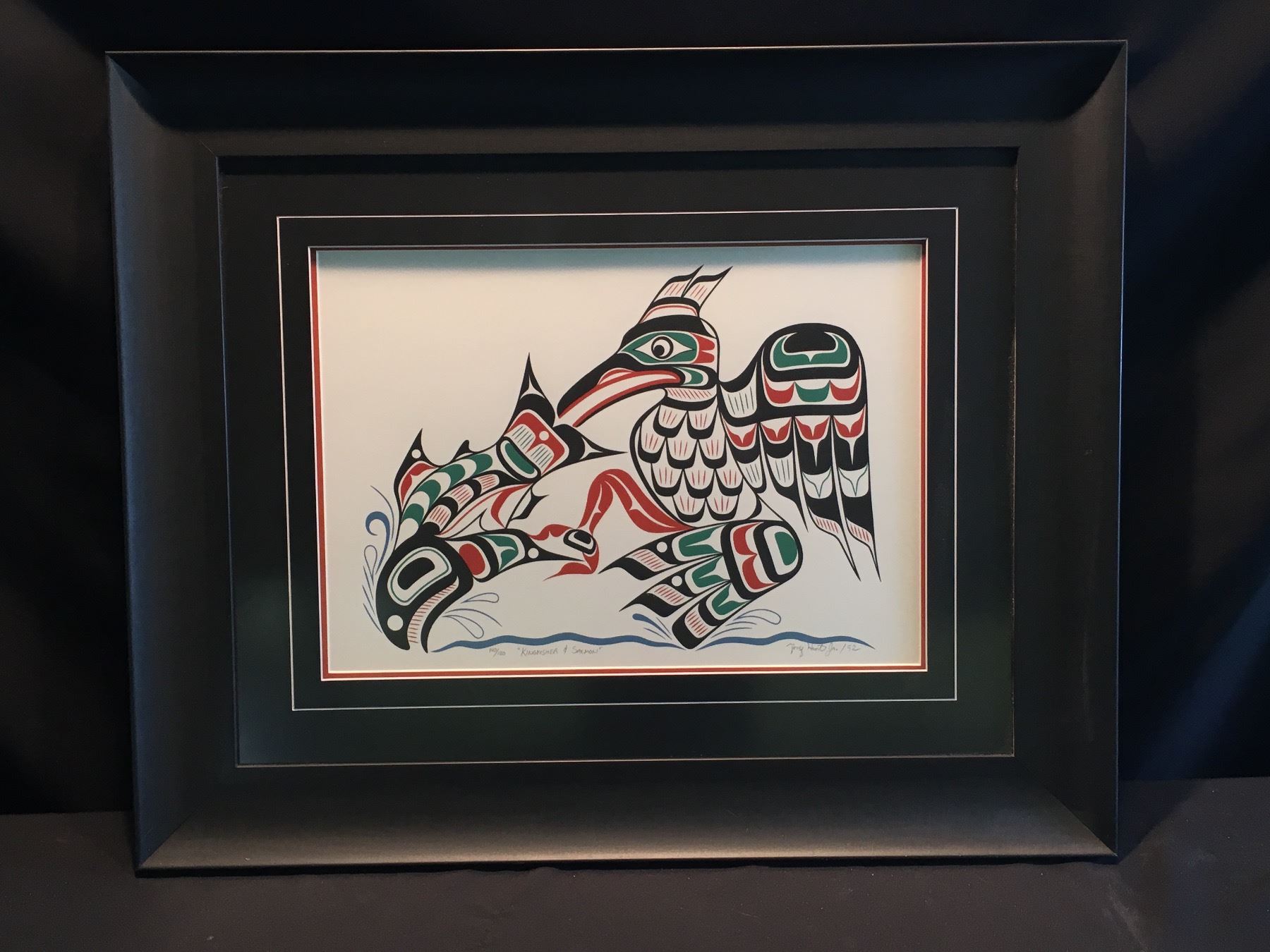 KWAGIULTH ARTIST TONY HUNT JR., FRAMED LIMITED EDITION PRINT, "KINGFISHER & SALMON", 140/180,