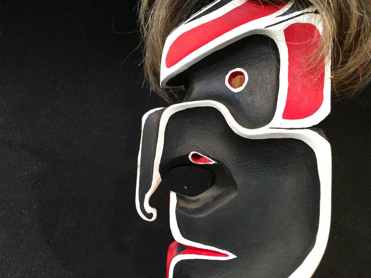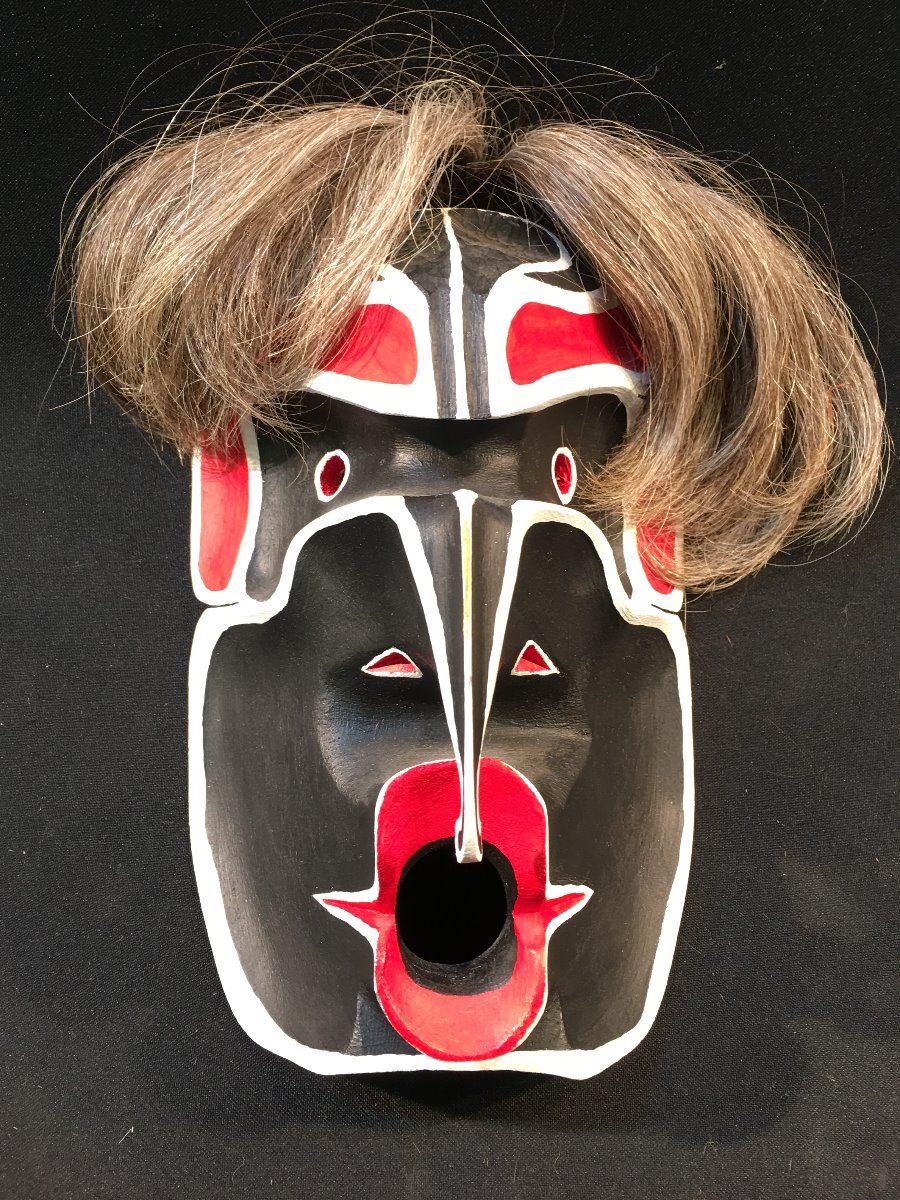 KWAGIUTL DZONOQUA MASK CARVED BY R. DORMAN FROM BELL VILLAGE ISLAND MASK MEASURES: 5.5" WIDE X 8.5" TALL
