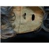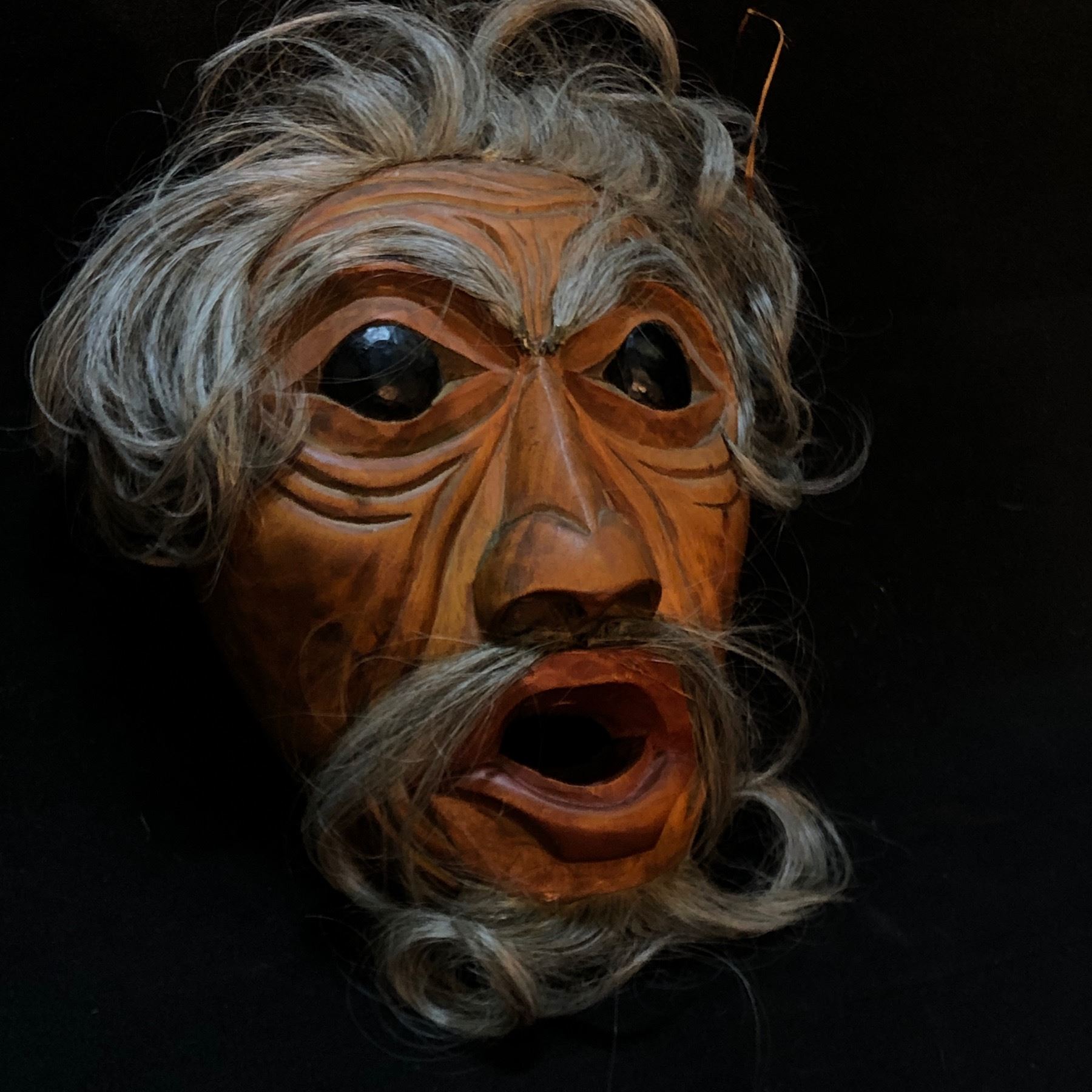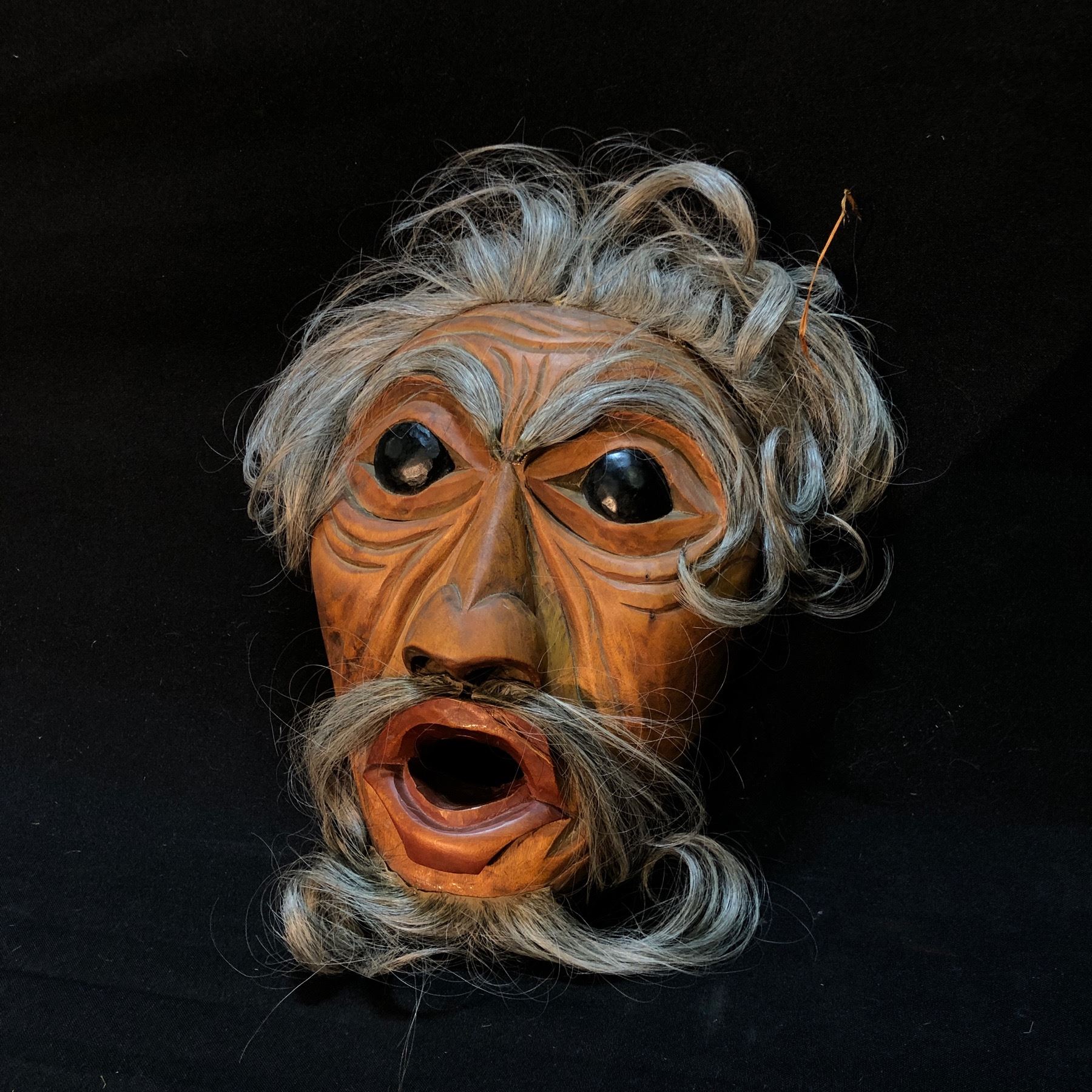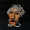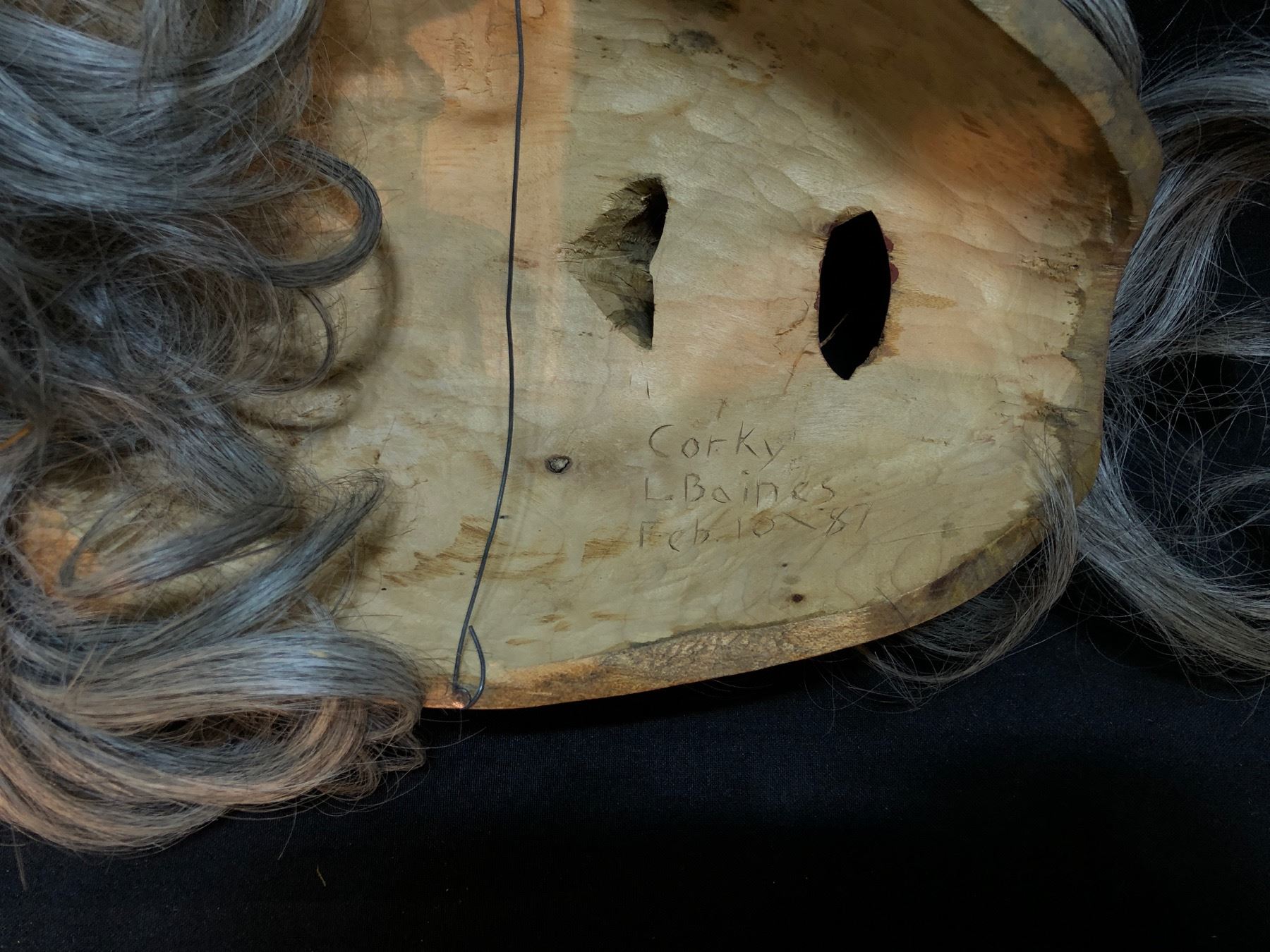 L. BAINES "CORKY" HAND CARVED AND PAINTED PORTRAIT MASK WITH HORSE HAIR ACCENTS, CARVED IN 1987, SIGNED ON BACK BY ARTIST