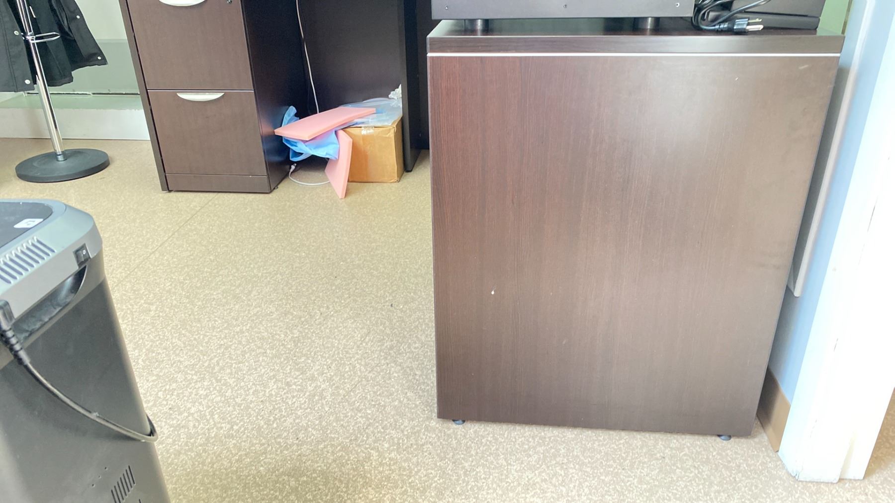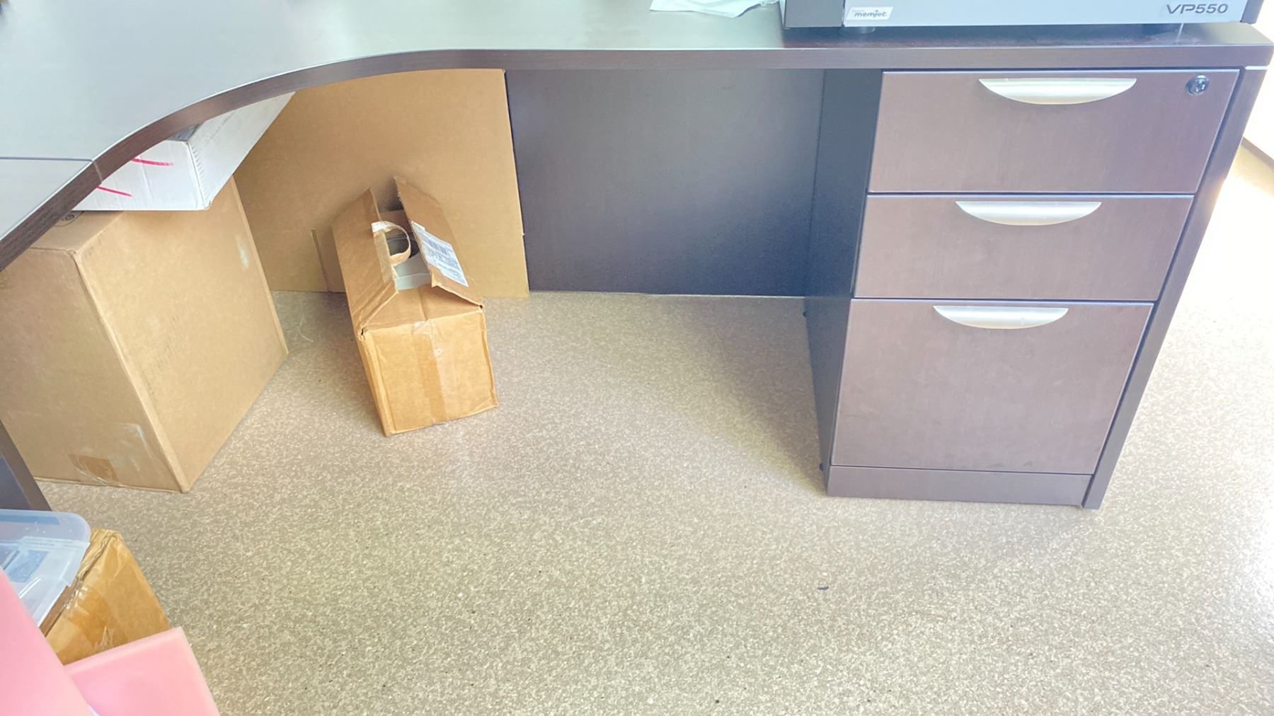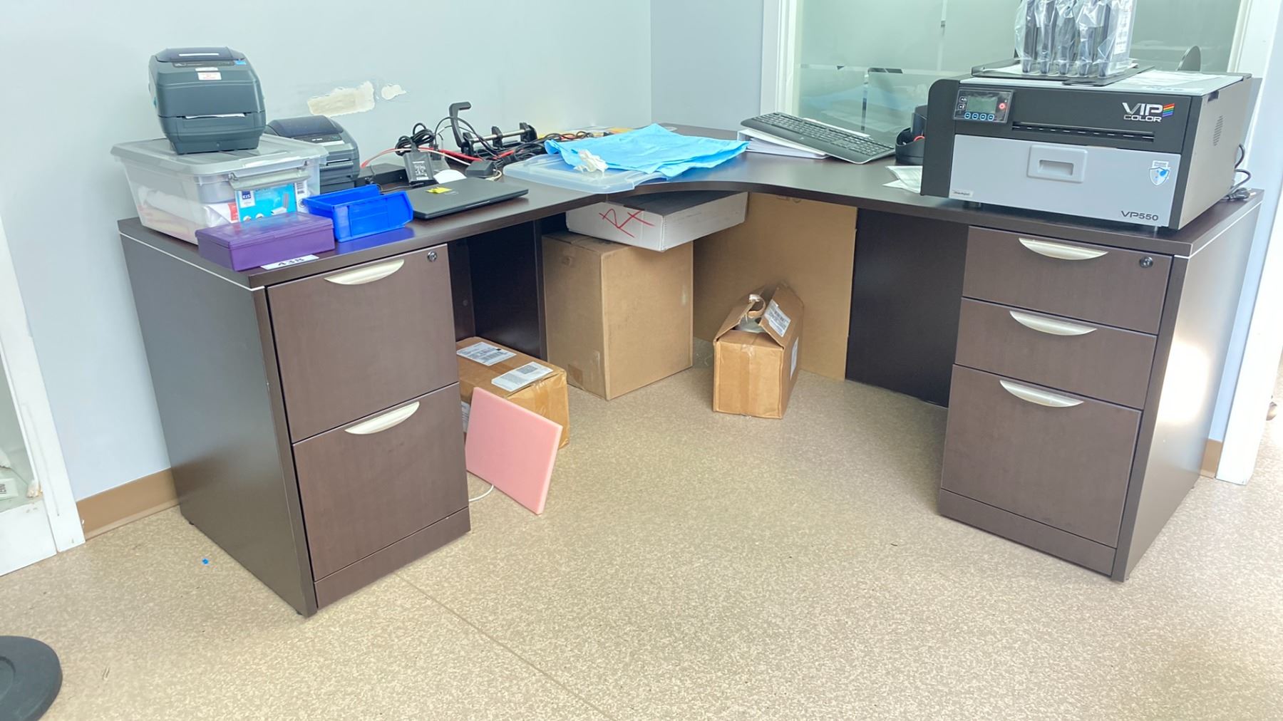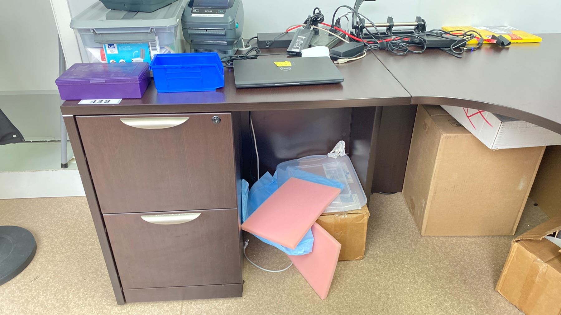 L SHAPED DESK APPROX 5.5 X 5.5' WITH 2 DRAWERS (CONTENTS NOT INCLUDED)