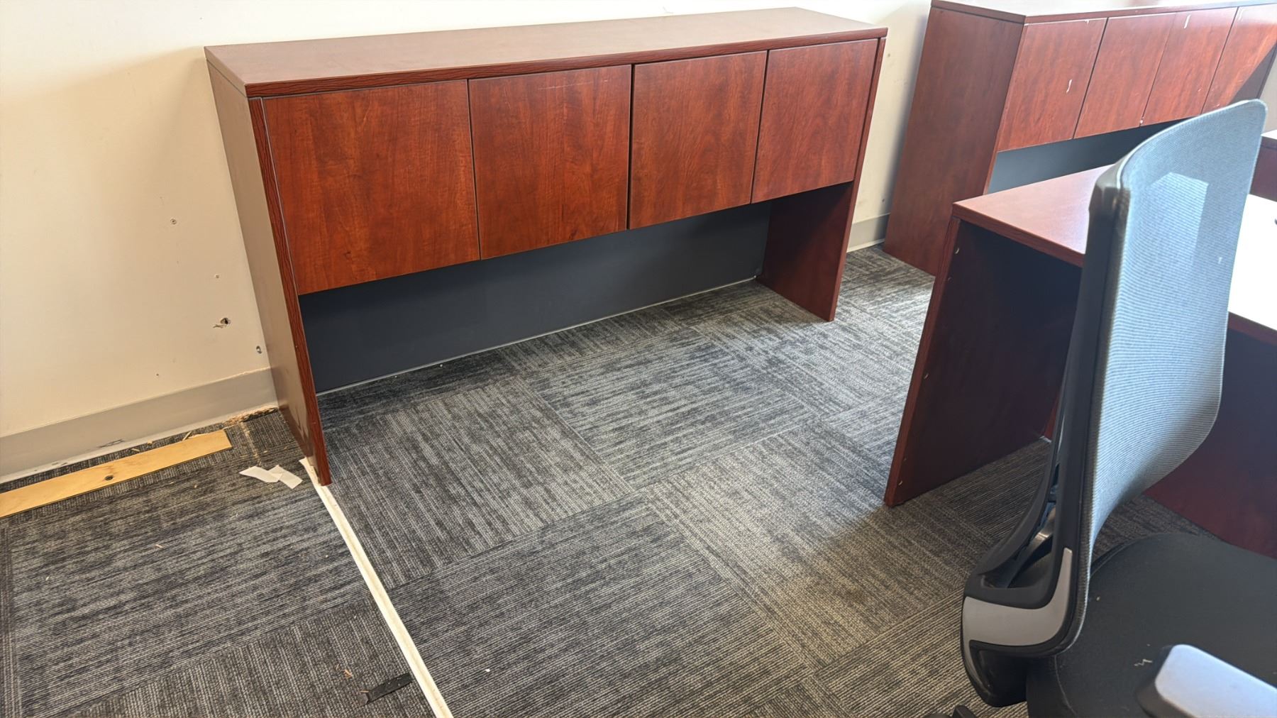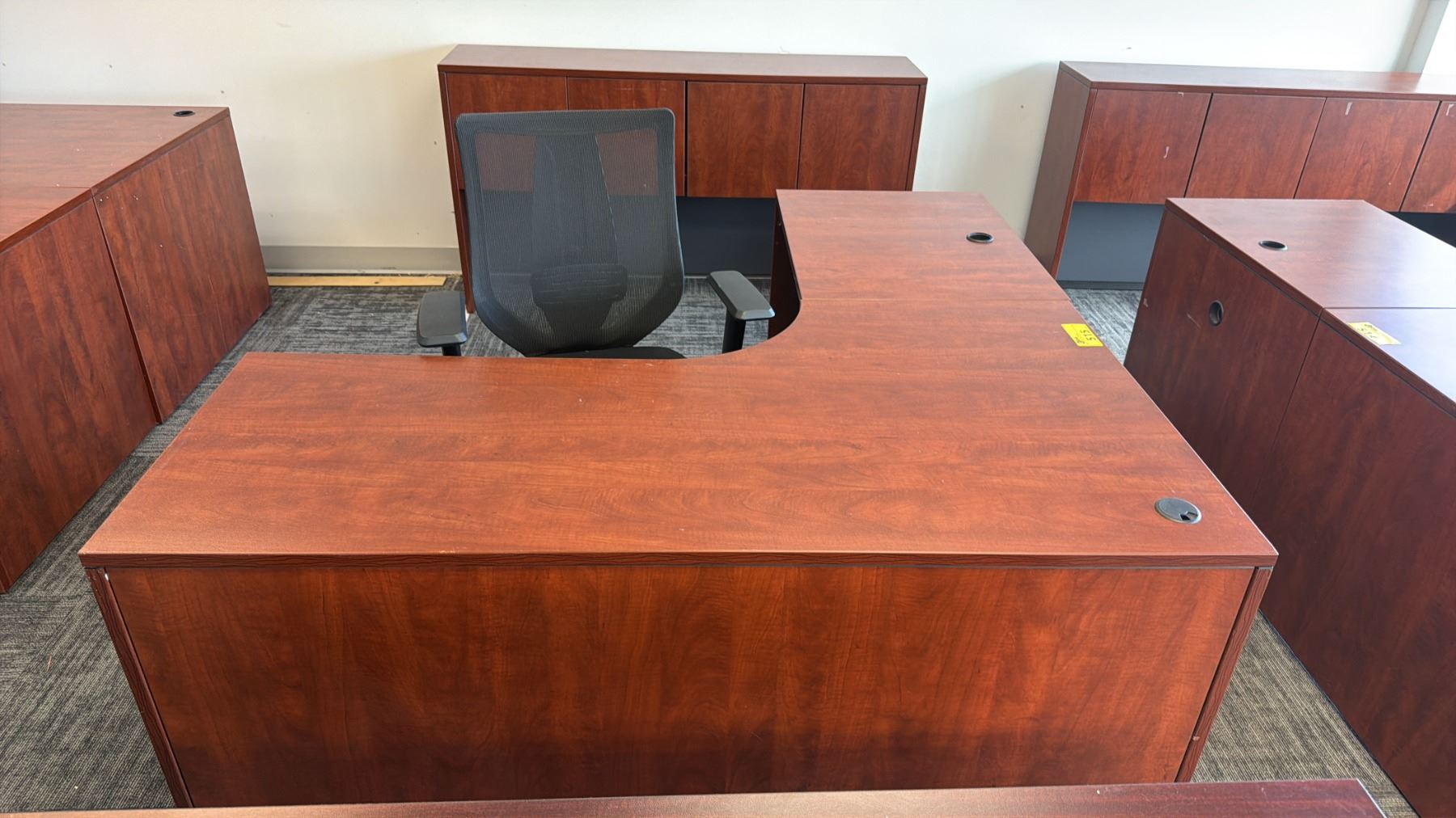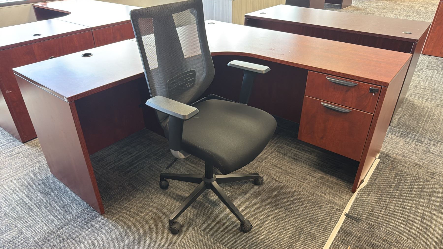 L-SHAPED EXECUTIVE DESK WITH DESK TOP CABINET & ROLLING OFFICE CHAIR