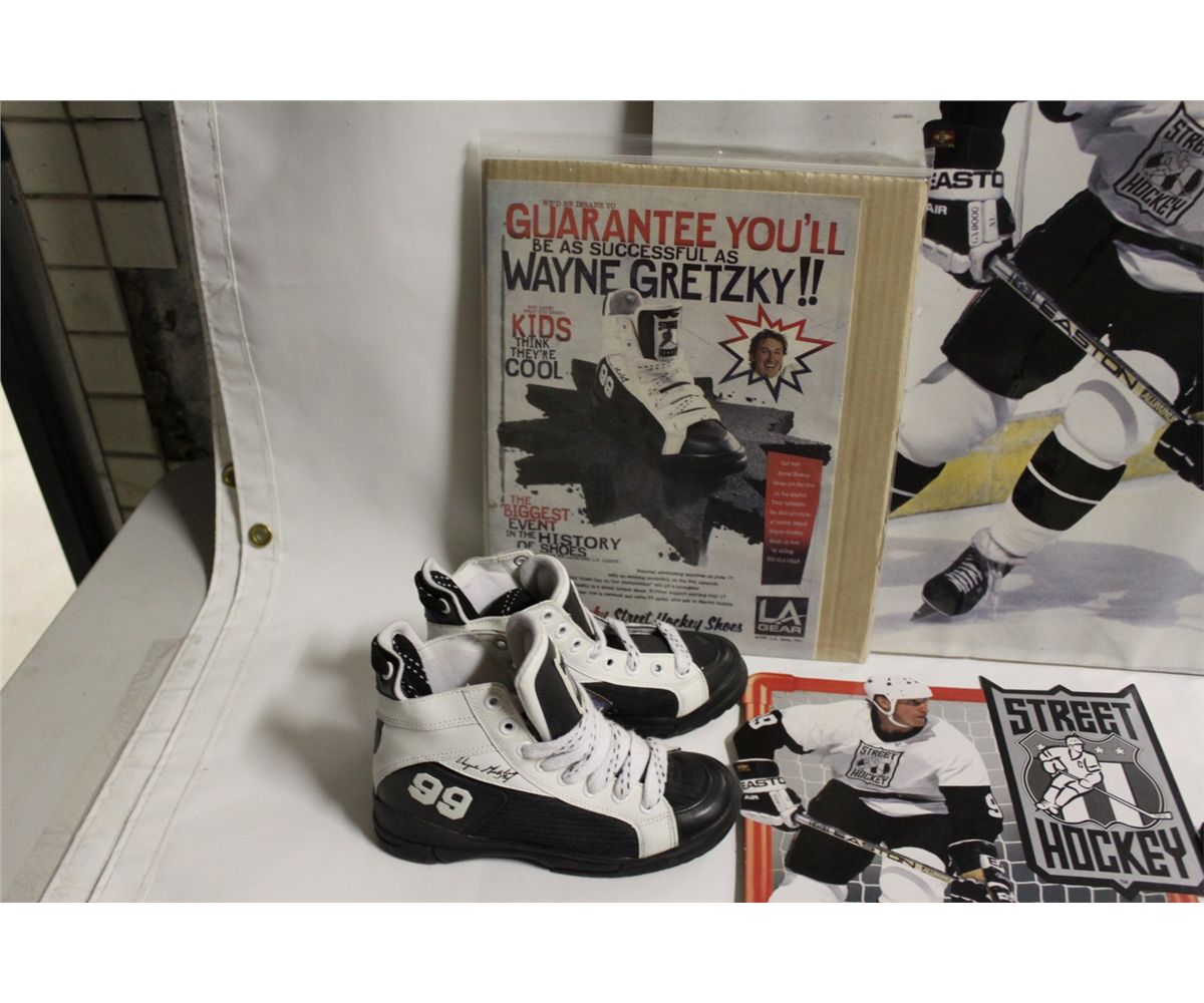 LA GEAR STREET HOCKEY GRETZKY COLLECTOR ITEMS INC.: SIGNED 8.5" X 11" KINGS FOLDER, STREET HOCKEY POSTER, PROMO TOWEL, PAIR OF STREET HOCKEY 99 SHOES AND ADVERTISEMENT